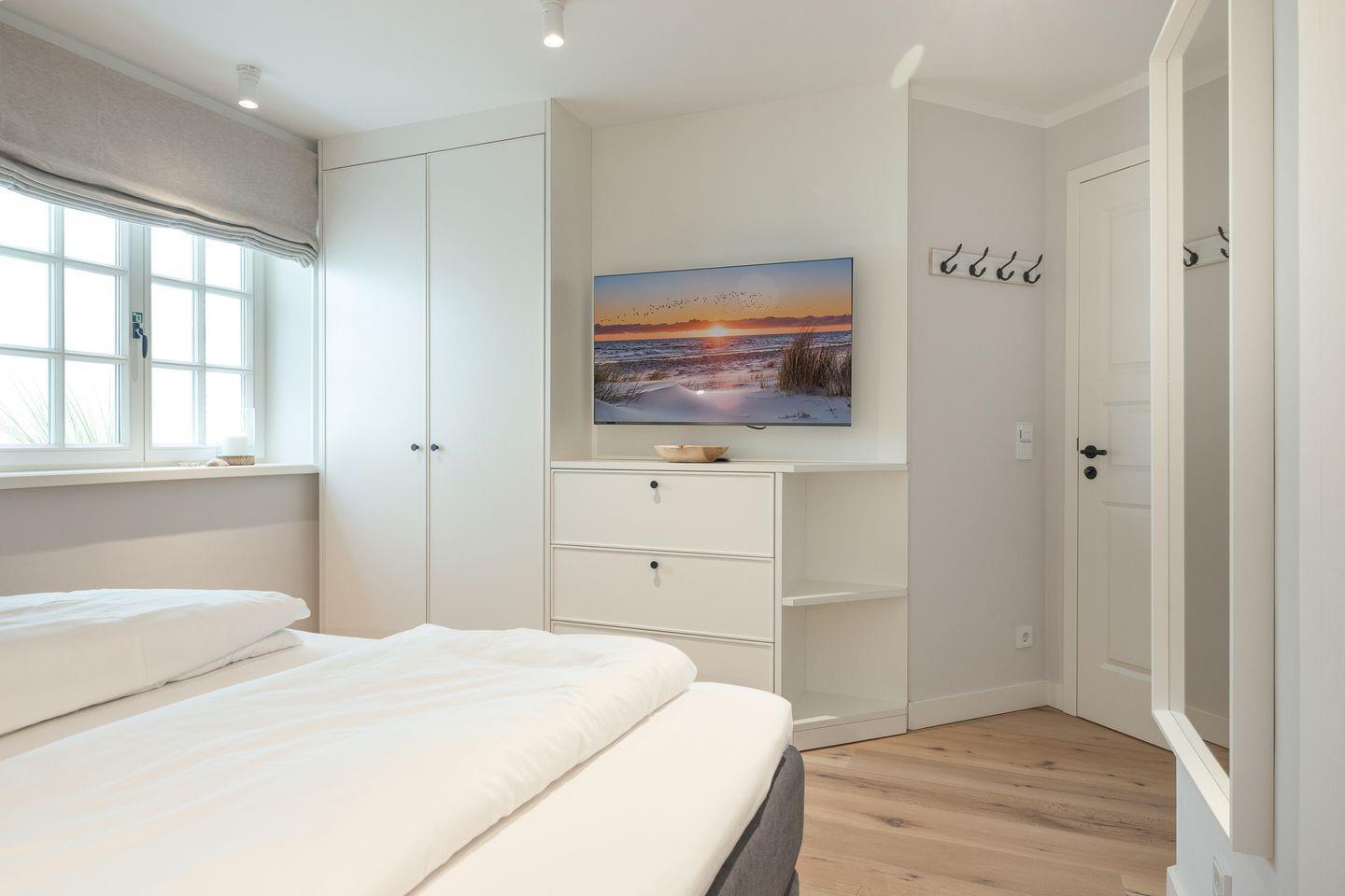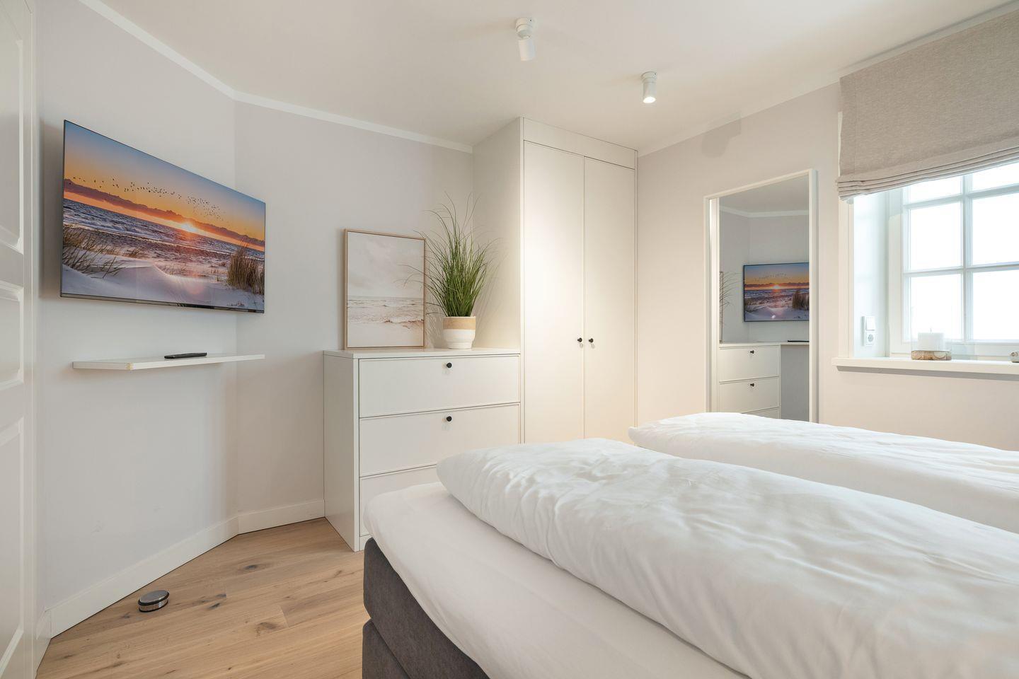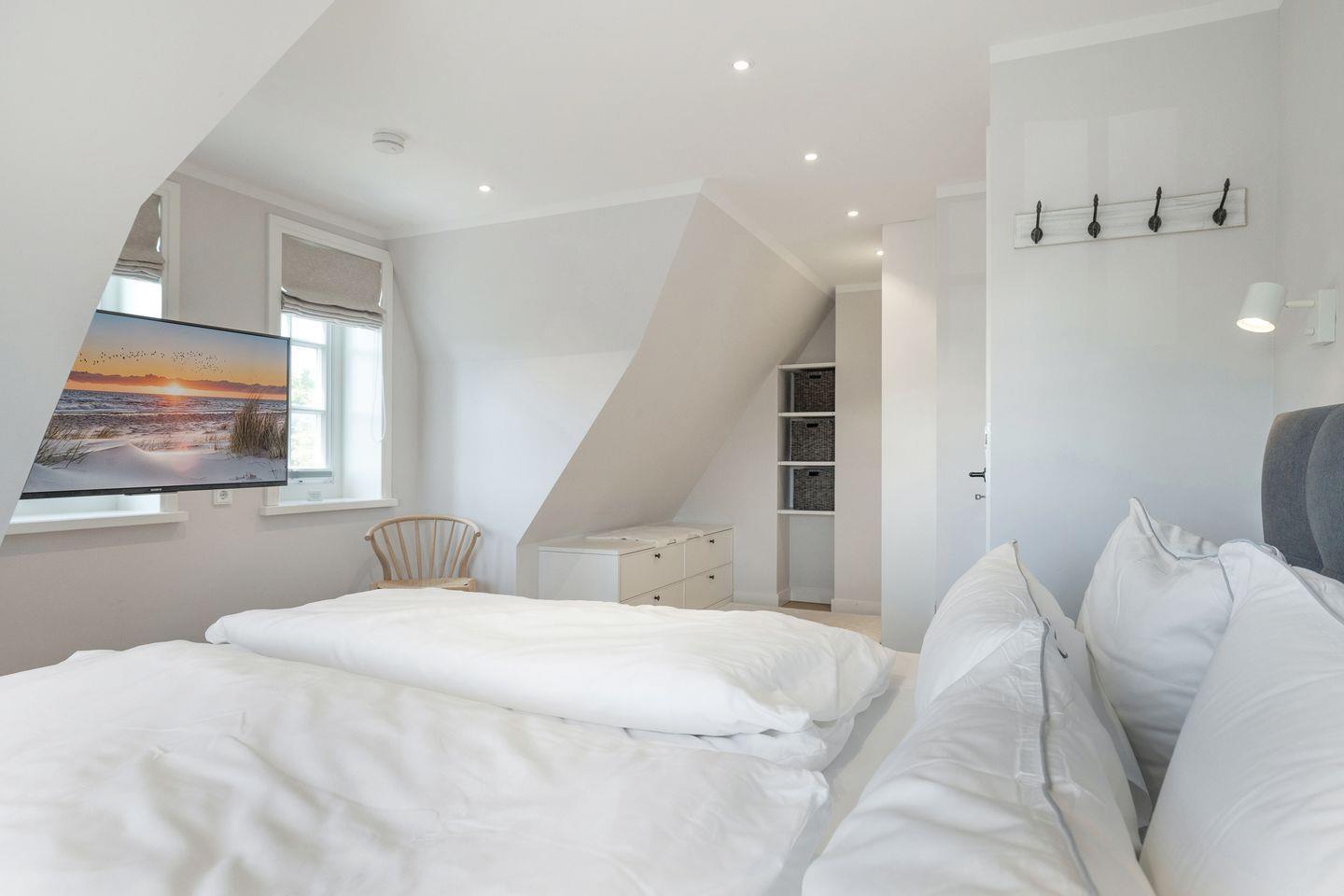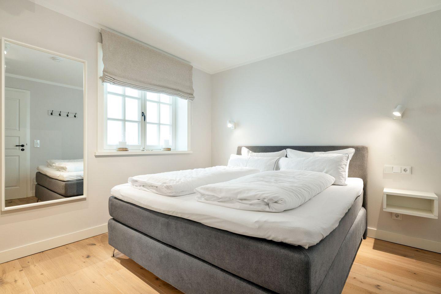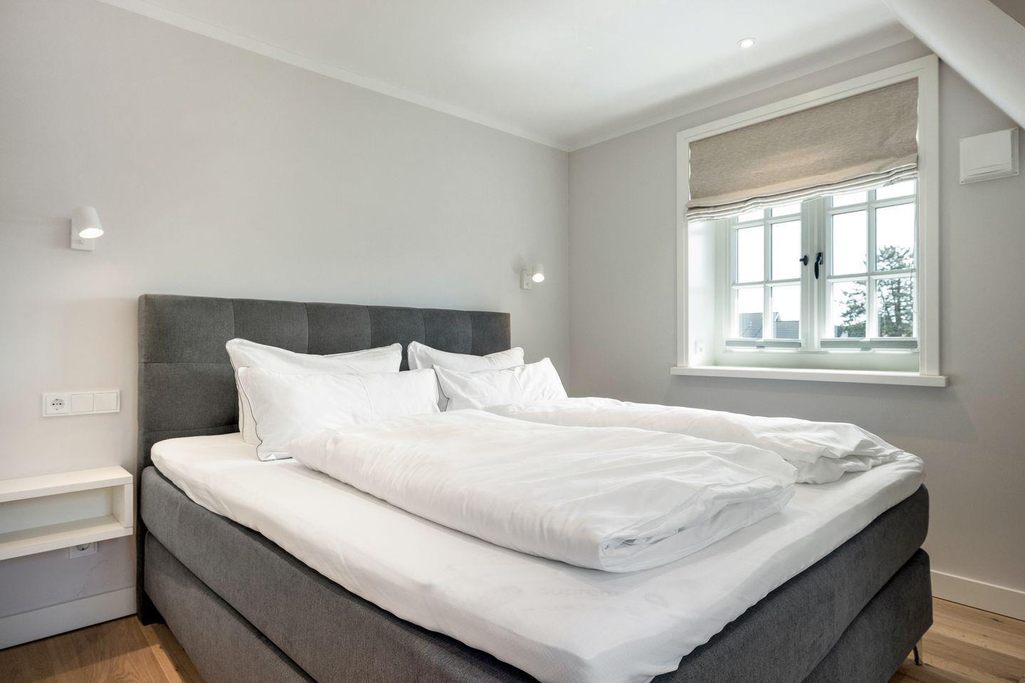 Im Obergeschoss des Hauses erwartet Sie ein Schlafzimmer mit Doppel-Boxspringbett und Flatscreen-TV sowie ein Tageslichtbadezimmer mit großer, offener Dusche und WC. Ein weiteres Stockwerk weiter oben befindet sich noch ein Raum mit gemütlichem, französischem Doppelbett. Im Untergeschoss des Hauses hält das Domizil zwei weitere Räume mit jeweils einem Boxspring-Doppelbett und Flatscreen-TV für Sie bereit. In dem Wellnessbadezimmer mit offener Dusche, großer Sauna und zwei Liegestühlen können Sie auch bei „Sylter Schietwetter“ wunderbar entspannen.