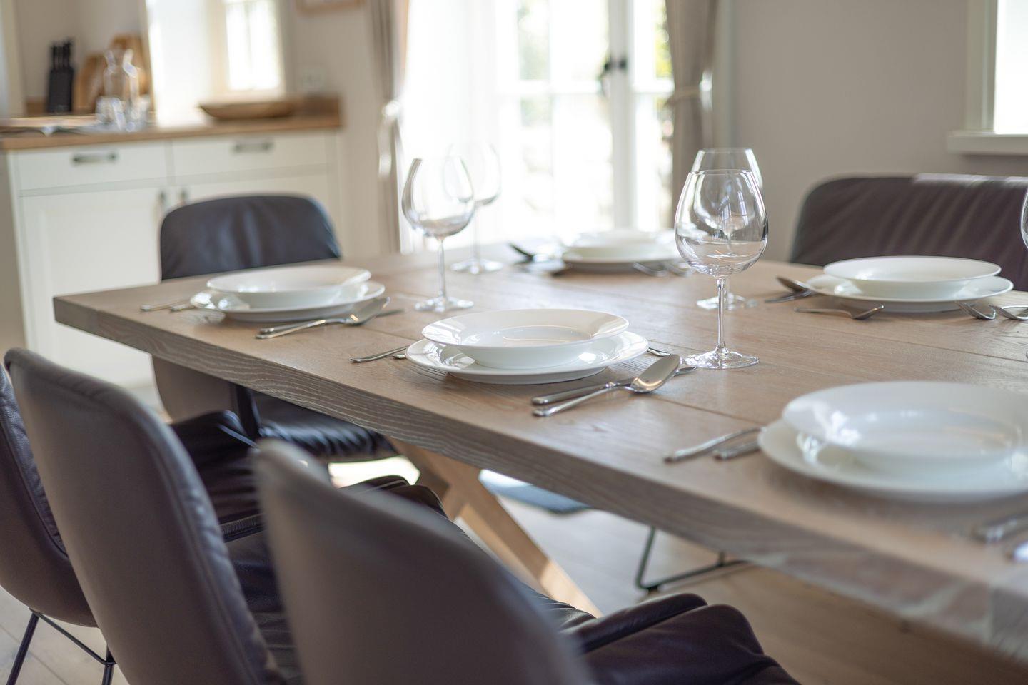 Der Wohnraum des Hauses empfängt Sie mit einer großen Couchlandschaft und einem Gaskamin sowie einem Essbereich für bis zu acht Personen. Die offene Küche bietet Ihnen alles, was Sie für die Zubereitung Ihrer Urlaubsspeisen benötigen. Von hier aus betreten Sie Ihren Garten über zwei verschiedene Terrassen. Auf der großen Grünfläche werden sich die kleinsten Urlauber pudelwohl fühlen, während Sie sich bei einem Kaffee in der Sonne entspannen.
