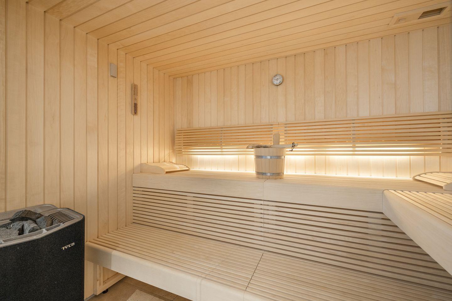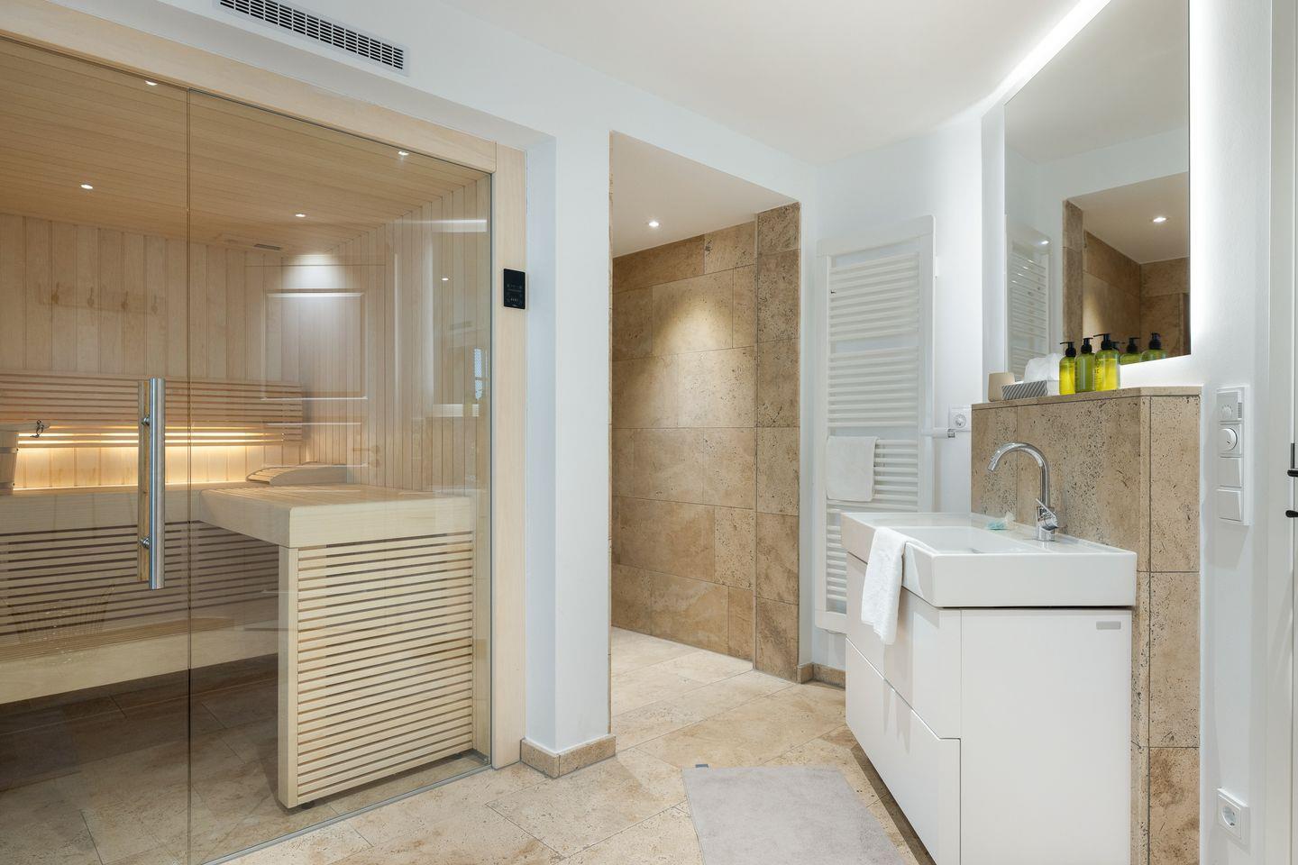 UG: zwei Räume mit Boxspring-Doppelbett (180x200cm) und Flatscreen-TV, Wellnessbad mit offener Dusche, großer Sauna und zwei Liegestühlen