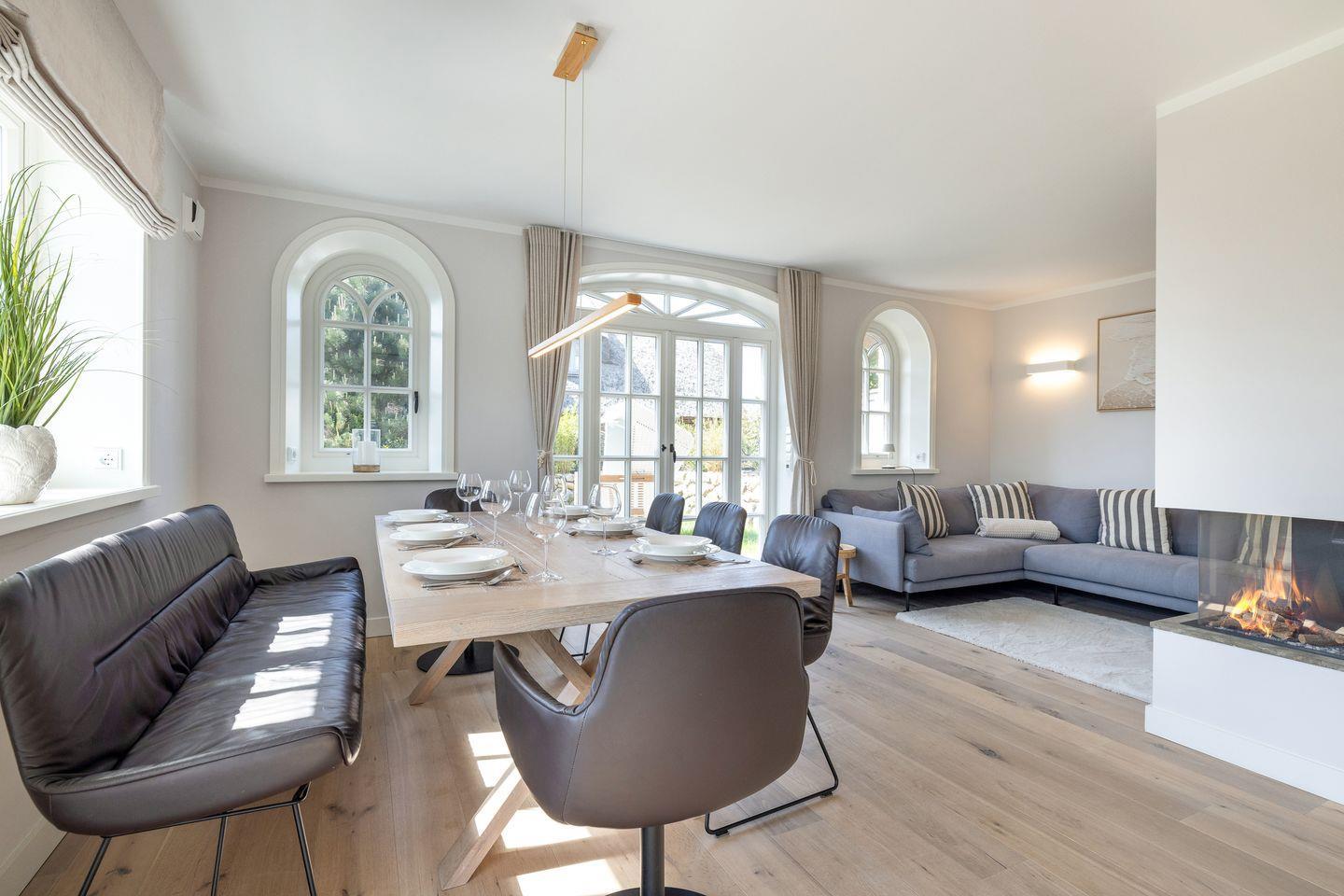 EG: großzügiger Wohnraum mit Essbereich, Gaskamin, Flatscreen-TV, W-LAN, Radio und Bluetooth-Box, offene Küche mit Mikrowelle, Backofen, Induktionsherd, Geschirrspülmaschine, Toaster, Wasserkocher, Nespresso-Maschine und Weinkühlschrank, Gäste-WC, großzügiger Garten mit zwei Terrassen, Gartenmöbeln und zwei Sonnenliegen (möbliert ca. April bis Oktober)