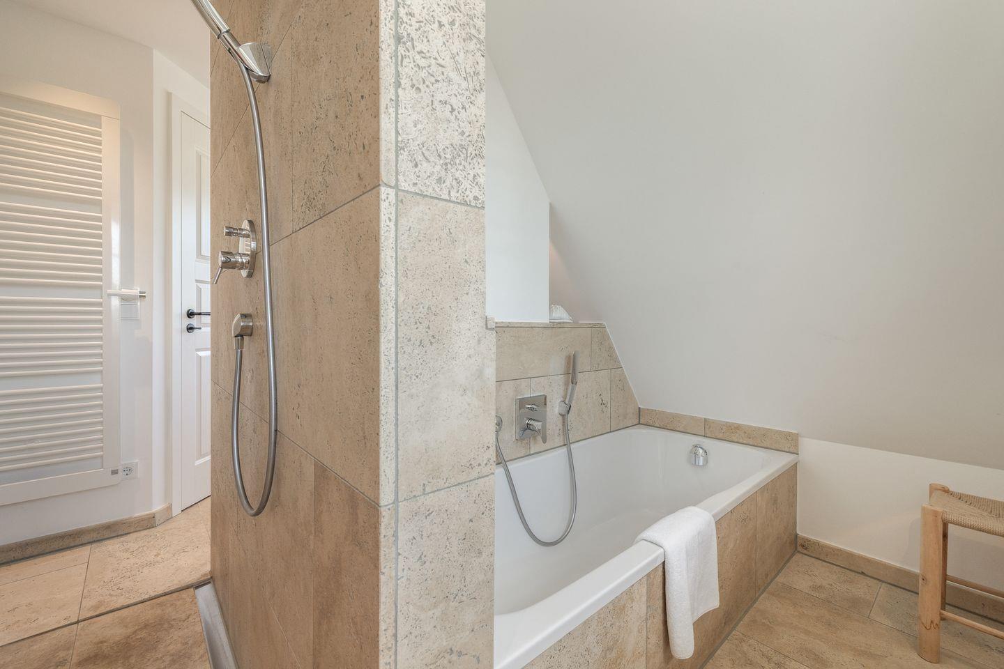 OG: ein Schlafzimmer mit Boxspring-Doppelbett (180x200cm) und Flatscreen-TV, Vollbad mit offener Dusche und Badewanne