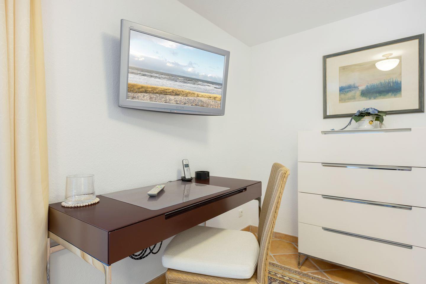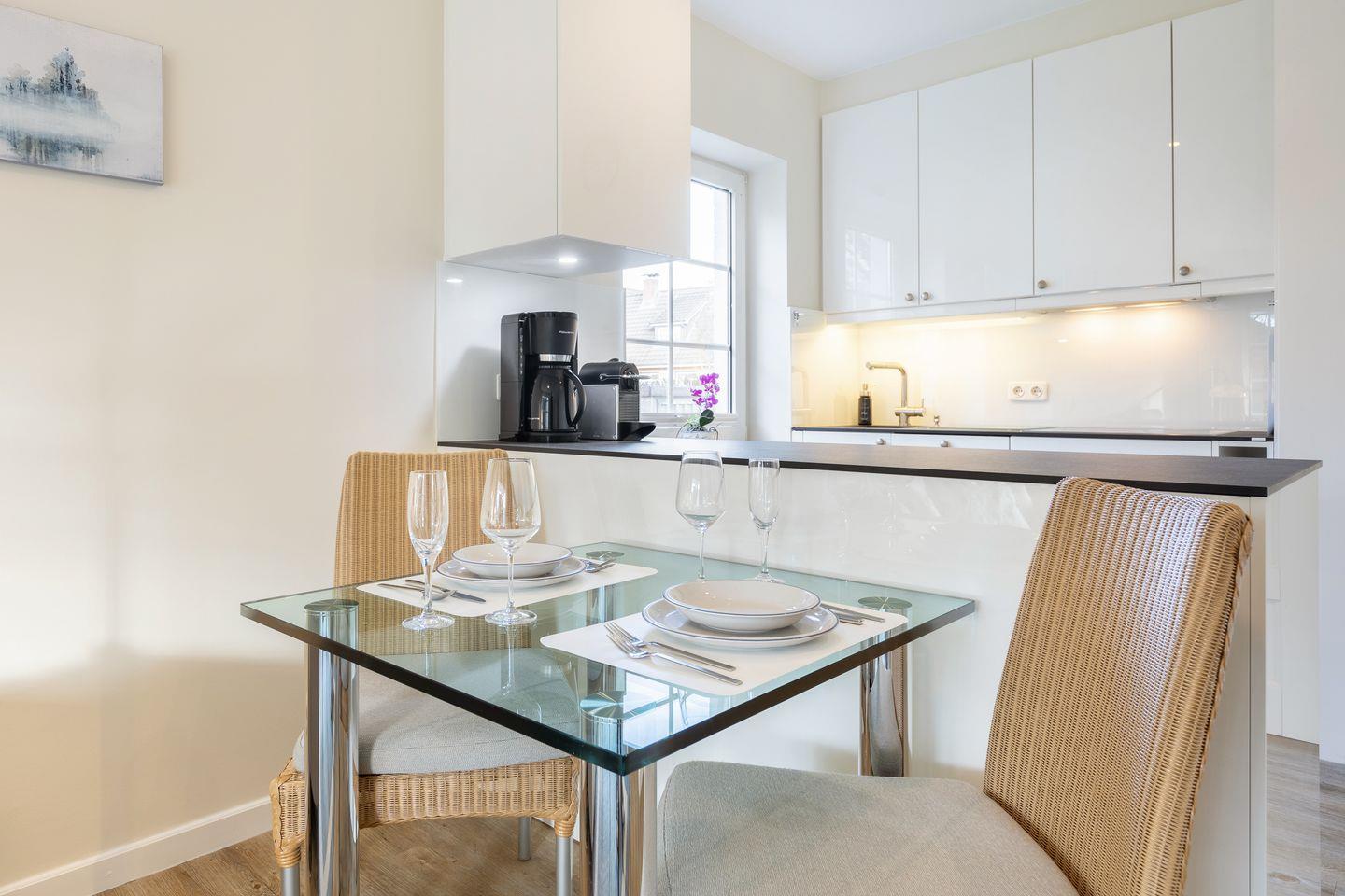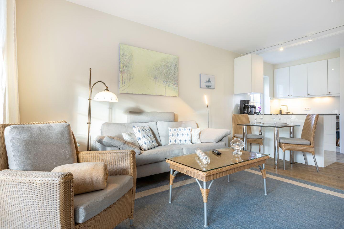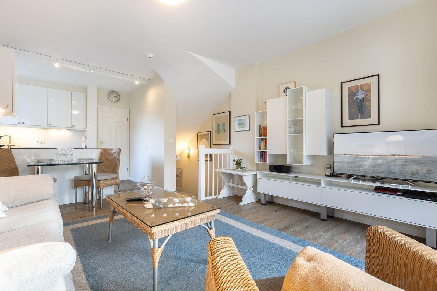 Mit diesem Domizil erwartet Sie ein gemütlich ausgestattetes und liebevoll dekoriertes Appartement in Wenningstedt. Beim Betreten der Wohnung befinden Sie sich direkt im offenen Wohn- und Küchenbereich. Mit einem gemütlichen Couchbereich, einem kleinen Esstisch und der voll ausgestatteten Küche bietet dieses Appartement alles, was Sie für einen perfekten Urlaub zu zweit benötigen. Vom Wohnbereich betreten Sie die geschützte Sonnenterrasse mit XL-Strandkorb, in dem Sie die Sonnenstunden der Insel ungestört genießen können.
