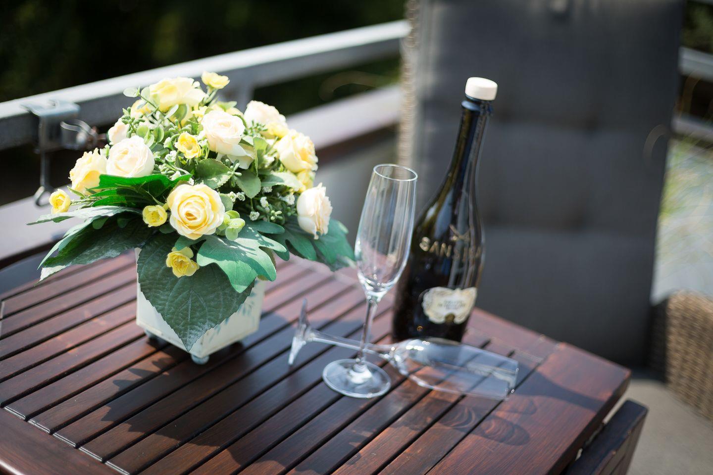 Ein weiteres Highlight ist der Südbalkon, auf dem Sie bei einer Tasse Kaffee oder einem Glas Wein den Tag in Ruhe genießen können. Die gemütlichen Gartenmöbel laden zu entspannten Stunden im Freien ein.