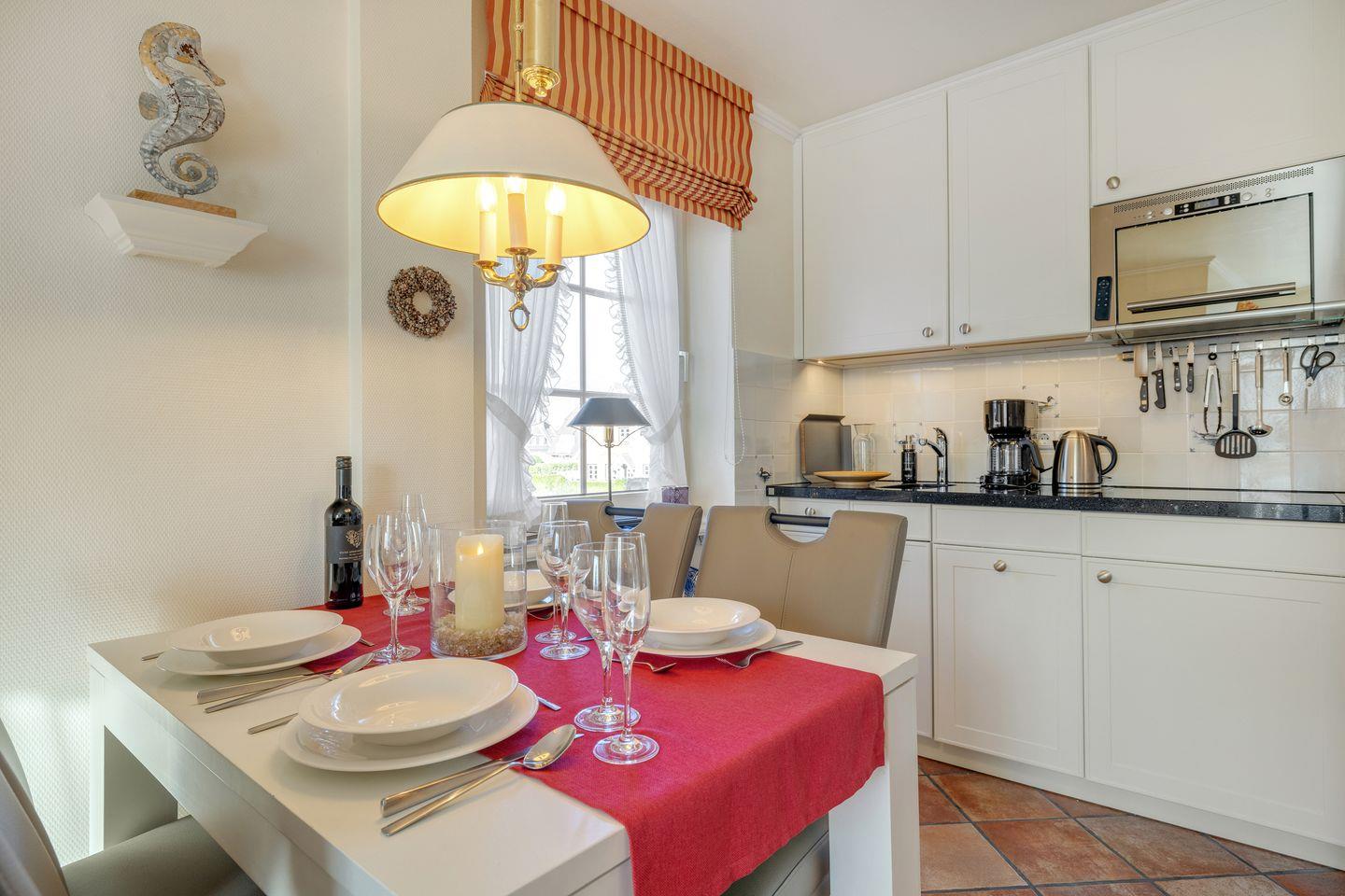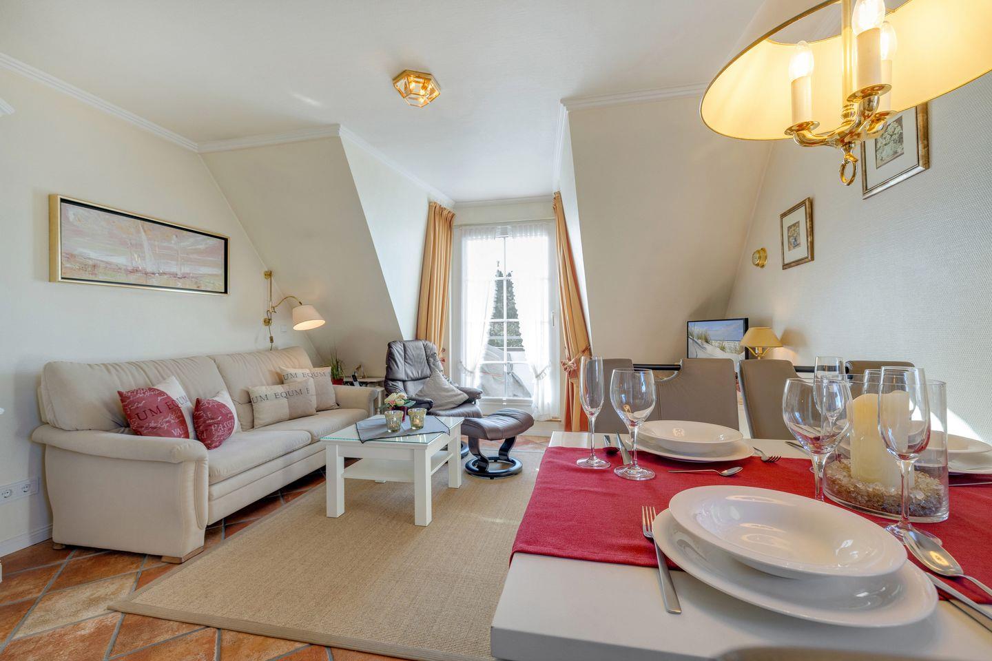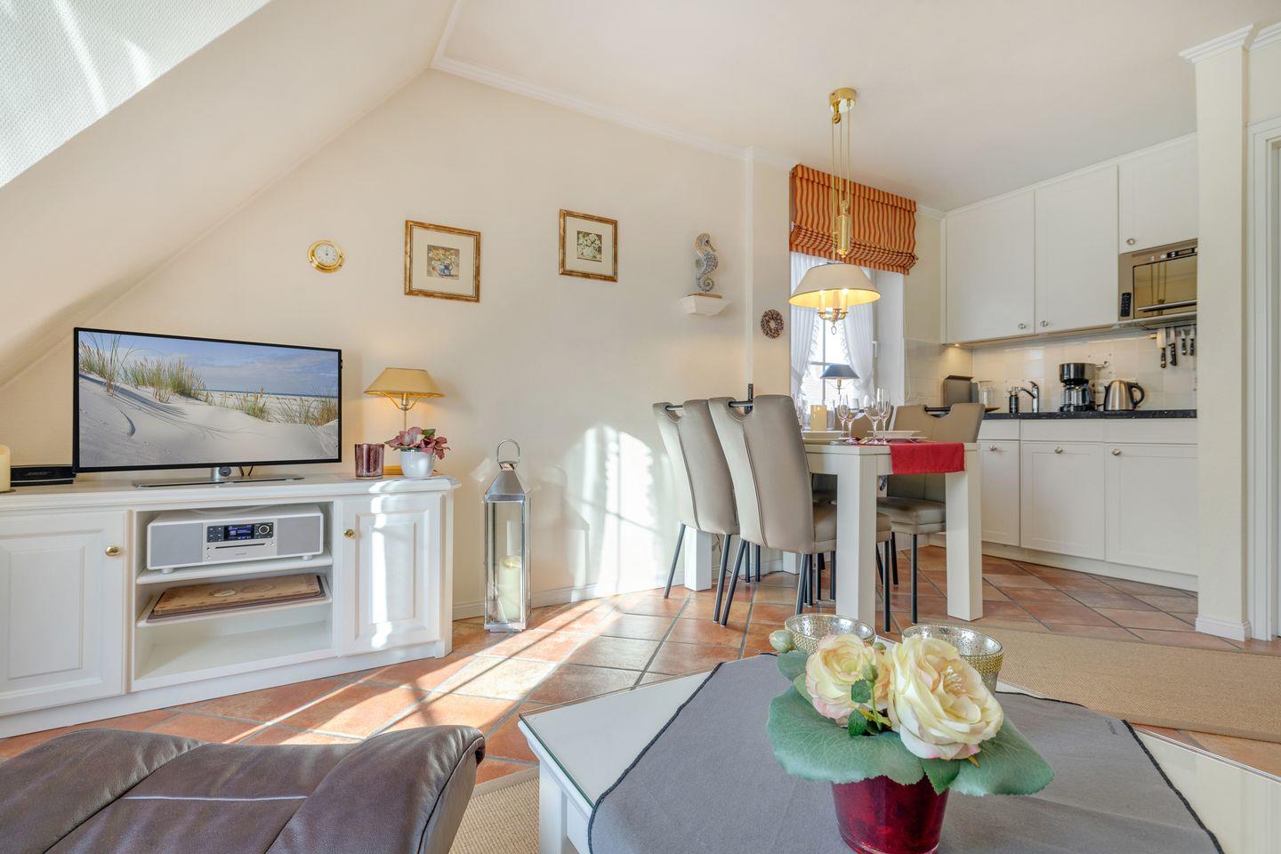 Die Wohnung überzeugt durch ein offenes und einladendes Wohnkonzept. Der helle Wohnbereich verfügt über eine bequeme Sofaecke und einen Sessel, die zum Verweilen und Entspannen einladen. Genießen Sie moderne Unterhaltung durch zwei digitale Fernseher, die Ihnen die Möglichkeit bieten, nach einem aufregenden Tag am Strand einen Filmabend zu gestalten. Das gemütliche Wohnzimmer öffnet sich zur voll ausgestatteten Küche, die keine Wünsche offenlässt. Hier finden Sie einen Herd, einen Geschirrspüler, eine Mikrowelle und alles nötige Küchenzubehör, um köstliche Mahlzeiten zuzubereiten. Gemeinsam am Esstisch speisen und lachen – das ist der perfekte Weg, um den Tag ausklingen zu lassen.