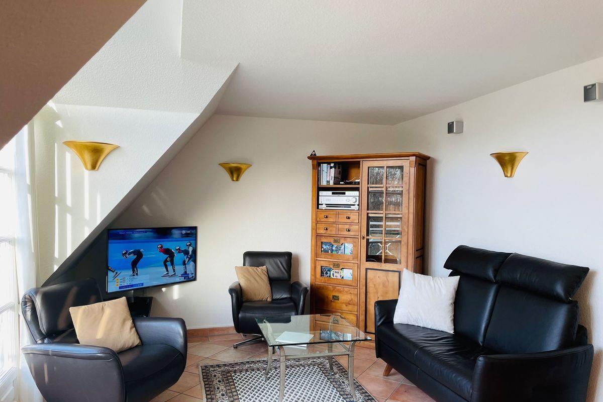 Obergeschoss: geschmackvoll möblierter Wohnraum im eleganten Kolonialstil. Erleben Sie Fernsehen der neuesten Generation: Ultra High Definition TV mit BluRay-Player und Dolby-Sound-System, Telefon, Drucker mit Airprint. Schöne separate Küche mit Geschirrspüler, Nespressomaschine, Backofen mit Microwelle sowie kombinierter Waschmaschine/Trockner.