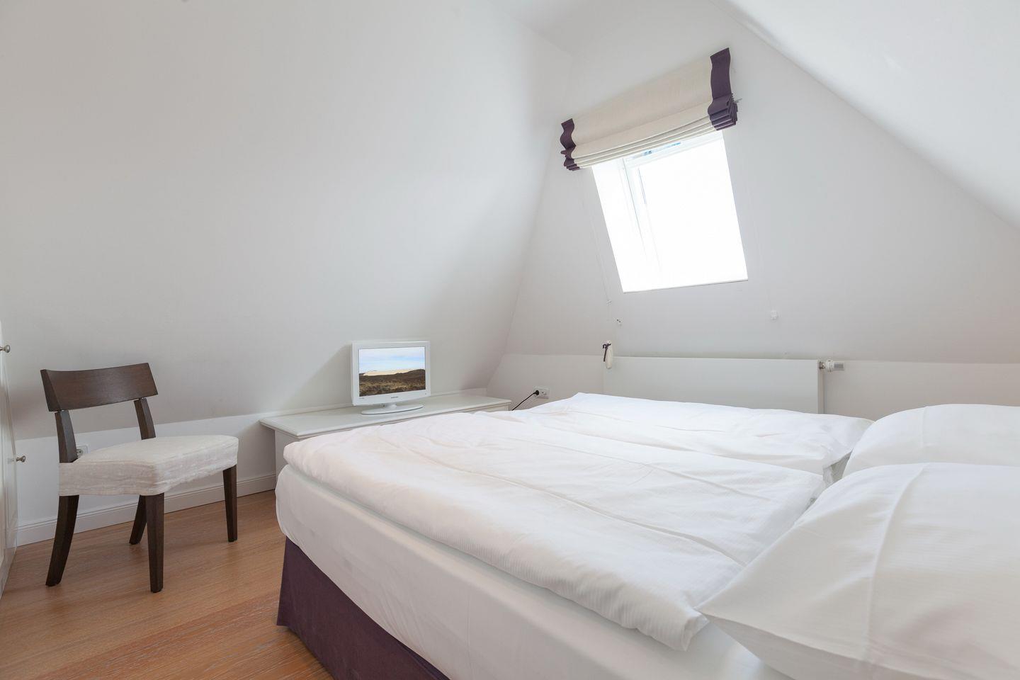 DG: ein heller Raum mit Luxus-Doppelbett (Marke "Treca", ca. 1,6x2m) und TV.