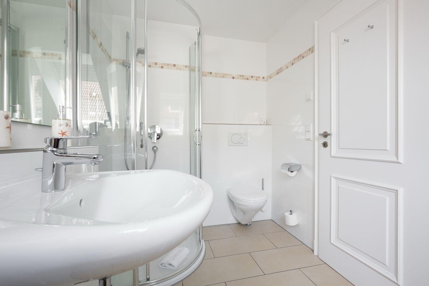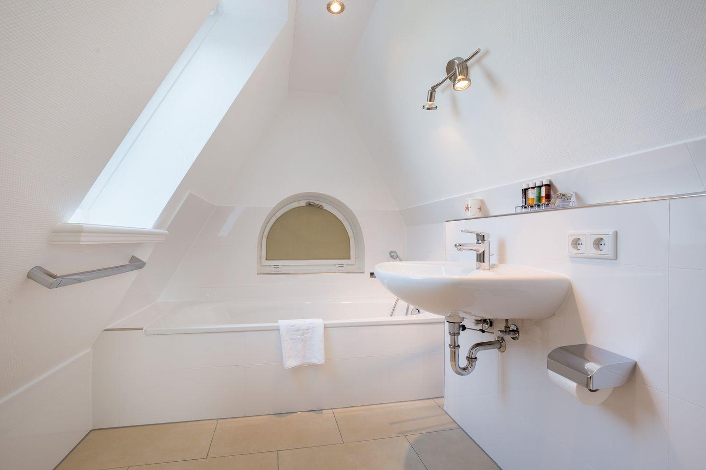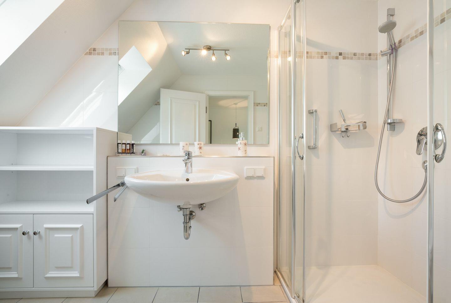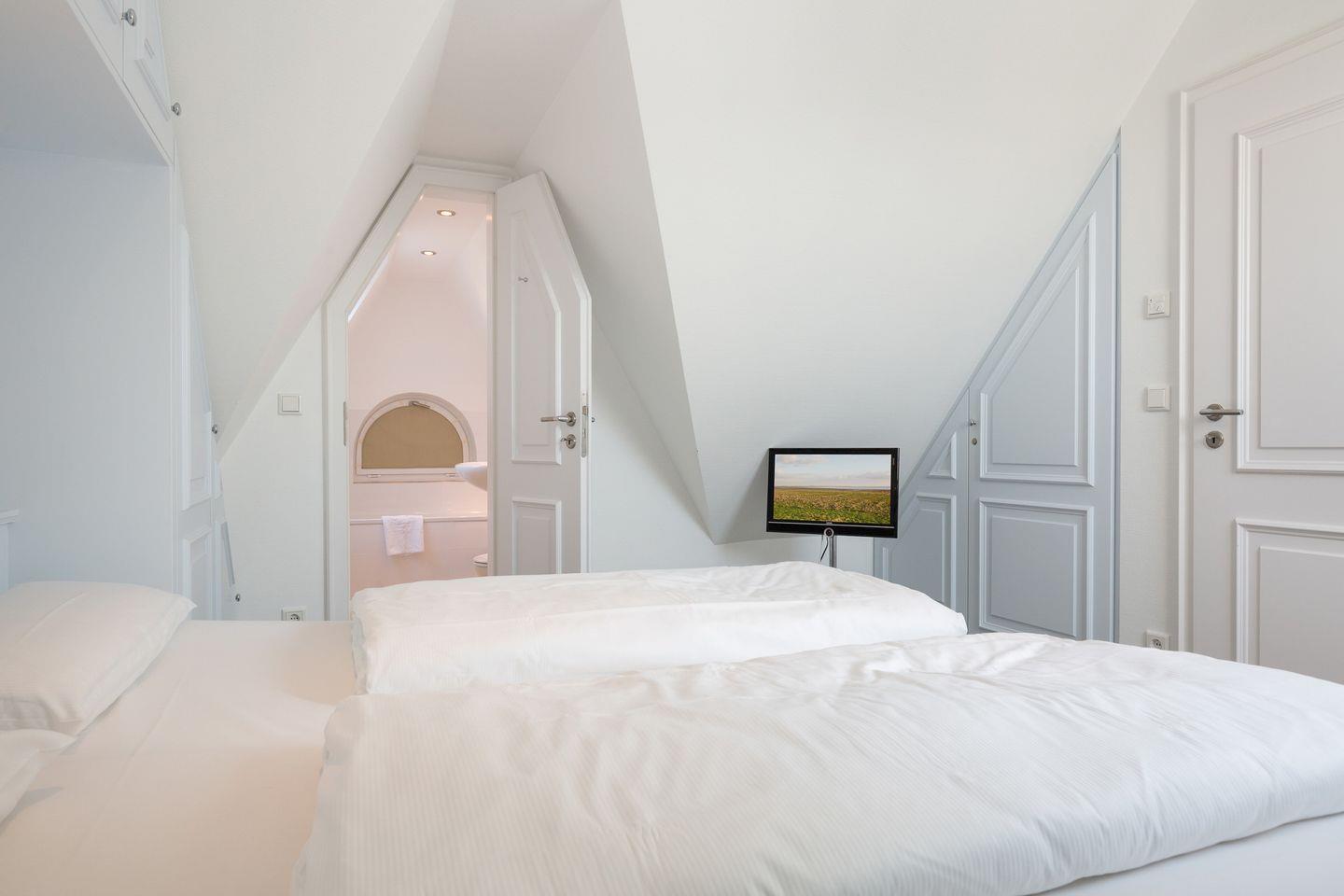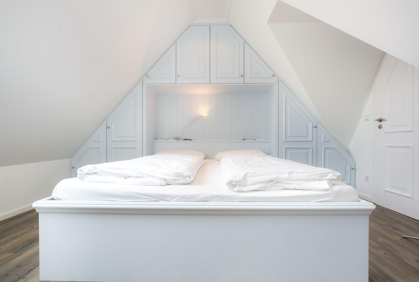 Im Dachgeschoss erwartet Sie ein wertig gestalteter Raum mit Doppelbett (180x200cm) und viel Schrankplatz. Es steht Ihnen ein weiteres En-Suite Bad zur Verfügung, hier sogar mit Wanne sowie WC.