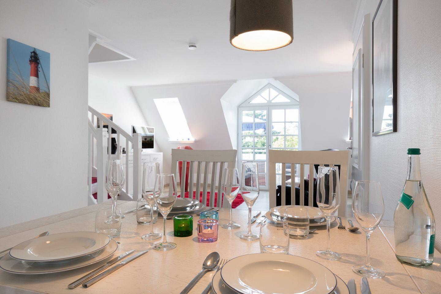 OG: Ihr lichtdurchfluteter, großzügiger Wohnbereich ist sehr geschmackvoll gestaltet. Apple-TV, DVD, iPod-Dock, WLAN und Radio verstehen sich von selbst. Integrierte Luxusküche mit Induktionsherd, Backofen, Microwelle, Geschirrspüler und Elektrogrill für Innen und Außen. Sehr schöner Westbalkon mit Blickrichtung Dünen, zum Genießen der Sylter Sonnenstunden mit Gartenmobiliar (ca. von April-Oktober). Ihre Luxusküchenzeile wurde optisch geschickt vom Wohnbereich getrennt und ist überkomplett ausgestattet. Ihr Bad gleicht einem Wellnessbad und heißt Sie mit XL-Dusche, WC, schönem Waschtisch und feinen Details Willkommen.