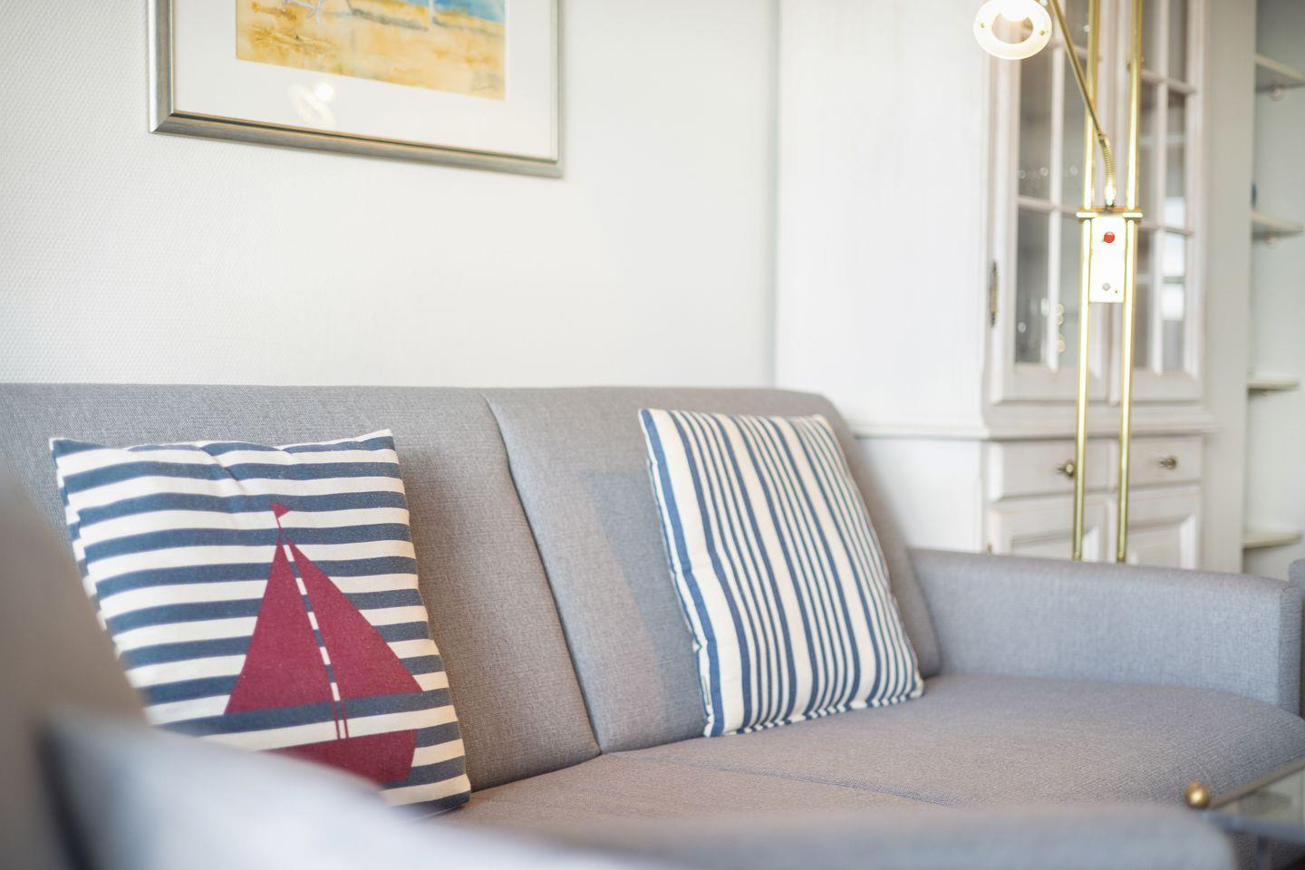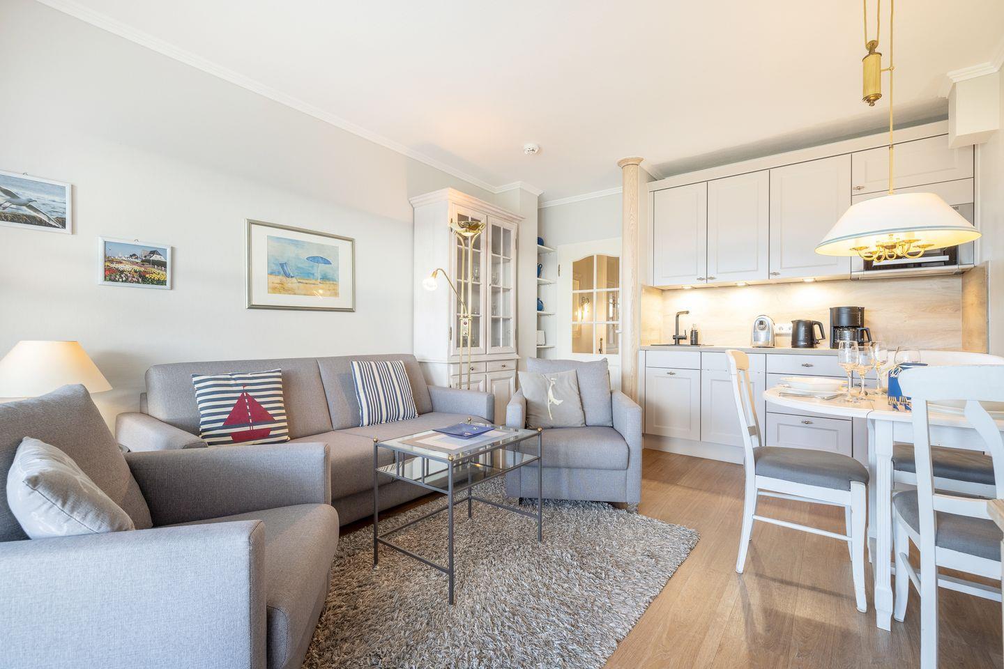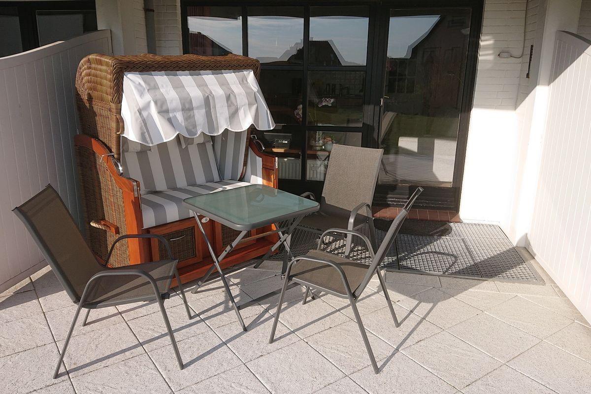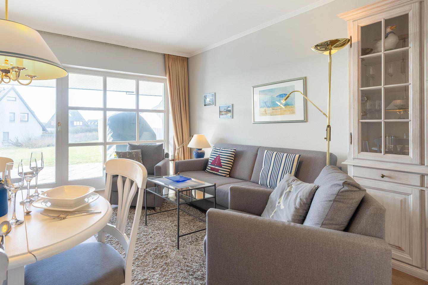 EG: schöner Wohnraum mit Kabel-TV, WLAN, DVD- und CD-Player und Radio. Gemütliche Sitzecke. Integrierte Küche mit Microwelle und Geschirrspüler. Schöne Süd-Terrasse mit Strandkorb (ca. von April–Oktober).