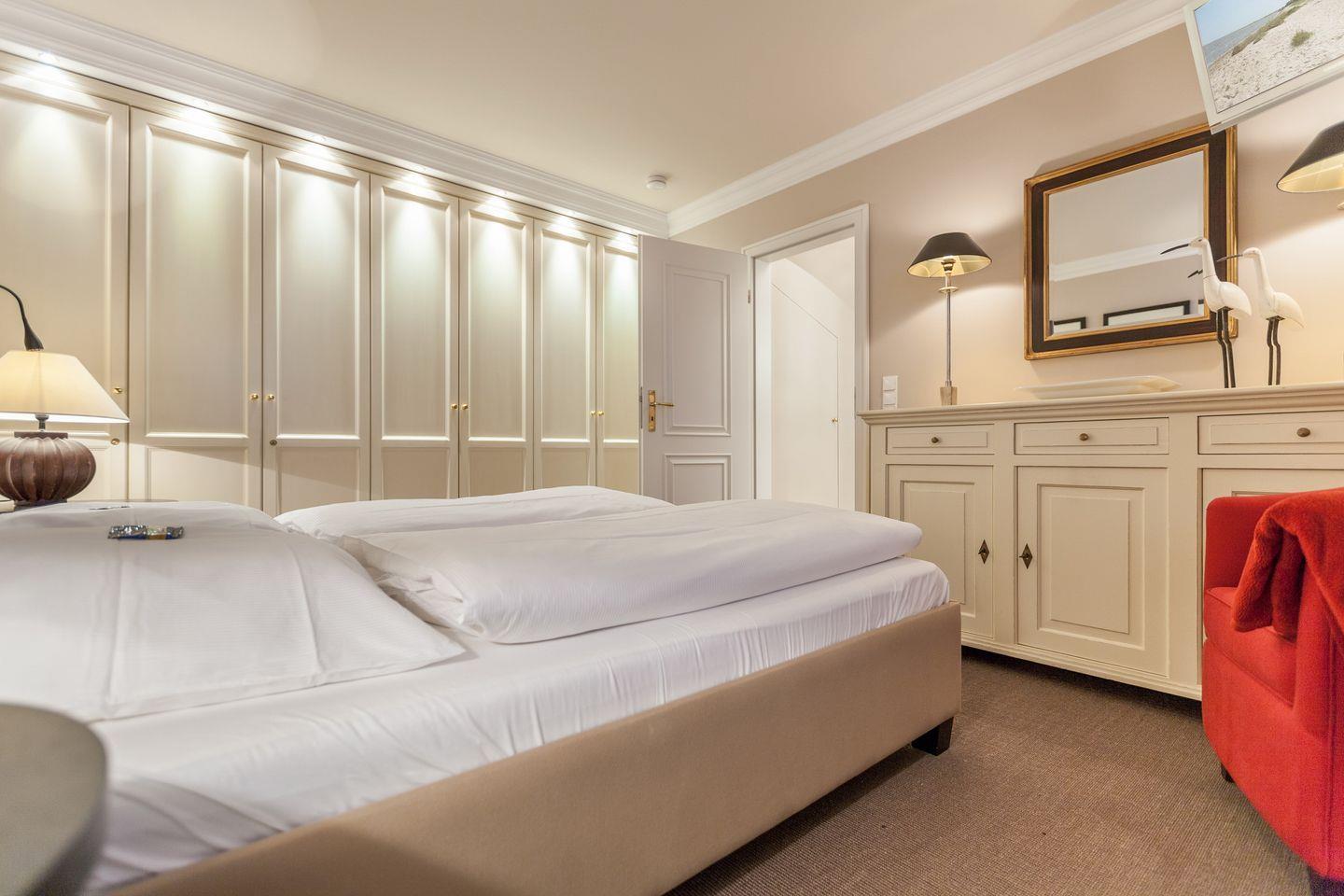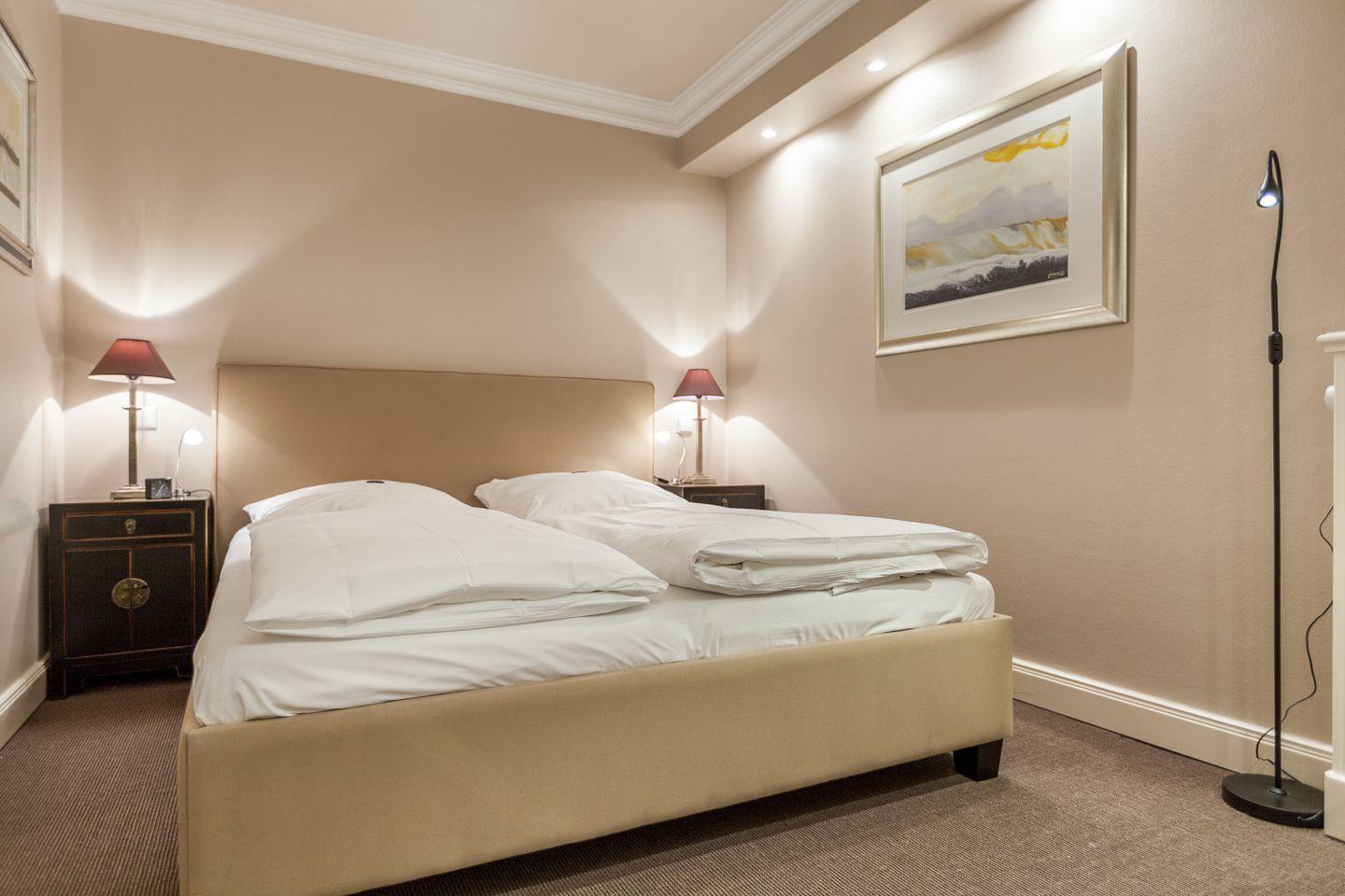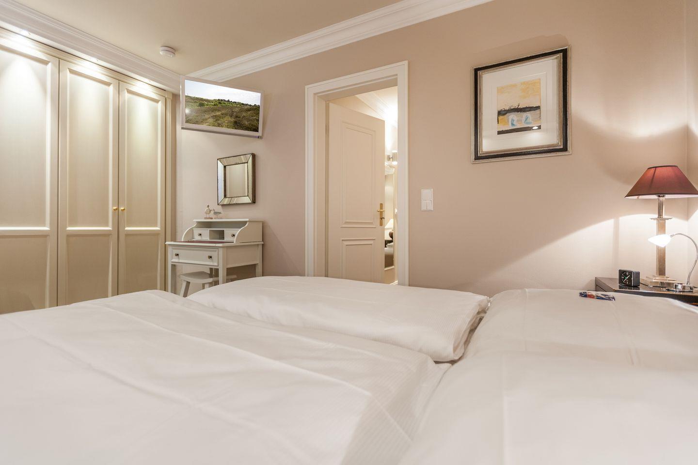 Beide Räume verfügen über modernste TV-Flatscreens (HDTV). Hier schließt sich das geräumige Luxusbad mit Dusche und WC sowie Fußboden-Heizung an.