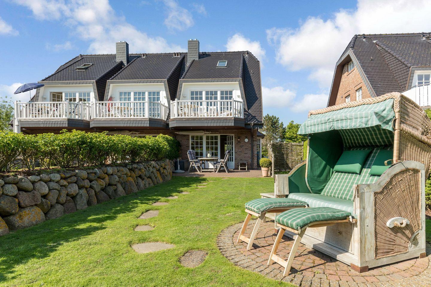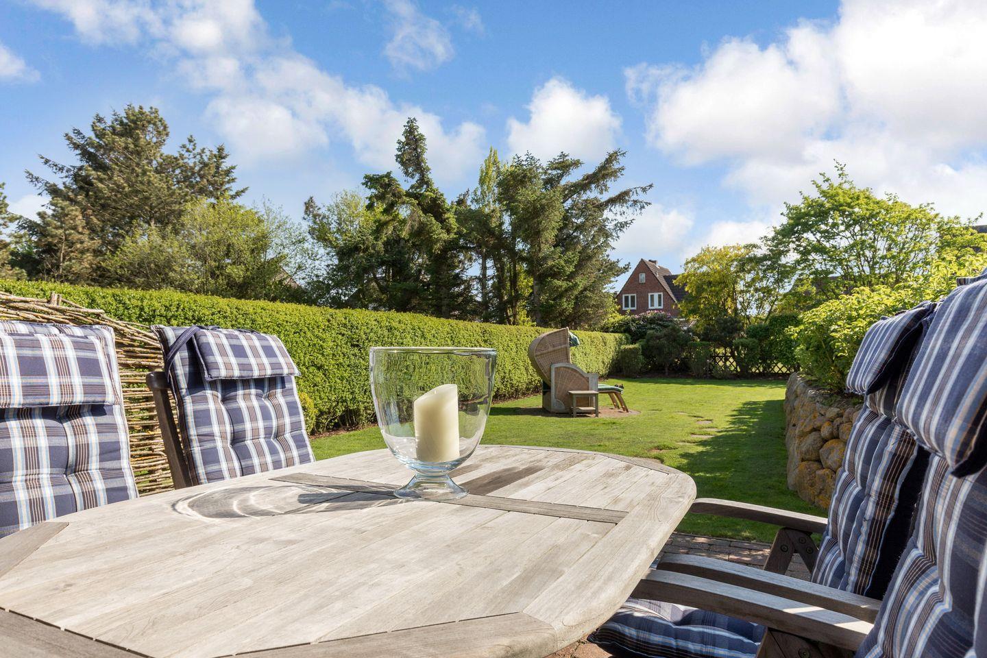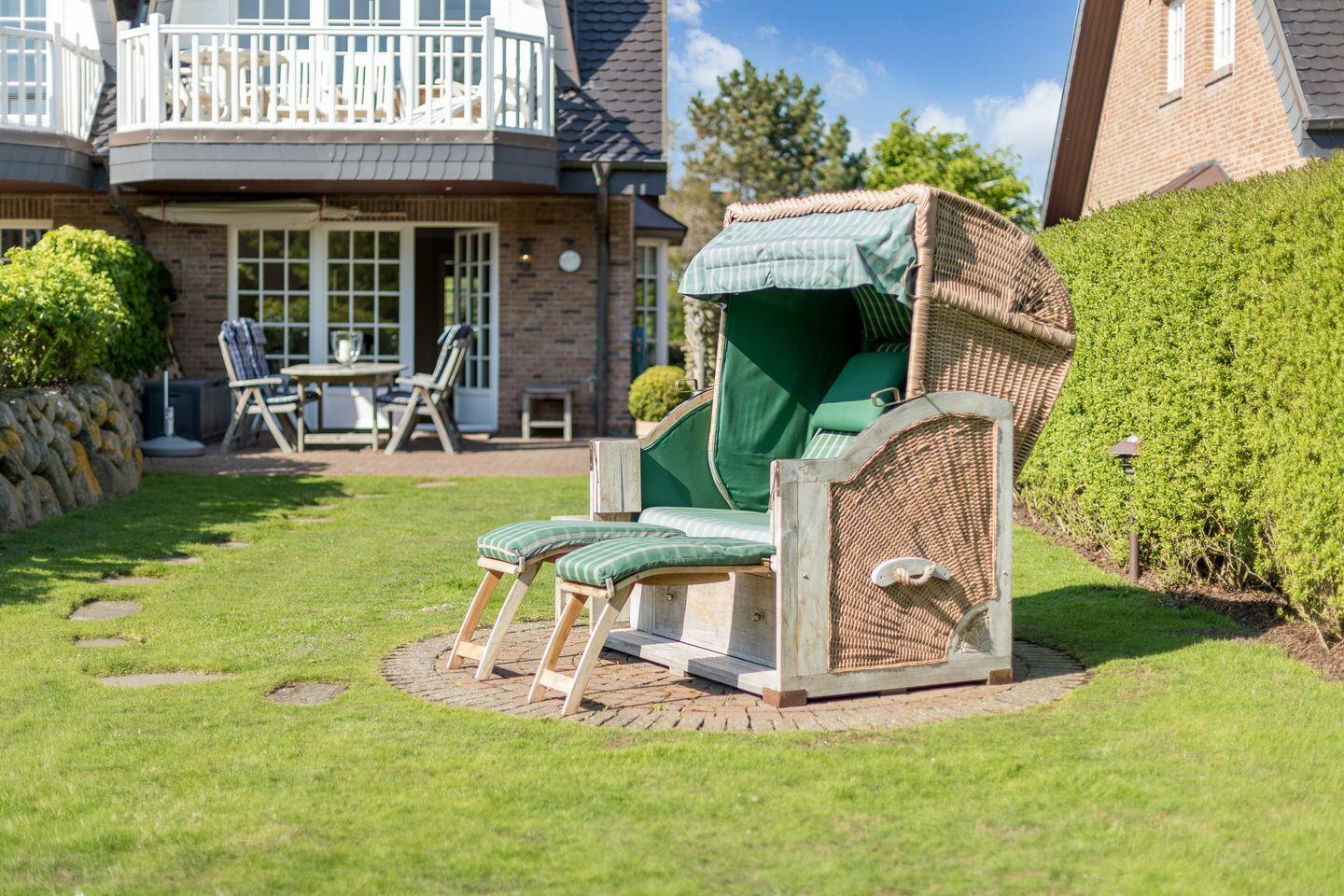 Süd-Terrasse mit Teak-Gartenmöbeln und Strandkorb (ca. von April-Oktober). Ein Parkplatz steht ebenfalls kostenfrei zur Verfügung.