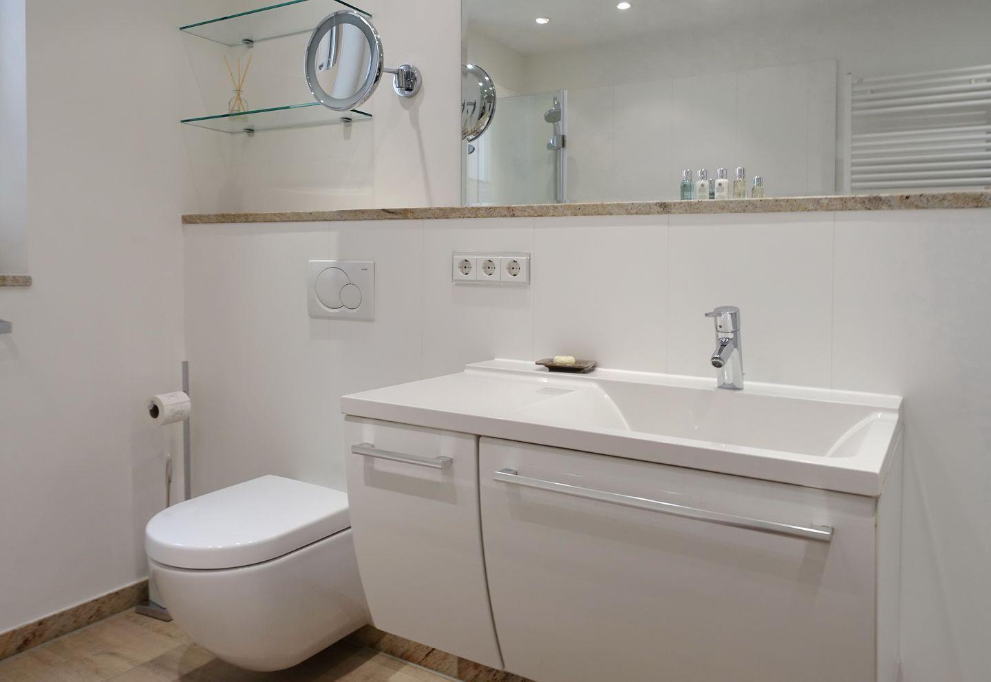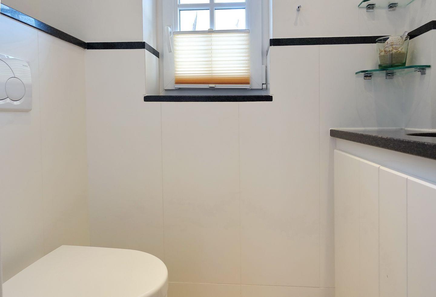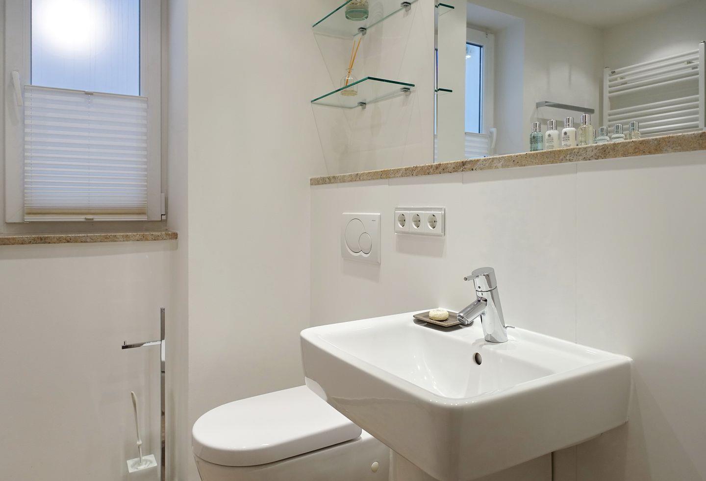 Erdgeschoss: Eleganter und sehr großzügiger Wohnraum, der durch Helligkeit, wertigen Granitboden (mit Fußbodenheizung) und geschmackvolle Möblierung besticht. Schöne Sitzecke im lichtdurchfluteten Erker. Flatscreen-TV mit Heimkinosystem, DVD-Player, Telefon, DSL-Anschluss, WLAN und Flatrate. Integrierte Küche mit Ceranherd, Backofen-Microwellenkombination, Geschirrspüler, Jura-Kaffeevollautomat und Nespresso-Maschine mit Starter-Kit an Kapseln. Gäste-WC. Sonnige Süd-Ost-Terrasse mit modernen Gartenmöbeln und Strandkorb (ca. von April - Oktober). Geschützter Parkplatz.
