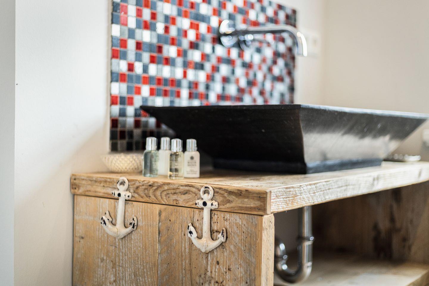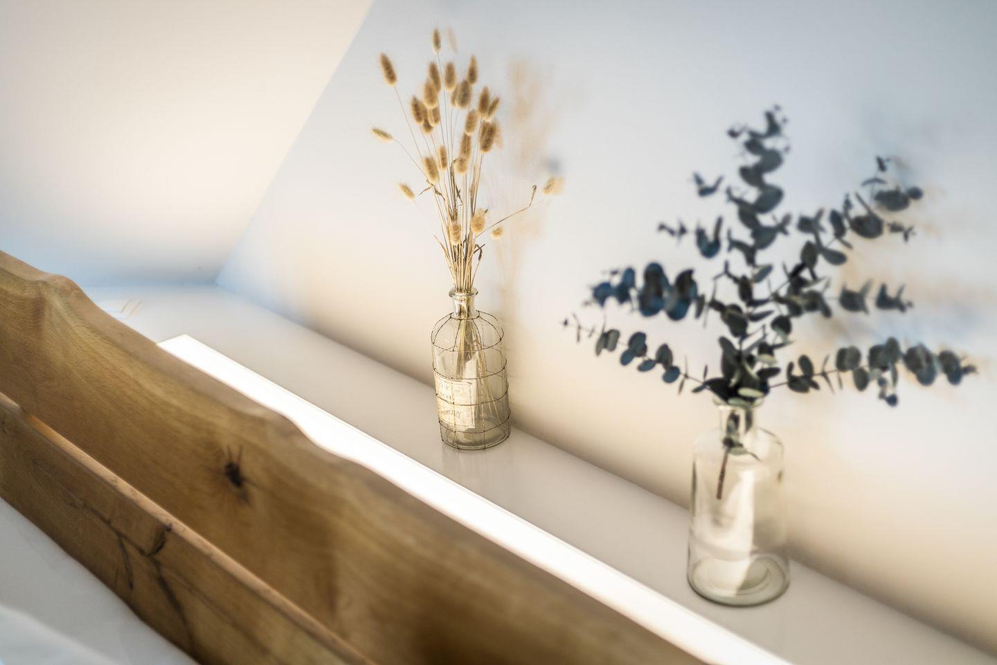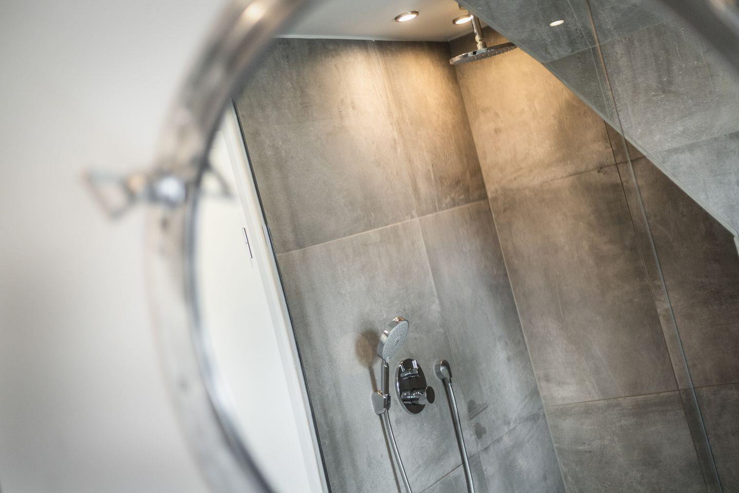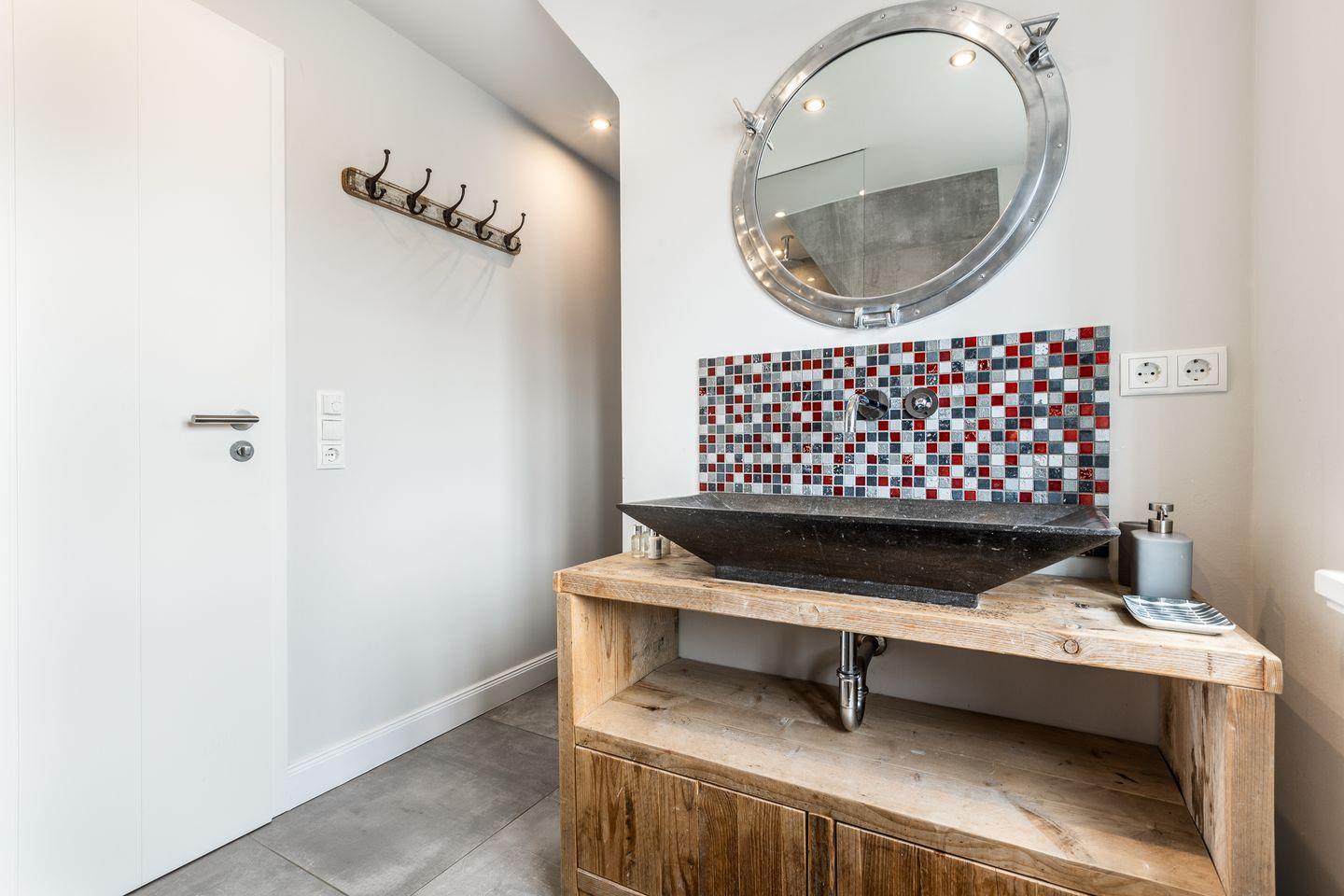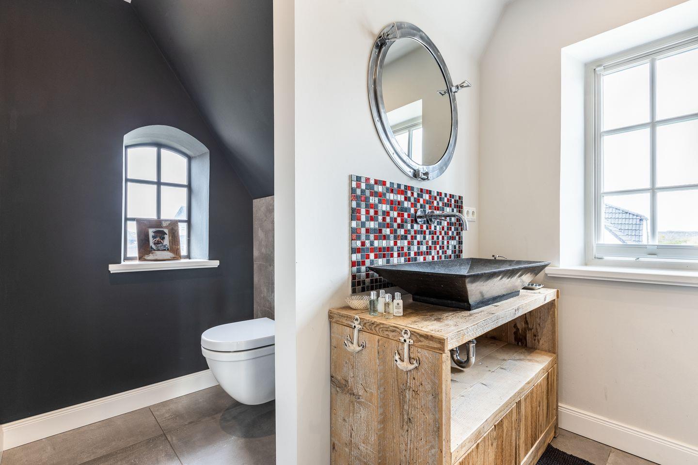 Im Obergeschoss des Hauses erwartet Sie ein großes Schlafzimmer mit viel Schrankplatz und Flatscreen-TV. Das Tageslichtbadezimmer mit XXL-Dusche und WC befindet sich direkt nebenan. Dieses besticht durch ein ganz besonderes Design mit ausgefallenen Möbeln und einzigartigen Fliesen.