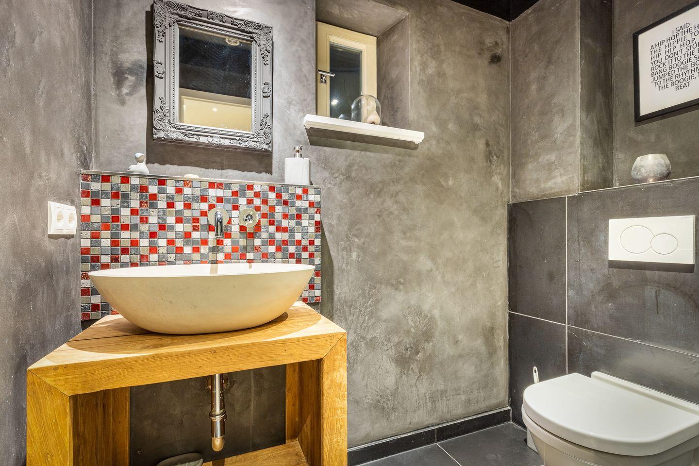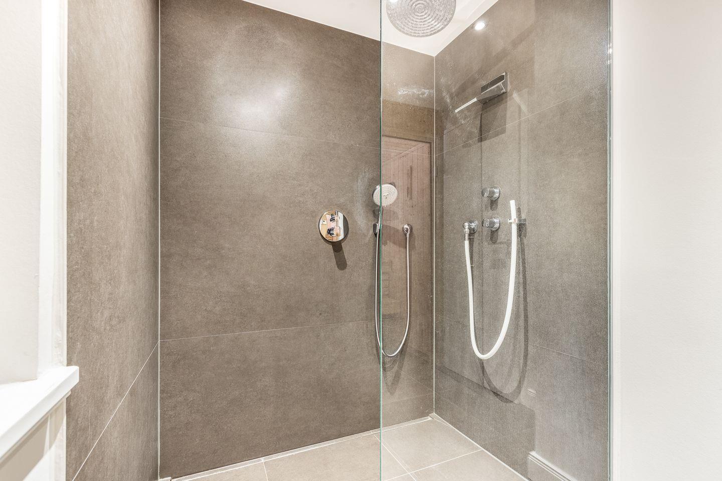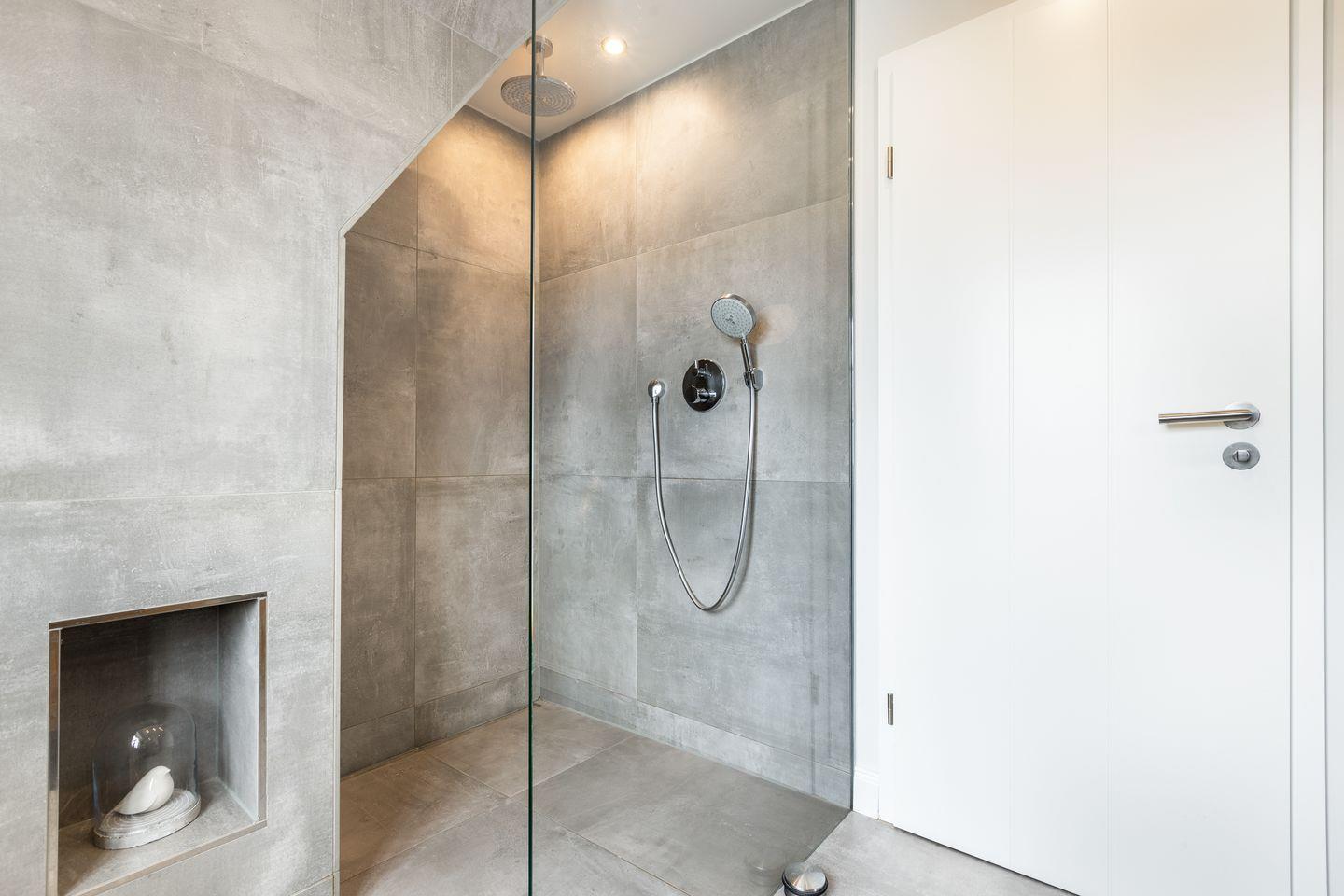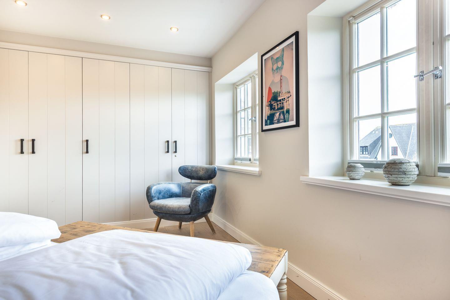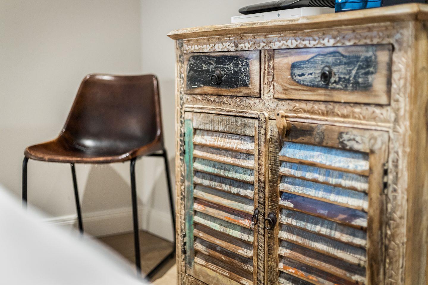 Im Obergeschoss des Hauses erwartet Sie ein großes Schlafzimmer mit viel Schrankplatz und Flatscreen-TV. Das Tageslichtbadezimmer mit XXL-Dusche und WC befindet sich direkt nebenan. Dieses besticht durch ein ganz besonderes Design mit ausgefallenen Möbeln und einzigartigen Fliesen.