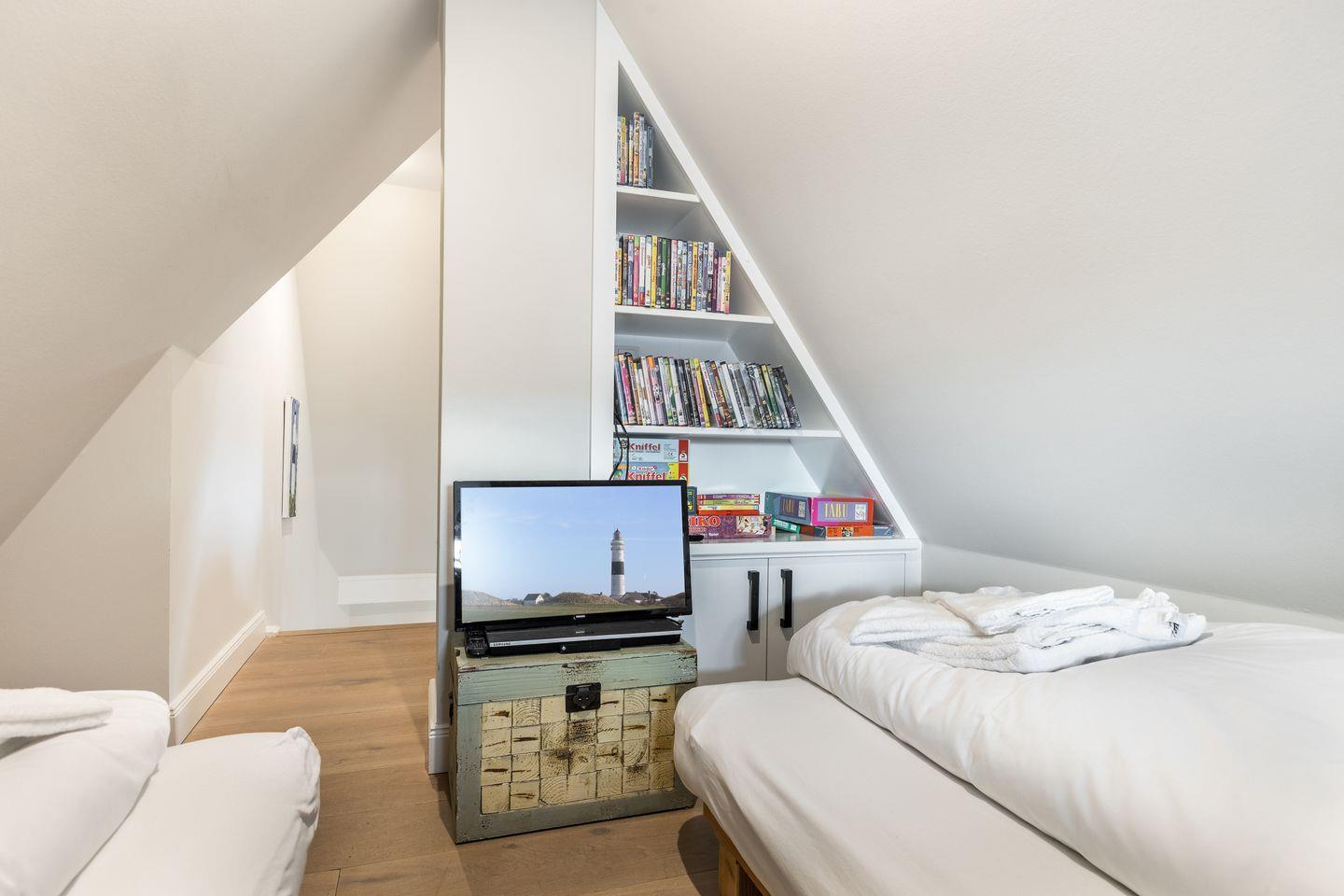 Im Dachgeschoss des Hauses befindet sich eine „Räuberhöhle“ par excellence, mit zwei Einzelbetten und einem Flatscreen TV, in der sich Ihre Kinder besonders wohl fühlen werden. Wellness-Fans kommen im Untergeschoss voll auf ihre Kosten – entspannen Sie sich in Ihrem Luxusbad mit Sauna, großer Dusche und tollem Naturstein. Zwei weitere, sehr schön gestaltete Räume mit jeweils einem Doppelbett und Flatscreen-TV stehen Ihnen auf dieser Ebene ebenfalls zur Verfügung.