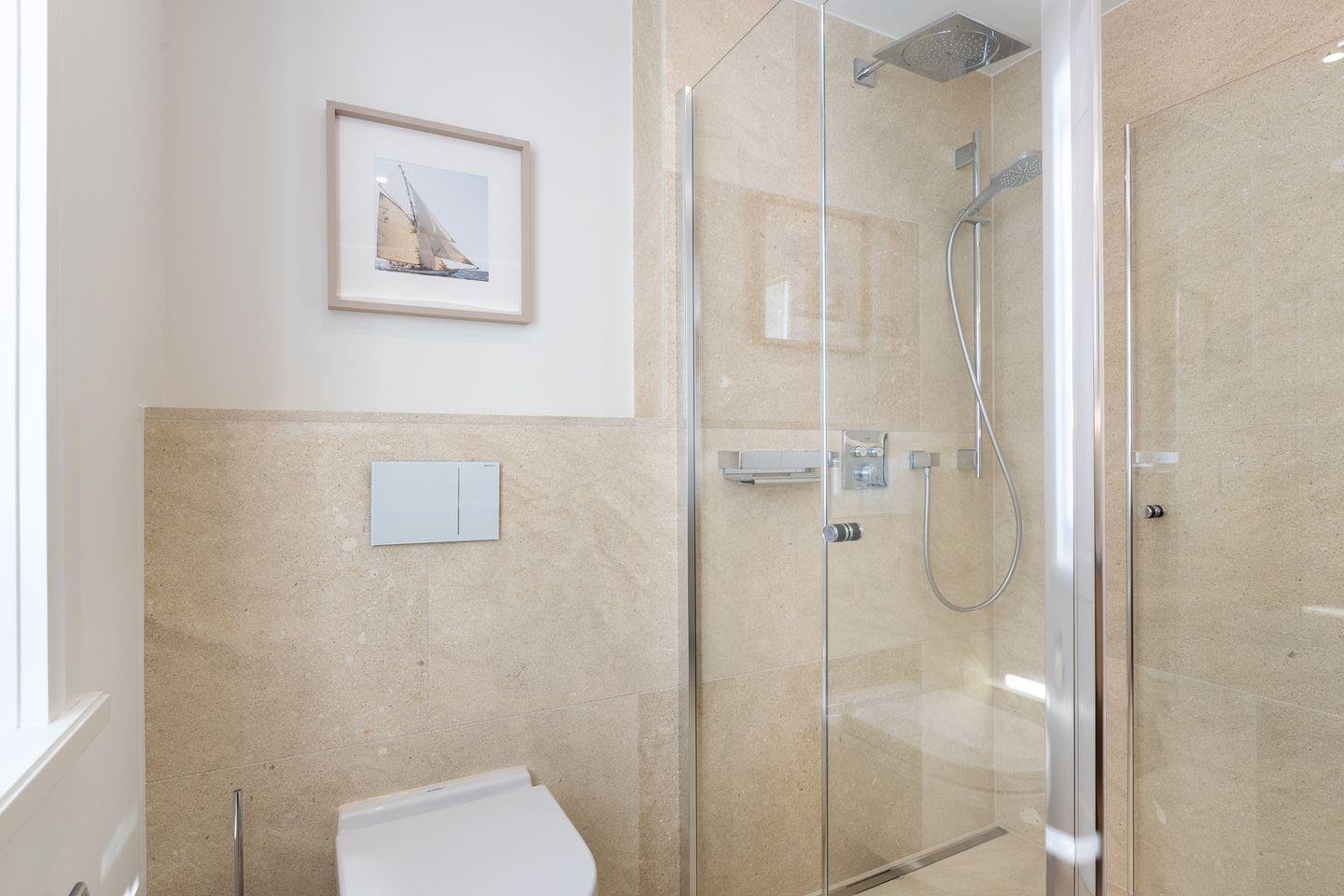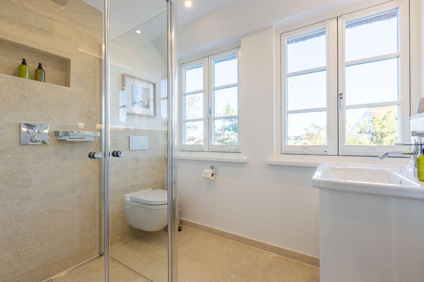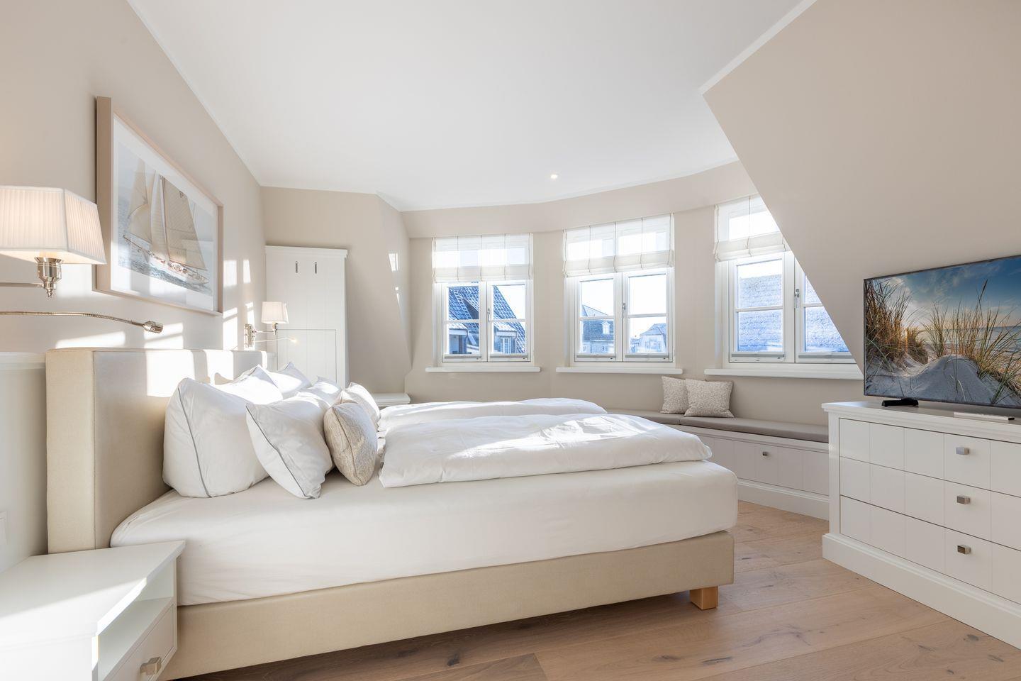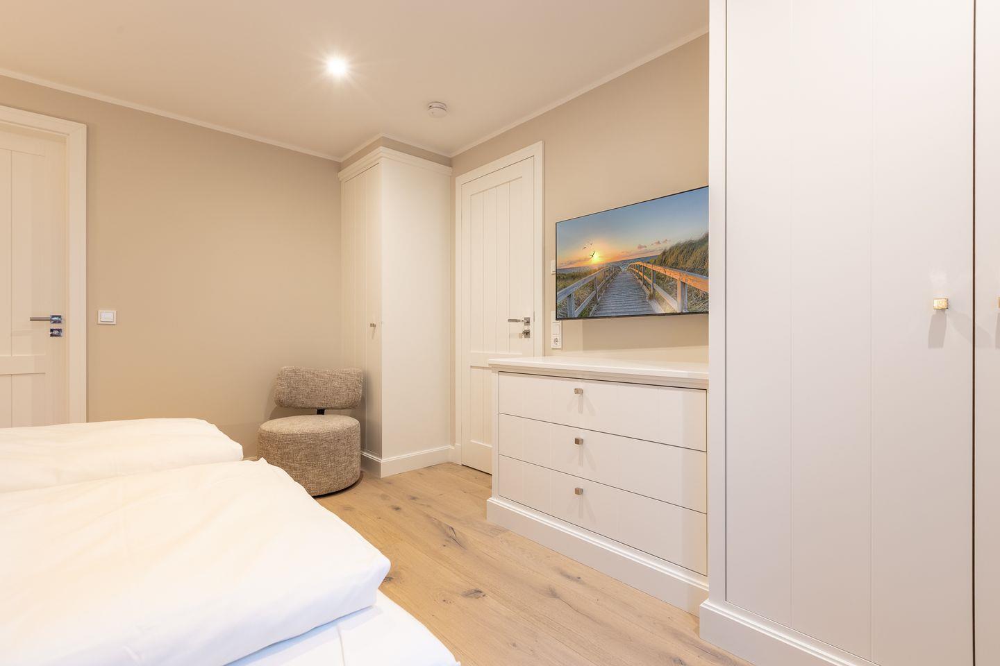 Im Obergeschoß befinden sich zwei weitere Schlafzimmer mit jeweils einem Doppelbett (180x200cm), TV und zwei Duschbädern. Im Masterschlafzimmer liegt das Bad ensuite.