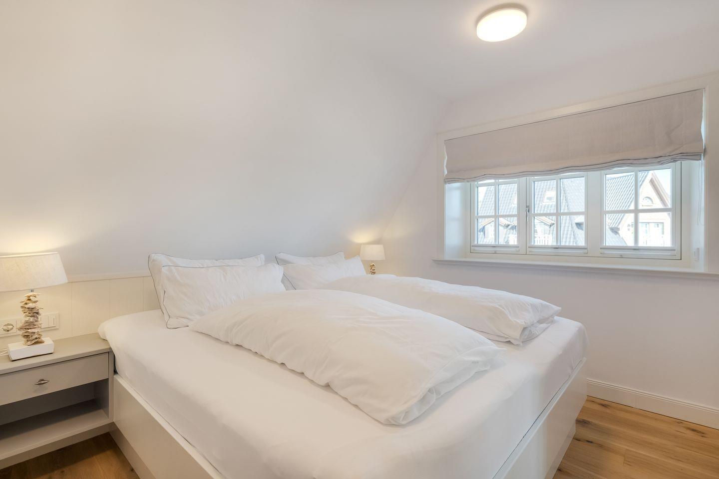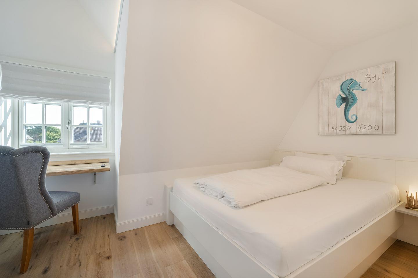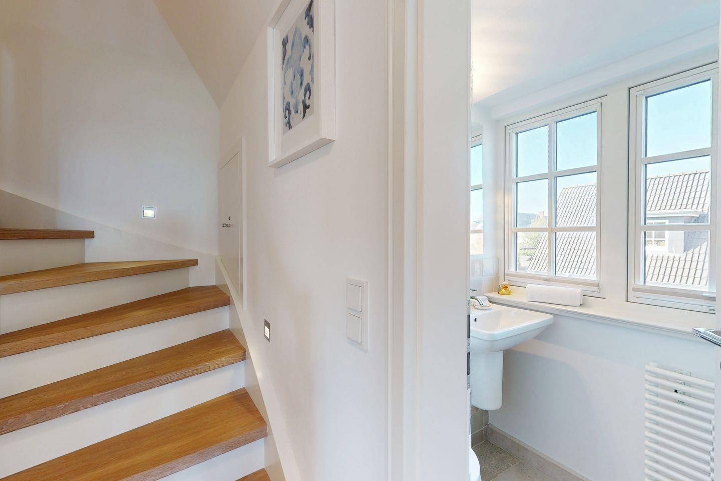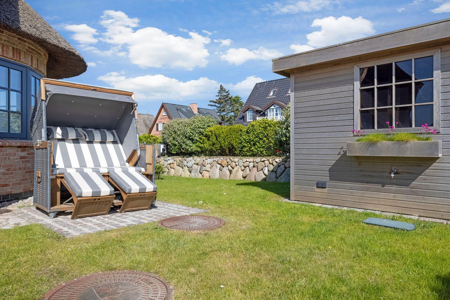 Vom Wohnbereich aus betreten Sie Ihren eigenen Garten mit Terrasse, die von April bis Oktober möbliert ist. Ein original Sylter Strandkorb und zwei Sonnenliegen stehen Ihnen ebenso zur Verfügung. Auf gleicher Ebene zum Wohnbereich finden Sie außerdem ein Gäste-WC.