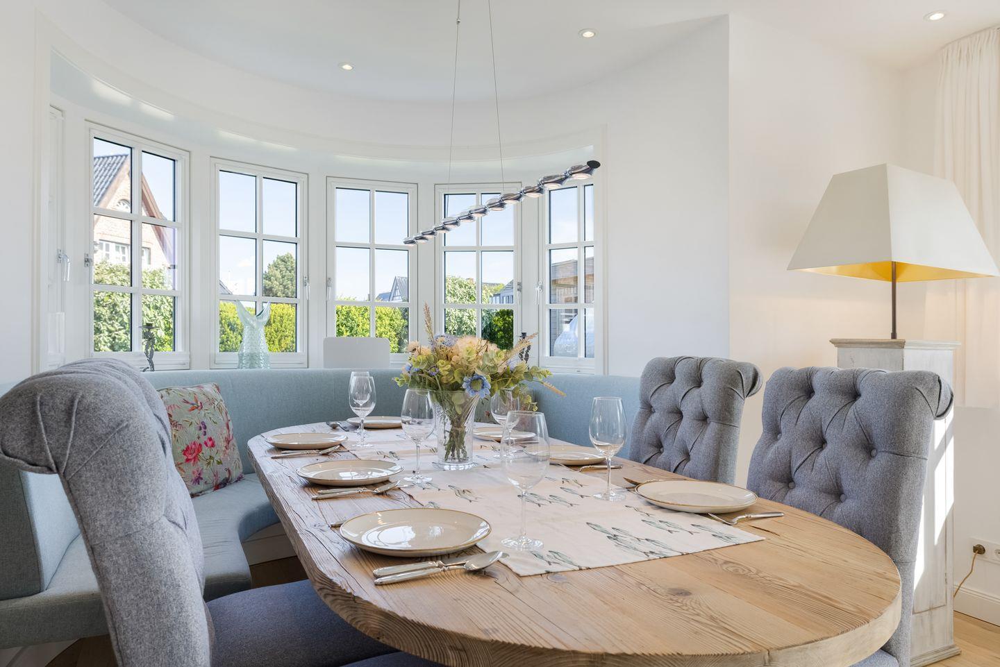 Beim Betreten des Wohnraumes sticht einem direkt der wunderschöne, große Panorama-Gaskamin ins Auge, der Ihnen in den Wintermonaten wohlige Wärme spendet. Ein gemütlicher Essbereich, der mit einer Sitzbank im Erker kombiniert ist, lädt zum gemeinsamen Abendessen und Entspannen ein. Die offene Küche ist mit allem ausgestattet, was Sie in Ihrem Urlaub benötigen. Ein Induktionskochfeld mit Wrasenabzug, Backofen, Dampfgarer und Mikrowelle ermöglichen Ihnen ein einzigartiges Kocherlebnis.