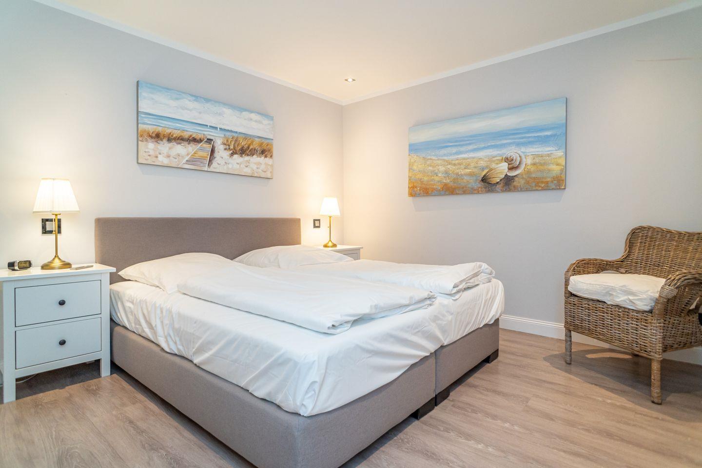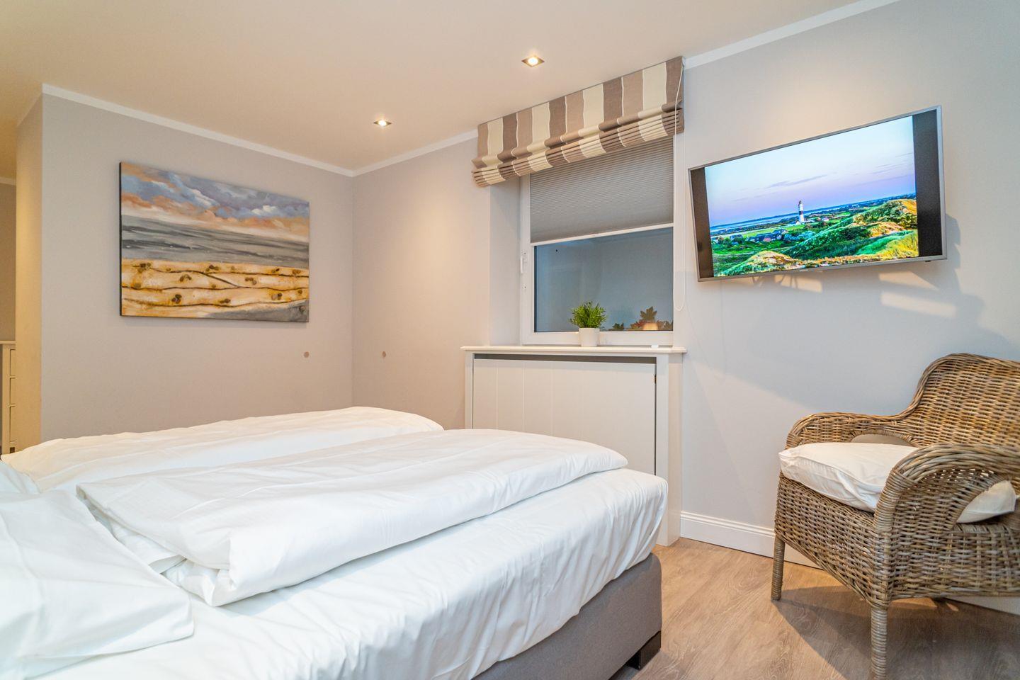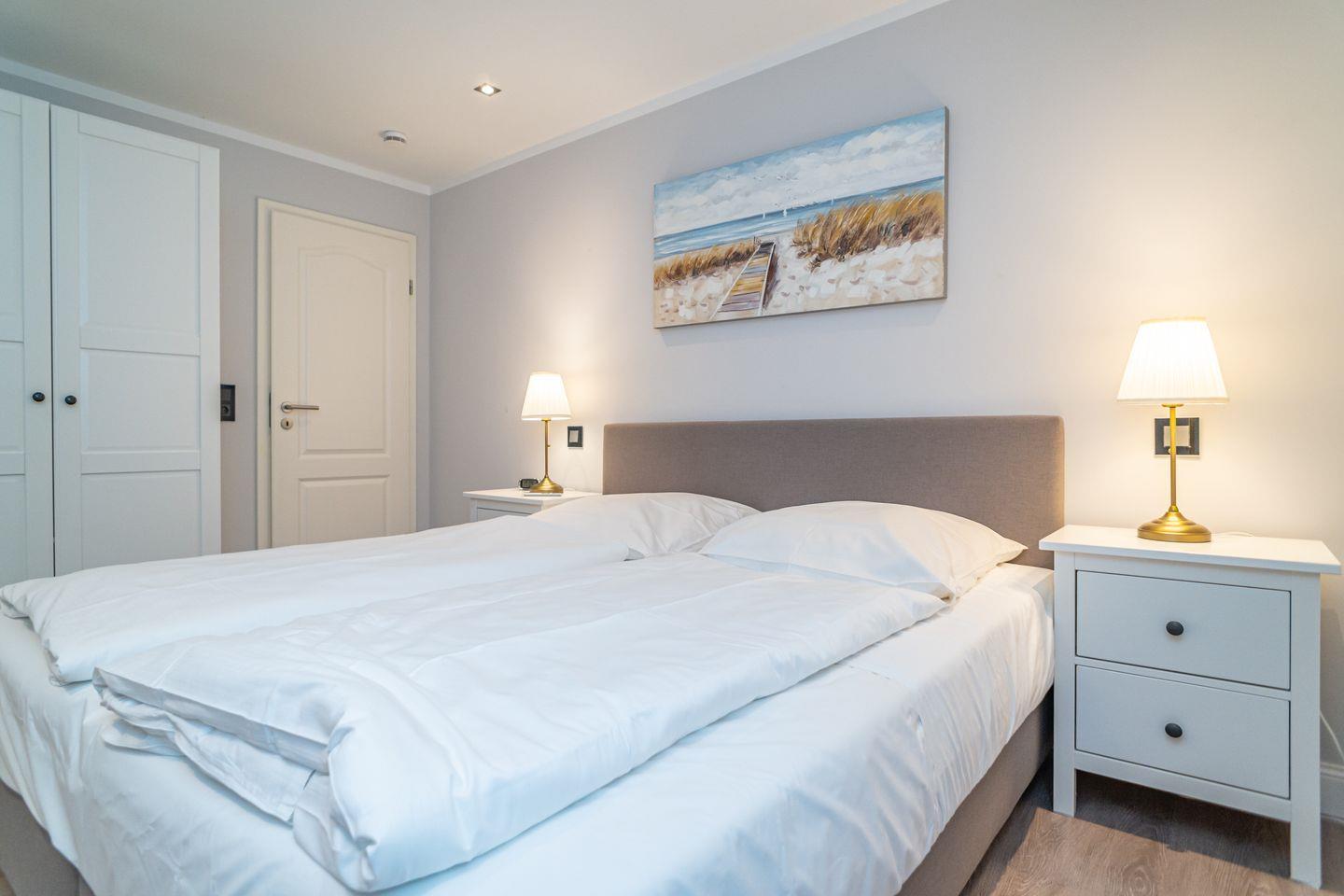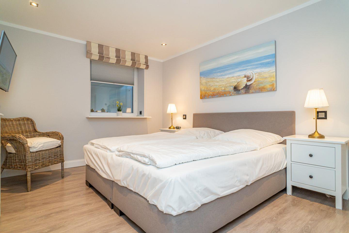 Insgesamt drei Schlafzimmer laden mit komfortablen Boxspringbetten zum wohligen Schlummern ein: eins im Erdgeschoss und zwei im Souterrain, von denen eins über einen begehbaren Kleiderschrank verfügt. Zwei moderne Bäder mit bodengleicher Dusche und on-top noch einer Sauna runden das Appartement Meeresleuchten ab.