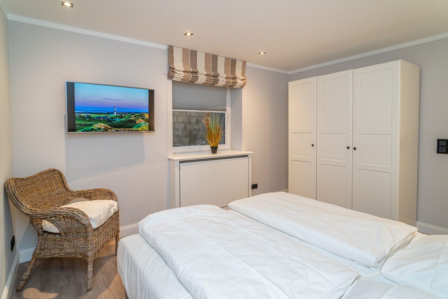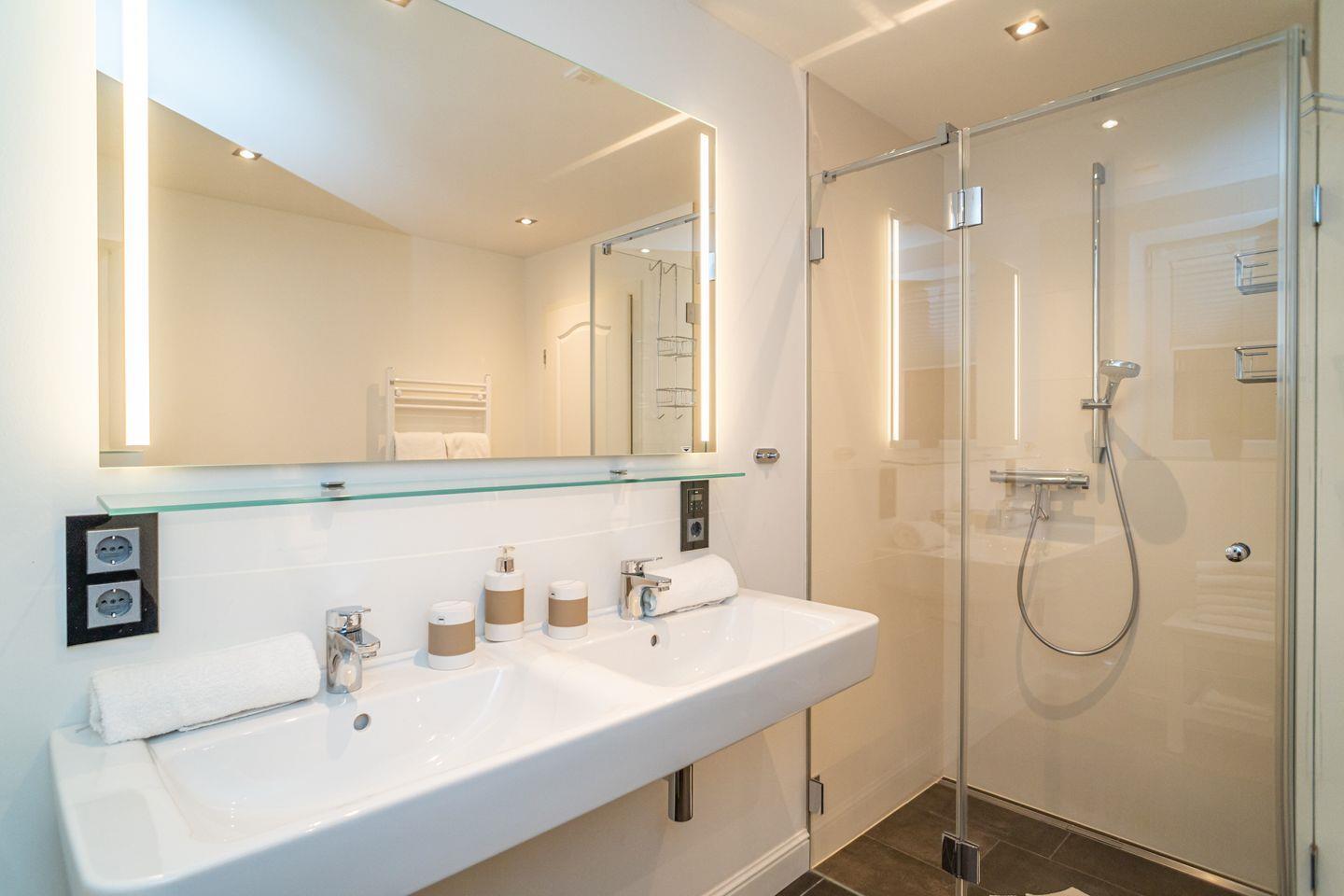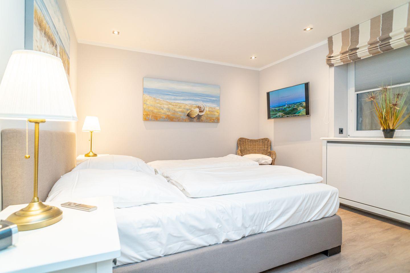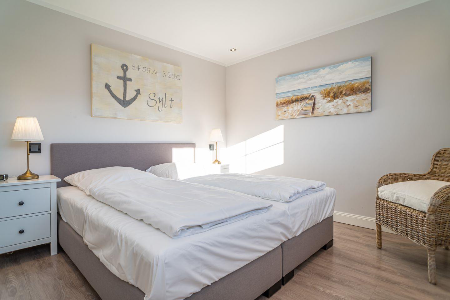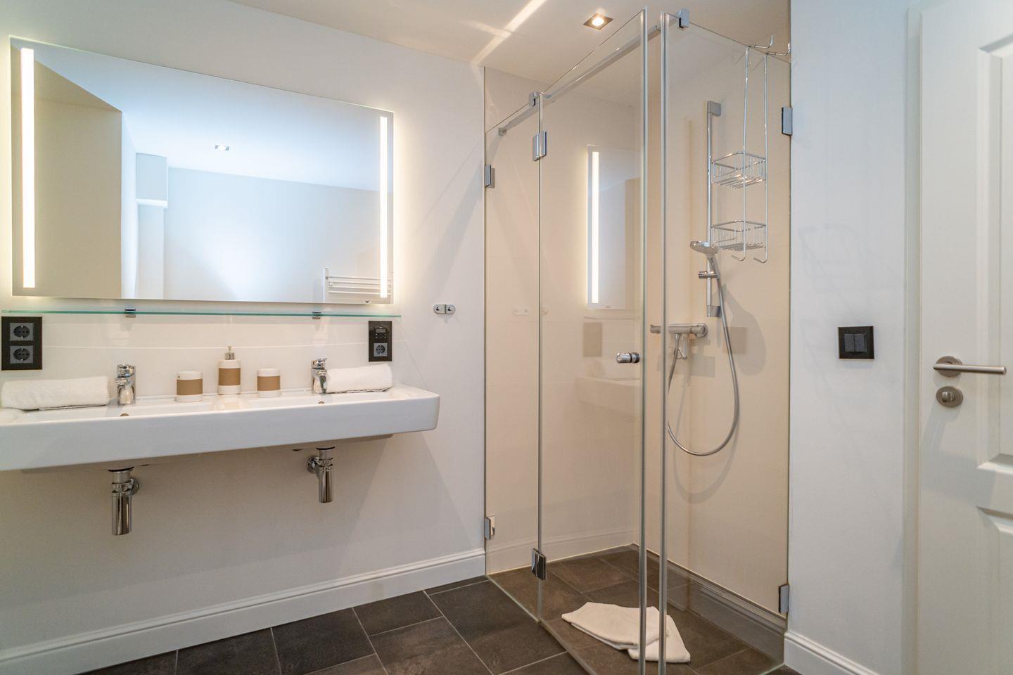Insgesamt drei Schlafzimmer laden mit komfortablen Boxspringbetten zum wohligen Schlummern ein: eins im Erdgeschoss und zwei im Souterrain, von denen eins über einen begehbaren Kleiderschrank verfügt. Zwei moderne Bäder mit bodengleicher Dusche und on-top noch einer Sauna runden das Appartement Meeresleuchten ab.