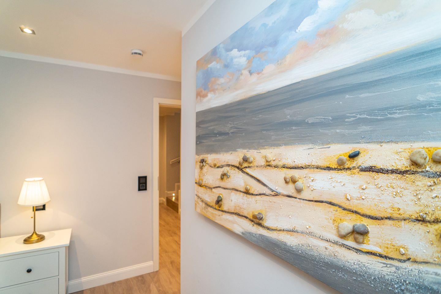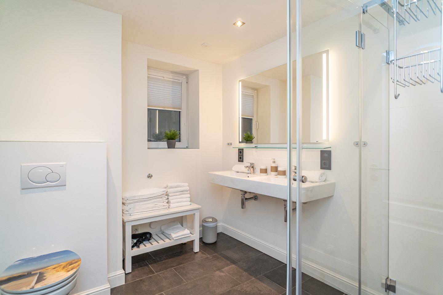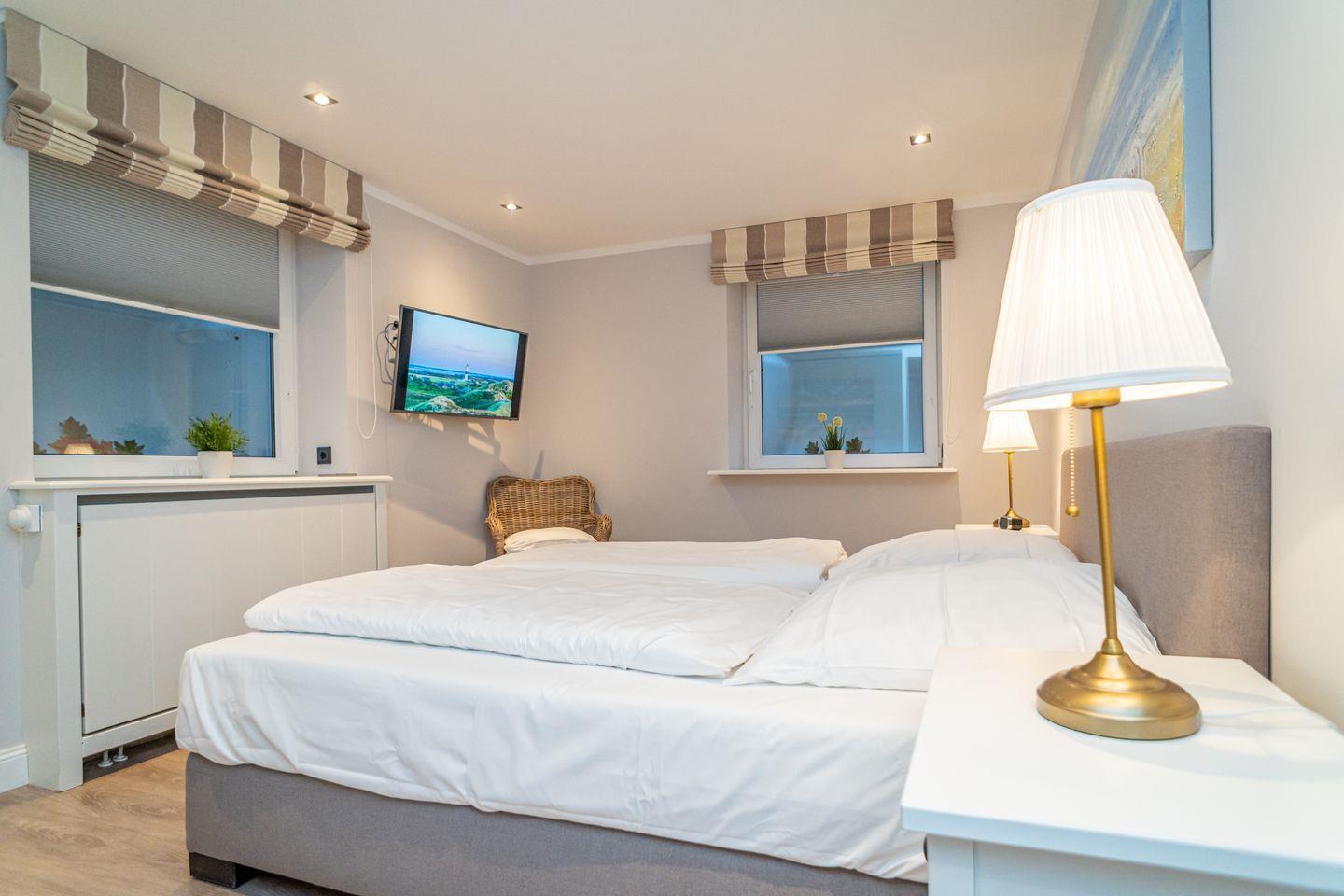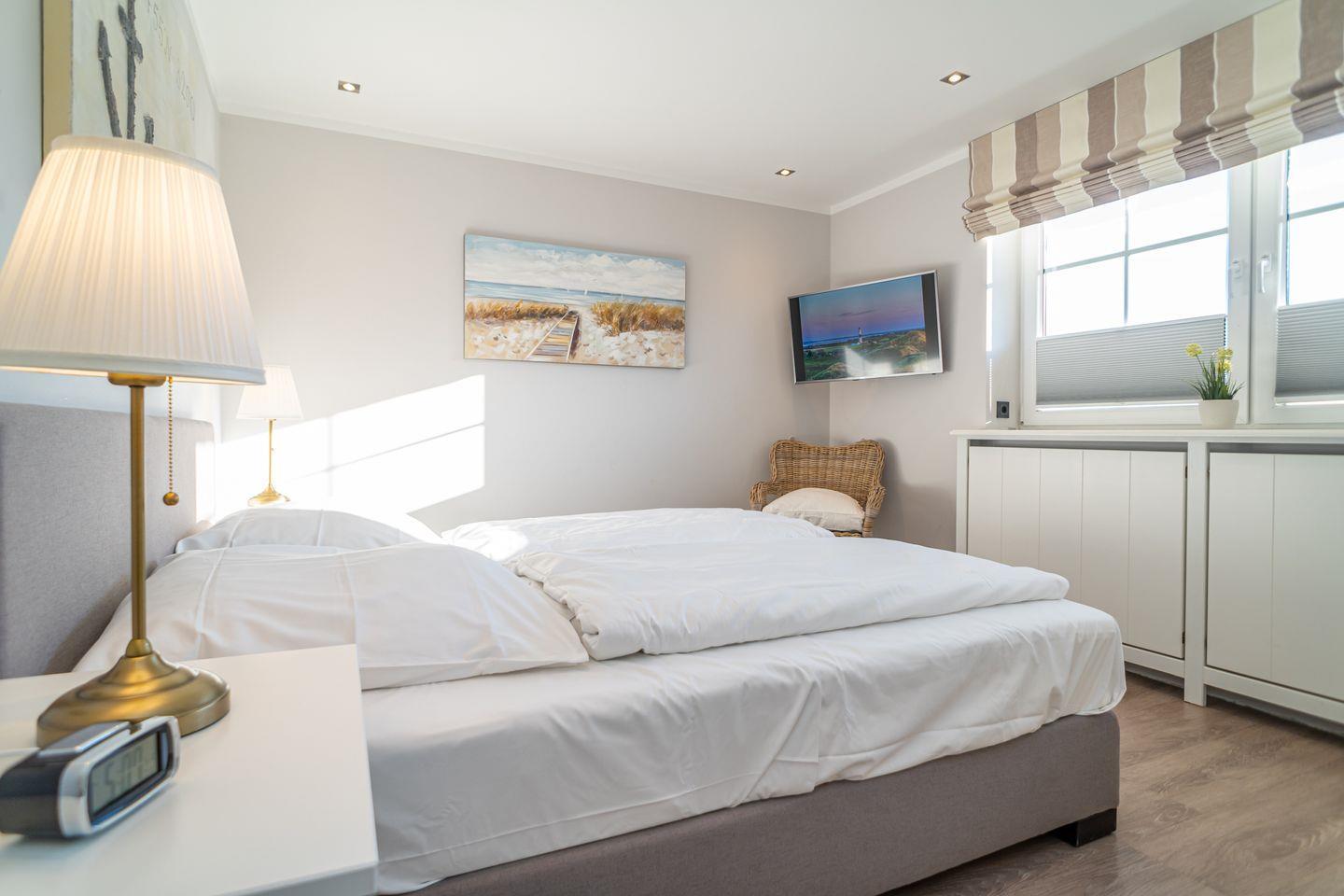 Insgesamt drei Schlafzimmer laden mit komfortablen Boxspringbetten zum wohligen Schlummern ein: eins im Erdgeschoss und zwei im Souterrain, von denen eins über einen begehbaren Kleiderschrank verfügt. Zwei moderne Bäder mit bodengleicher Dusche und on-top noch einer Sauna runden das Appartement Meeresleuchten ab.
