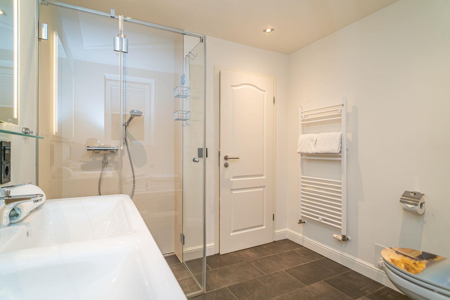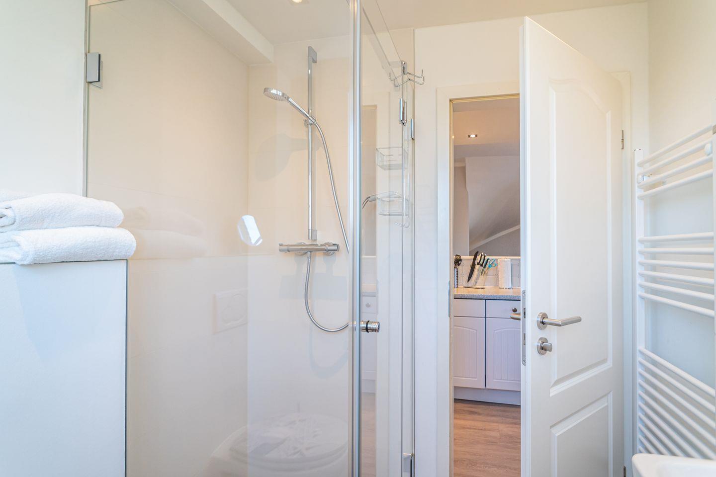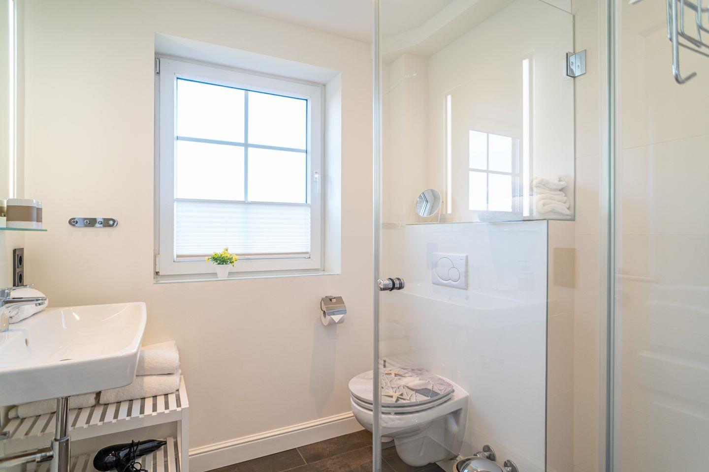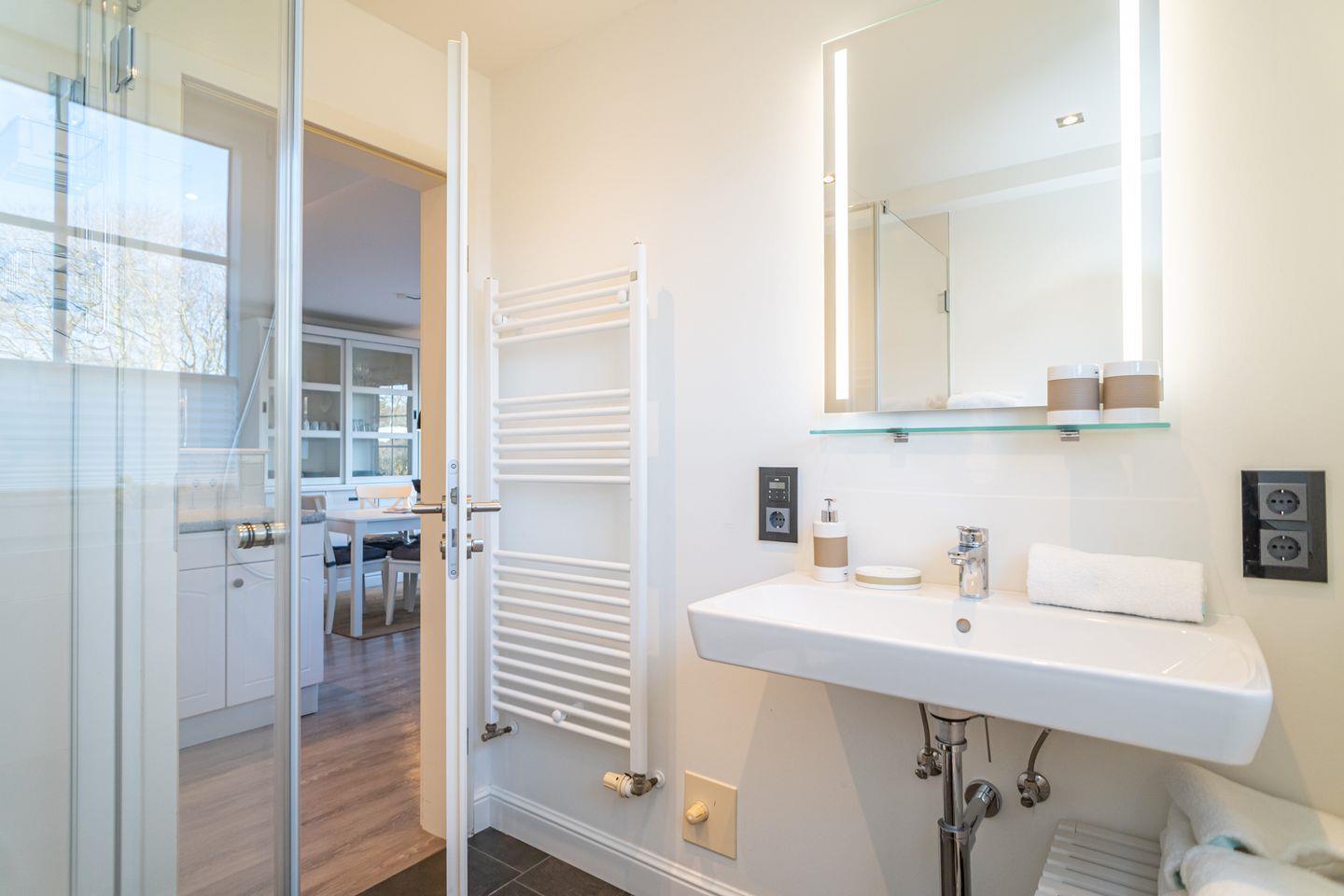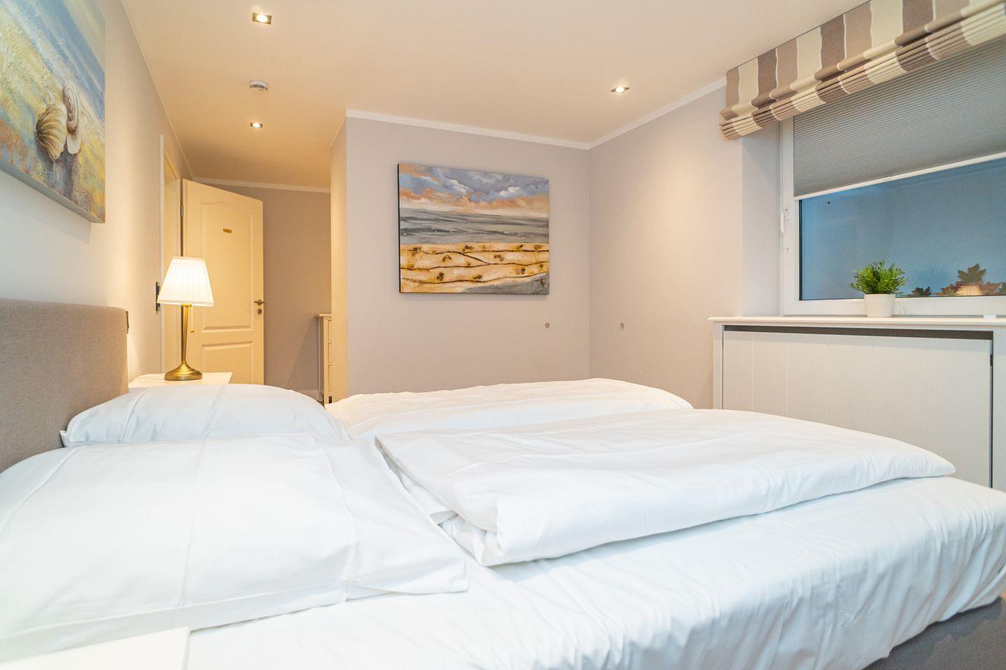 Insgesamt drei Schlafzimmer laden mit komfortablen Boxspringbetten zum wohligen Schlummern ein: eins im Erdgeschoss und zwei im Souterrain, von denen eins über einen begehbaren Kleiderschrank verfügt. Zwei moderne Bäder mit bodengleicher Dusche und on-top noch einer Sauna runden das Appartement Meeresleuchten ab.