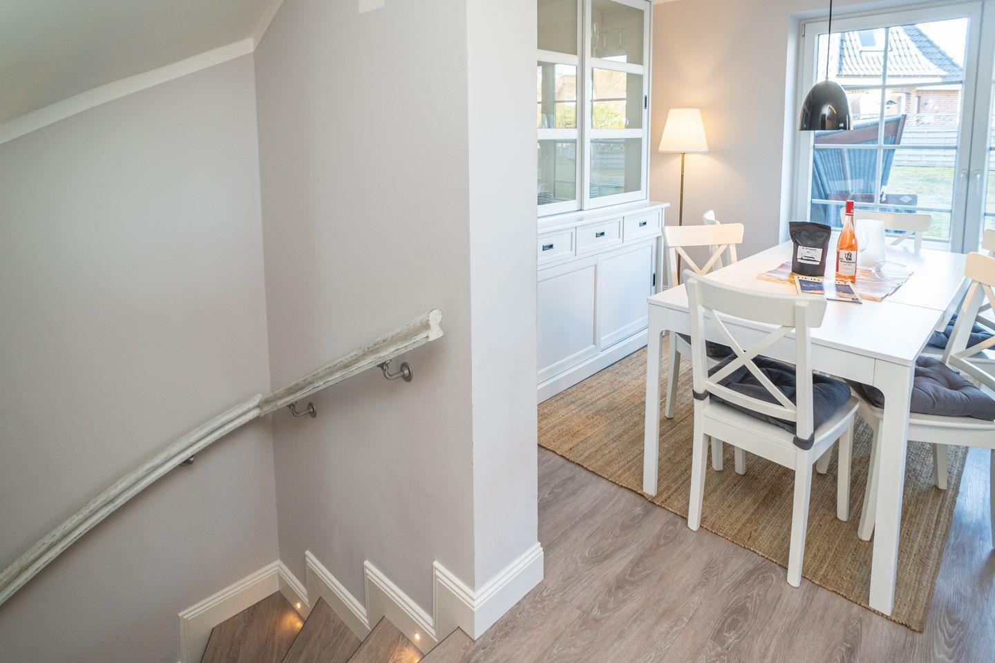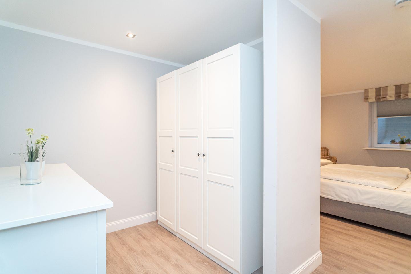 Die gekreideten Töne der Eichendielen ziehen sich durch alle Räumen und sorgen so für eine warme Atmosphäre. Helle Holzarbeiten und stilsichere Farbgestaltung verschaffen dabei eine behagliche Gemütlichkeit, die den nordischen Charakter dieses Appartements im Sylter Strandhaus Look prägt.
