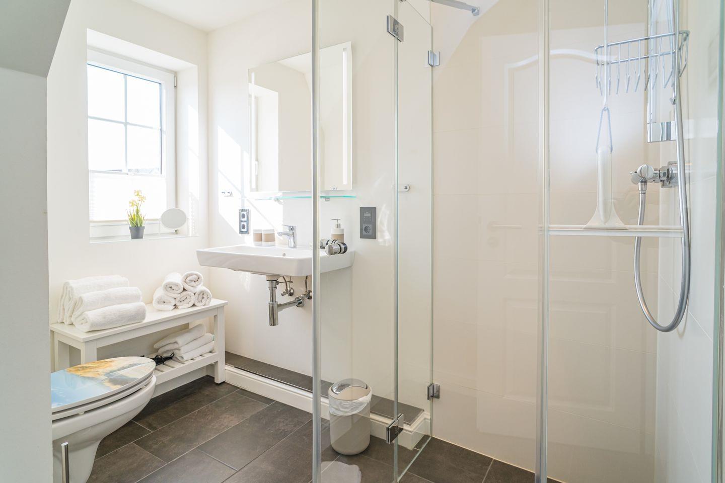 Ein modernes Bad mit bodengleicher Dusche machen das Glück perfekt. Gästen des Appartements Nordlicht steht darüber hinaus ein Gartenplatz mit Strandkorb und Gartenmöbeln auf dem Grundstück zur Verfügung.