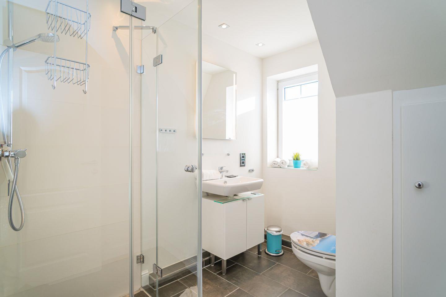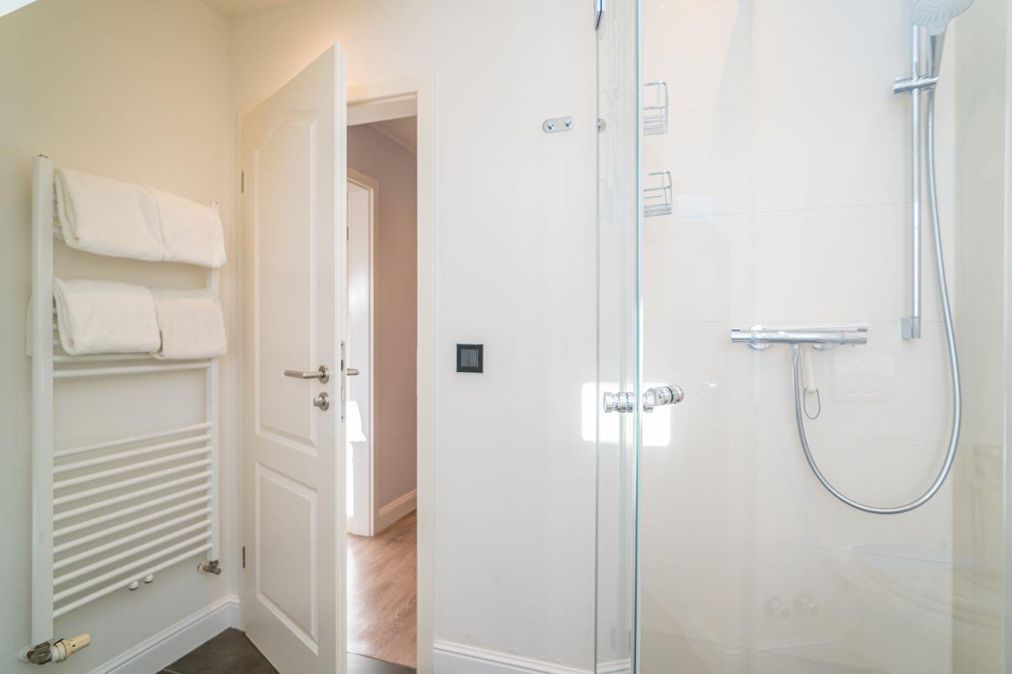 Ein modernes Bad mit bodengleicher Dusche machen das Glück perfekt. Gästen des Appartements Gezeiten steht darüber hinaus ein Gartenplatz mit Strandkorb und Gartenmöbeln auf dem Grundstück zur Verfügung.