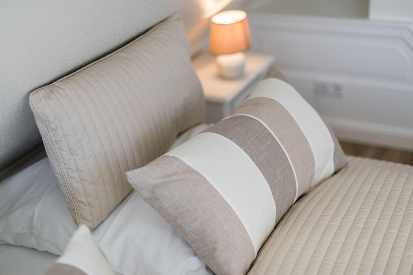 Im Obergeschoss empfängt Sie der Masterbedroom mit Doppelbett (ca. 1,80 x 2,00 m) und En-Suite Bad mit Badewanne und WC. Darüber hinaus steht Ihnen ein weiteres Schlafzimmer mit 2 Einzel Boxspringbetten zur Verfügung, die bei Bedarf auch zu einem Doppelbett (ca. 1,80 x 2,00 m) zusammengestellt werden können. Benachbart finden Sie ein großes Bad mit Dusche, WC und Waschmaschine vor.
