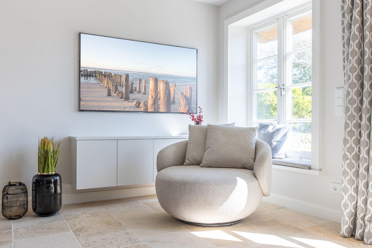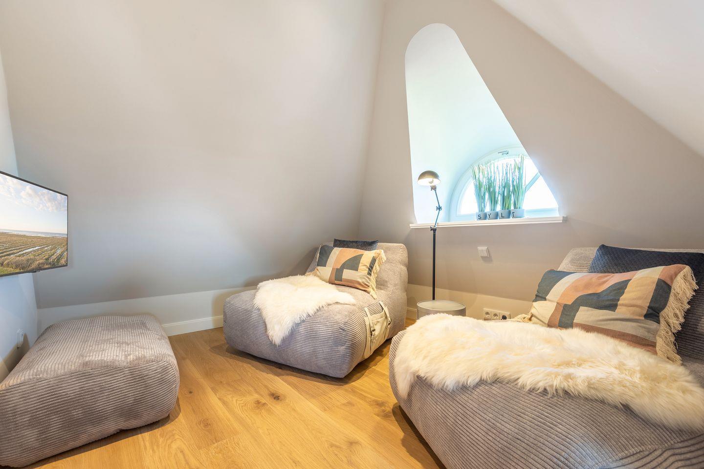 DG: zwei Loungesessel mit TV und Arbeitsplatz mit Schreibtisch