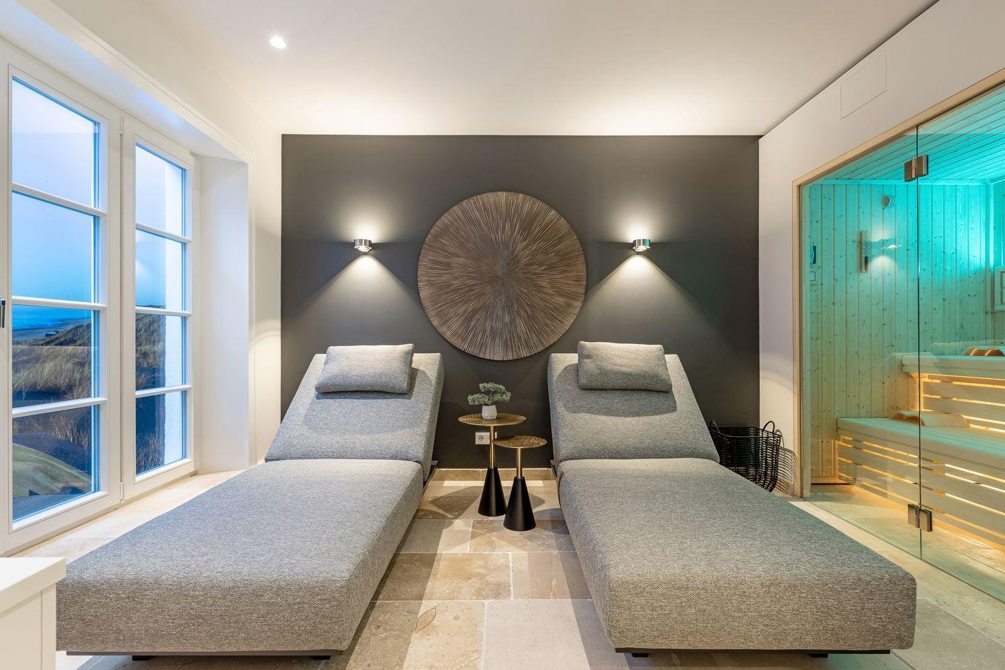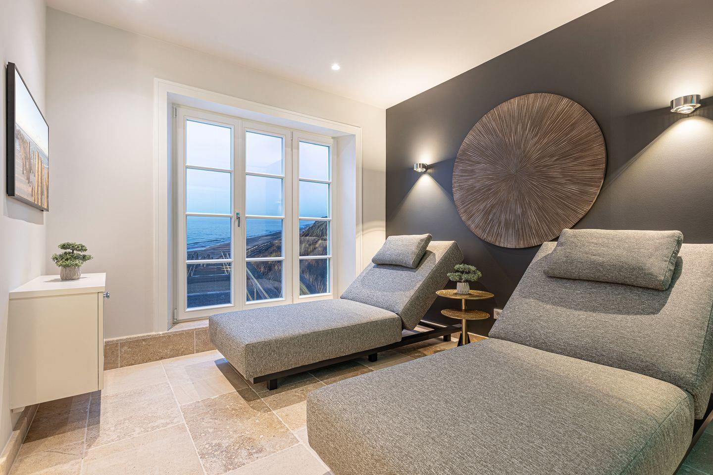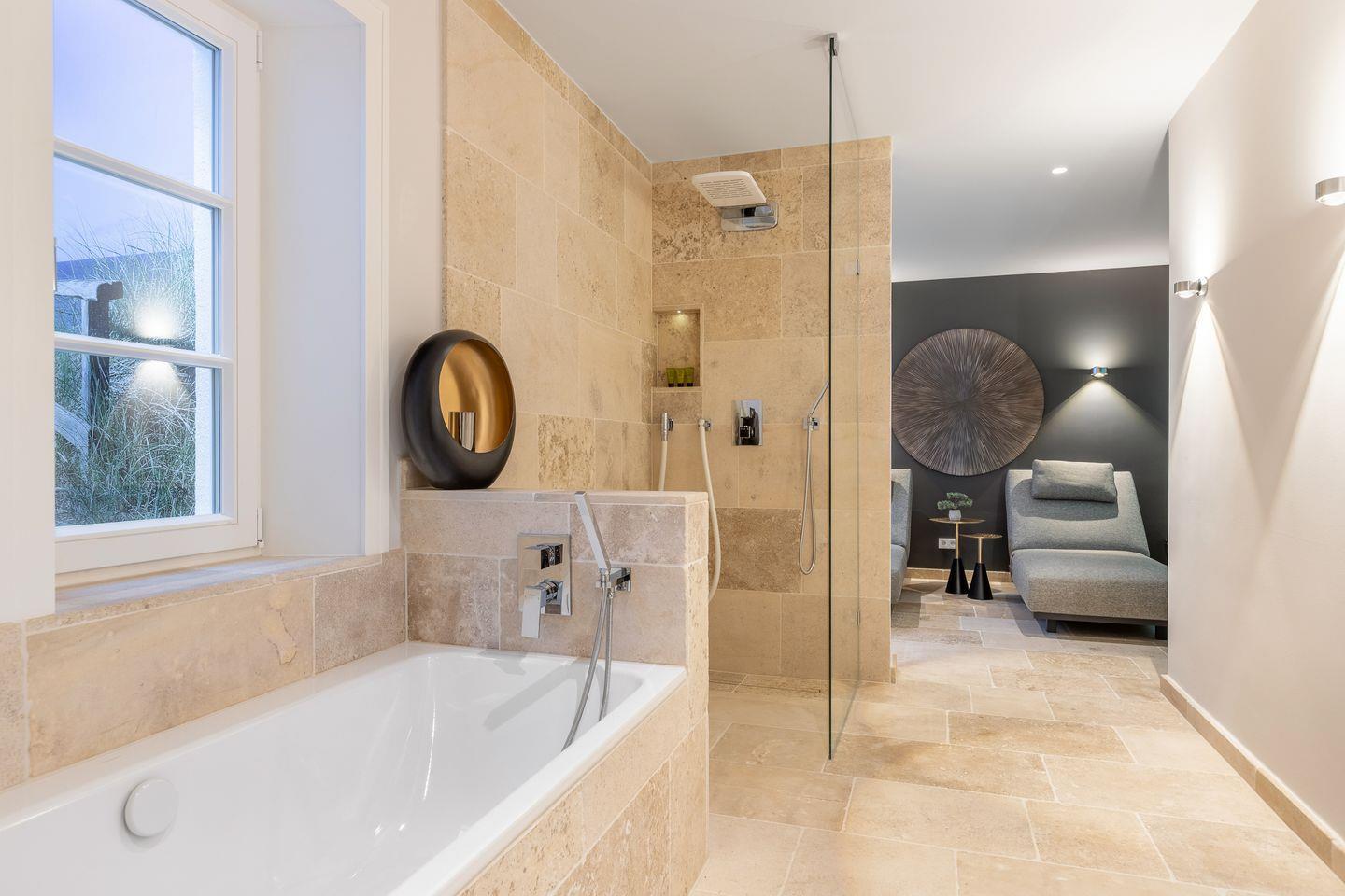 UG: ein Schlafzimmer mit Doppelbett (180 x 200 cm) und TV, ein großzügiger Wellness- /Badbereich mit Sauna, Ruheliegen, großer Dusche (Schwallbrause und Kneippschlauch), Badewanne und WC. Hauswirtschaftsraum mit Waschmaschine und Trockner.