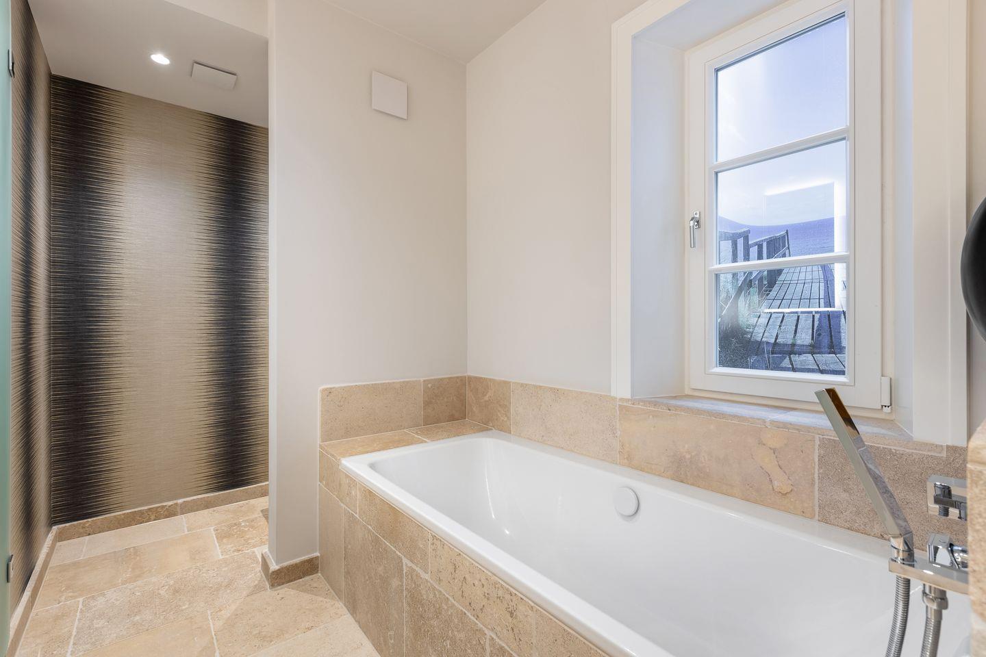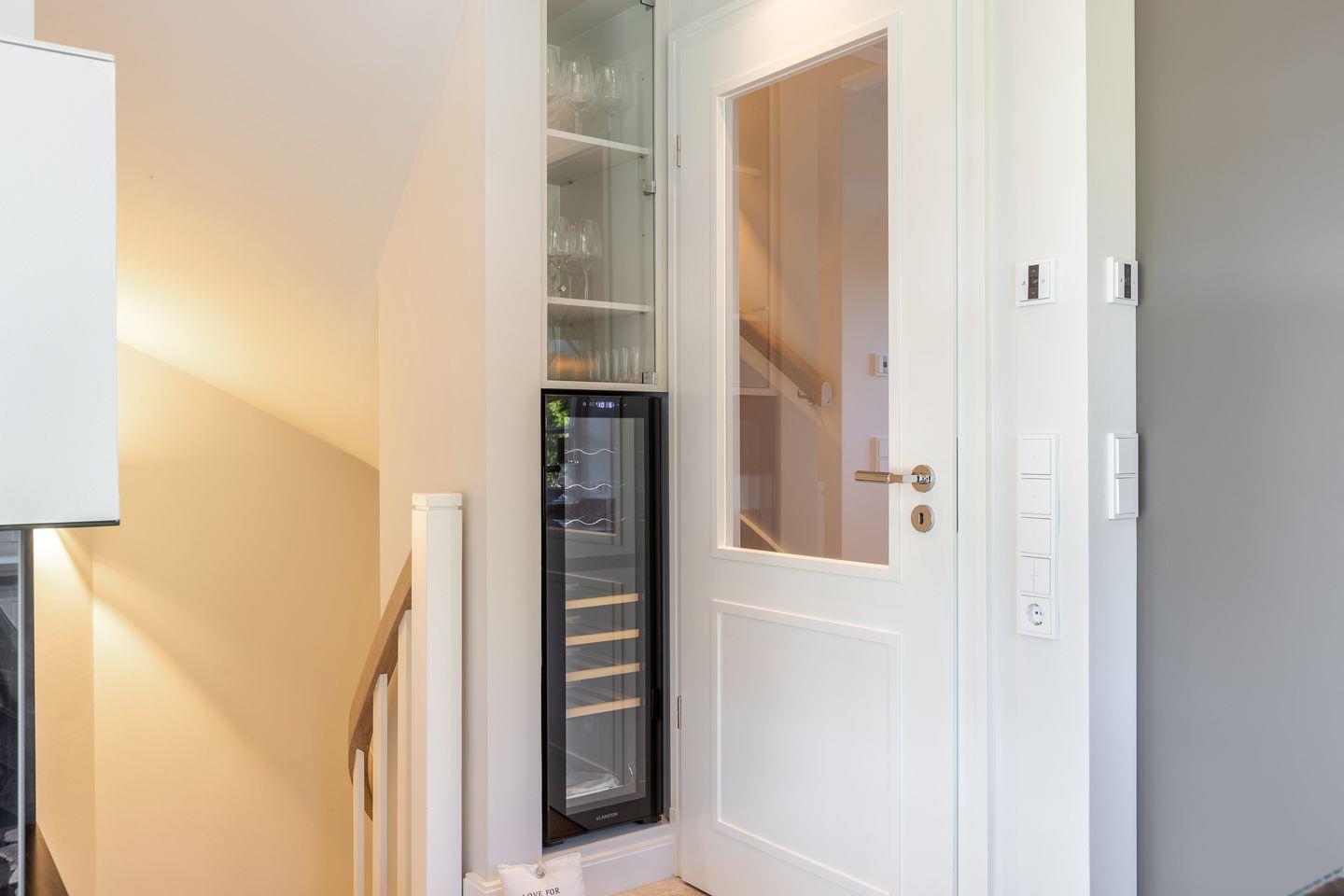 EG: Wohnbereich mit TV und Sonoro Sound System und einem Gaskamin, der Esstisch bietet 6 Personen Platz, die Küche ist sehr gut ausgestattet mit einem Kühlschrank inklusive Eiswürfelbereiter, Induktionskochfeld, Mikrowellen-Backofenkombination, Filter- und Nespressokaffeemaschine und Geschirrspülmaschine, die Terrasse ( Südausrichtung mit Garten ) hat einen Strandkorb, einen Tisch und Stühle, im Erdgeschoß befindet sich noch ein Gäste-WC