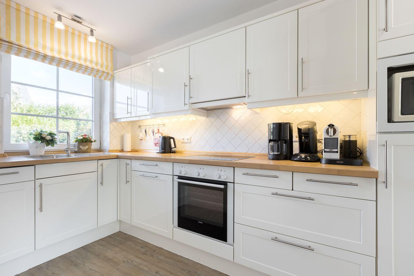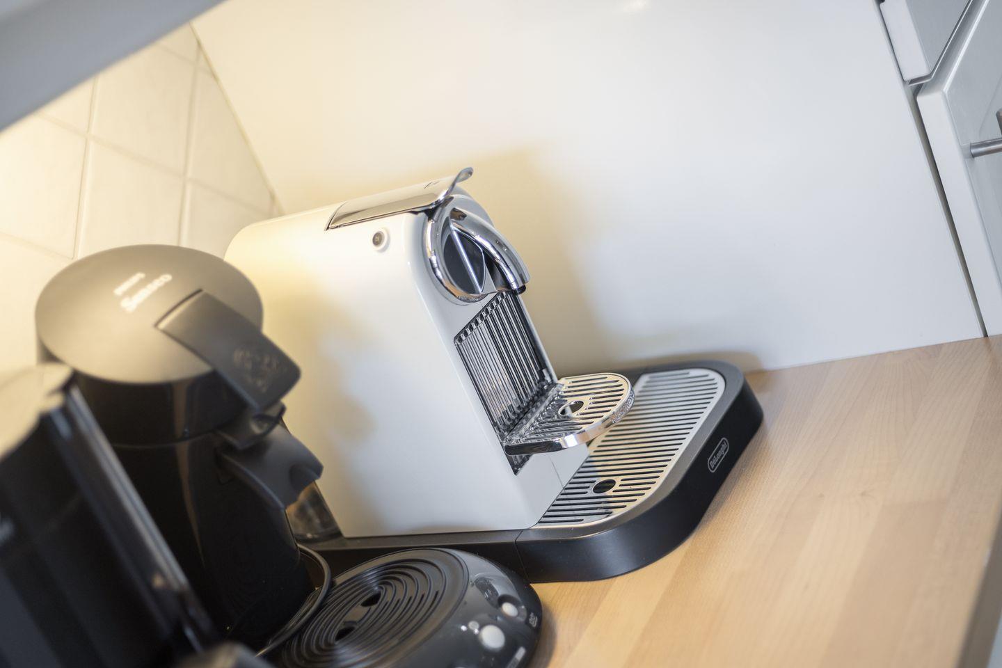 Küche mit Backofen, Mikrowelle, Geschirrspüler, Kühl/Gefrierkombi, Espresso- und Senseo-Kaffeemaschine, Heisluftfritteuse.