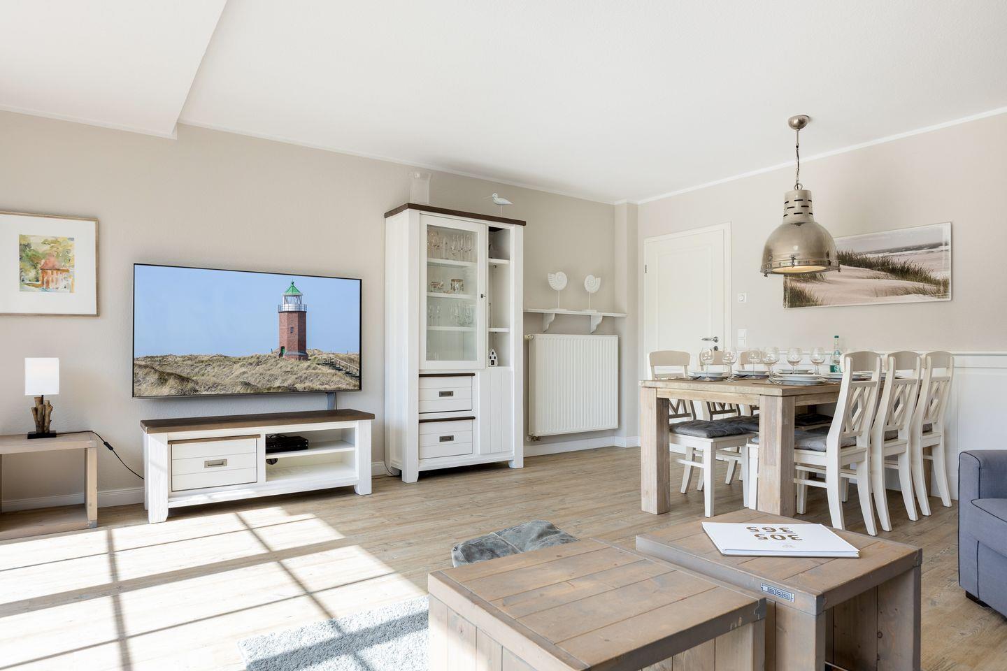 Erdgeschoss: großzügiges Wohnzimmer, geschmackvoll möbliert (in 2025 neue Sitzgarnitur) mit moderner Ausstattung (u. a. 65er Flatscreen, Telefonflatrate Inland, WLAN in allen Etagen);