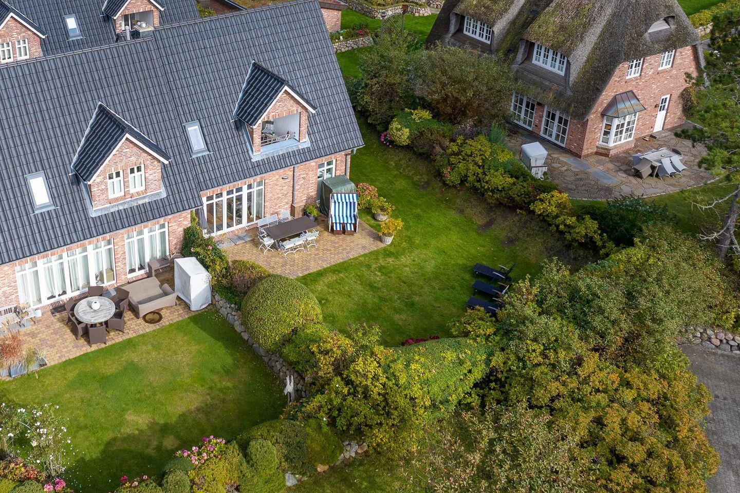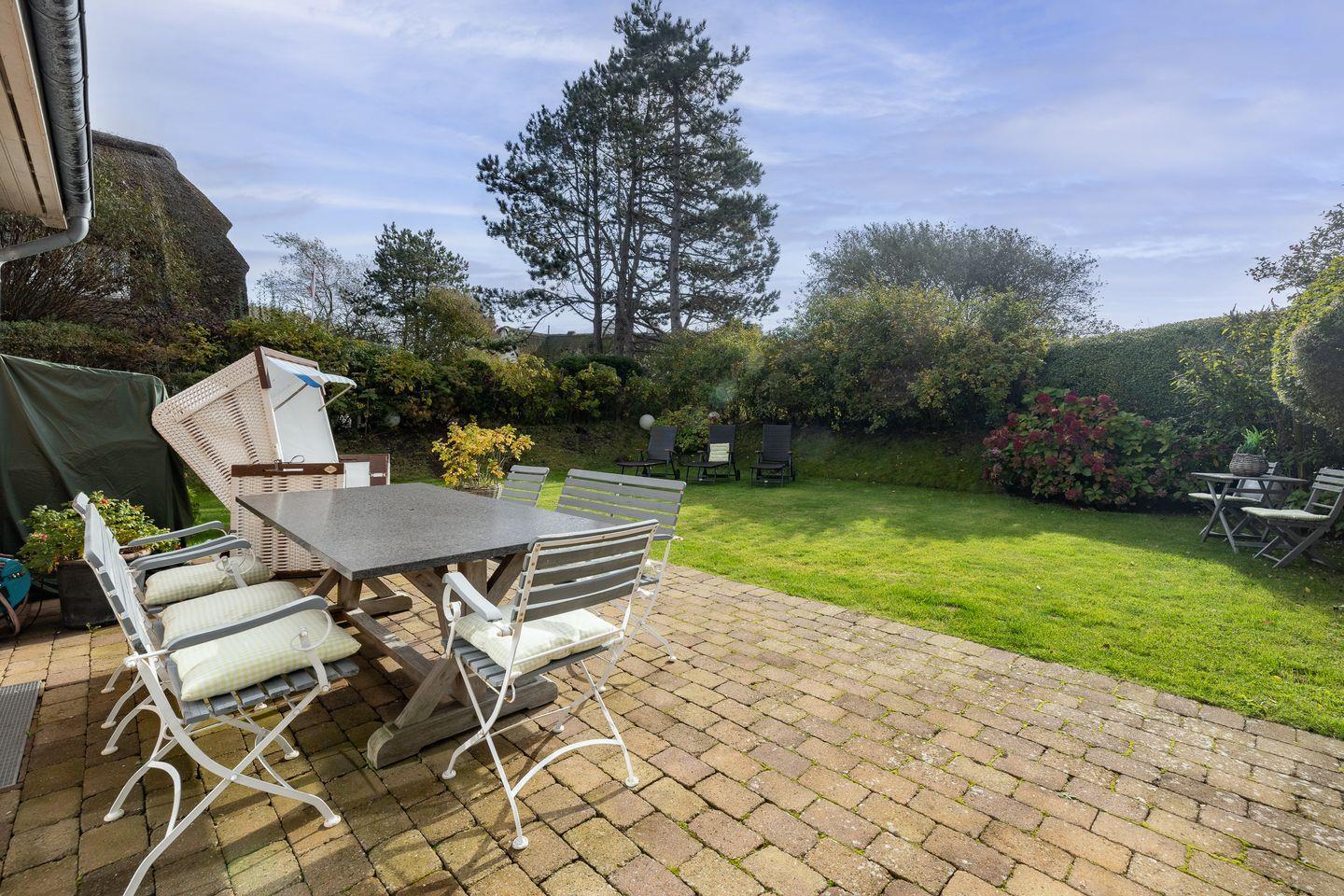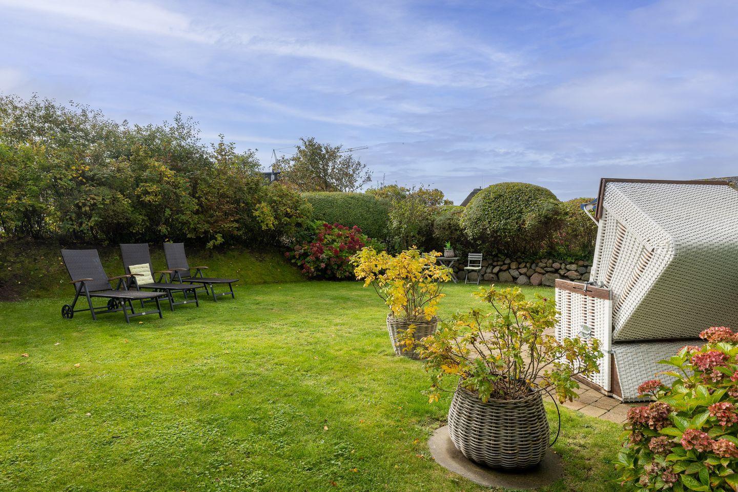 Warum bei schönem Wetter nicht draußen Frühstücken ? Ihre große Terrasse ist ein Traum und die Morgensonne zaubert Ihnen sogar Sonnenstrahlen auf Ihren Open Air Frühstückstisch. Wertiges Gartenmobiliar und Strandkorb stehen Ihnen natürlich ebenfalls zur Verfügung (ca. April-Oktober). Ihr eigenes, großzügiges Süd-/Ostgrundstück lässt Sie die Sylter Sonne ausgiebig genießen und Ihre Kids können nach Herzenslust Toben und Spielen.