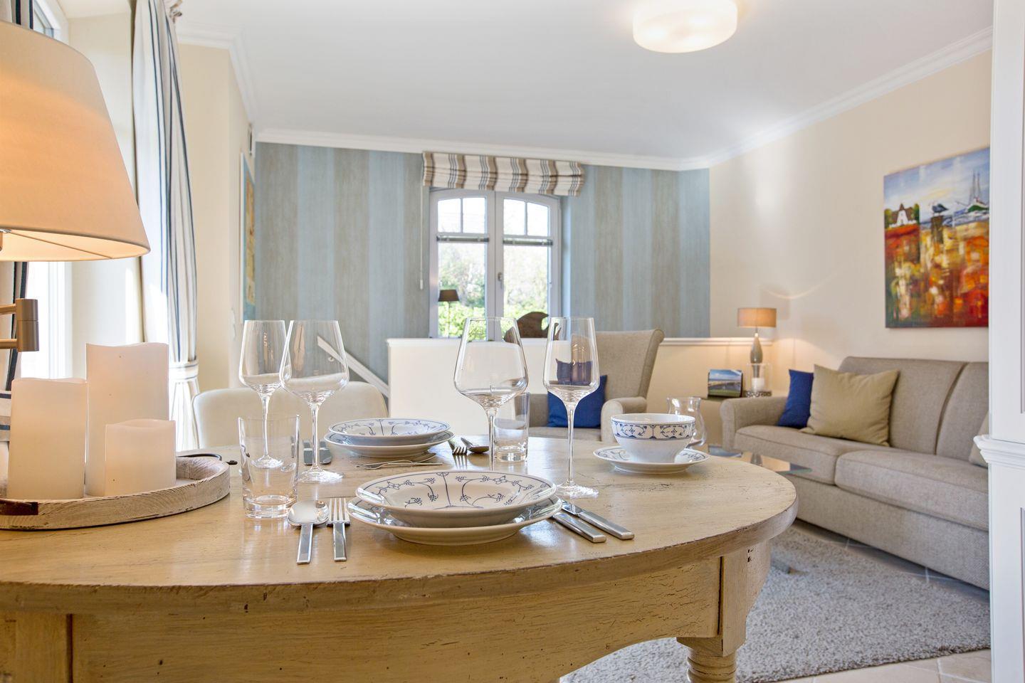 EG: Wertig und sehr geschmackvoll gestalteter Wohnbereich mit gemütlicher Sitzecke, Flat-TV, Radio. Integrierte Luxusküche mit Geschirrspüler, Microwelle und Backofen. Schöne Westterrasse mit Gartenmobiliar (ca. von April–Oktober).