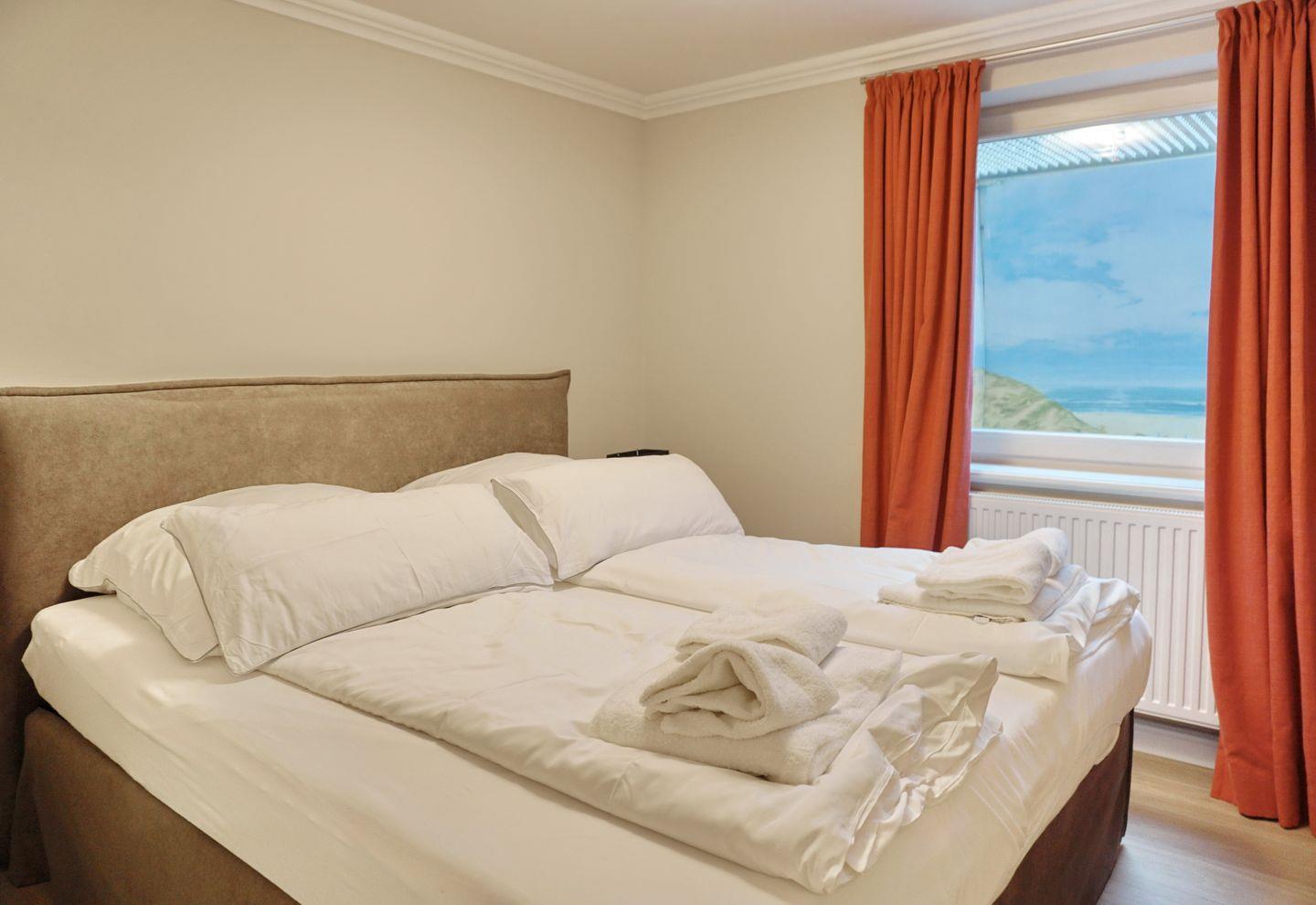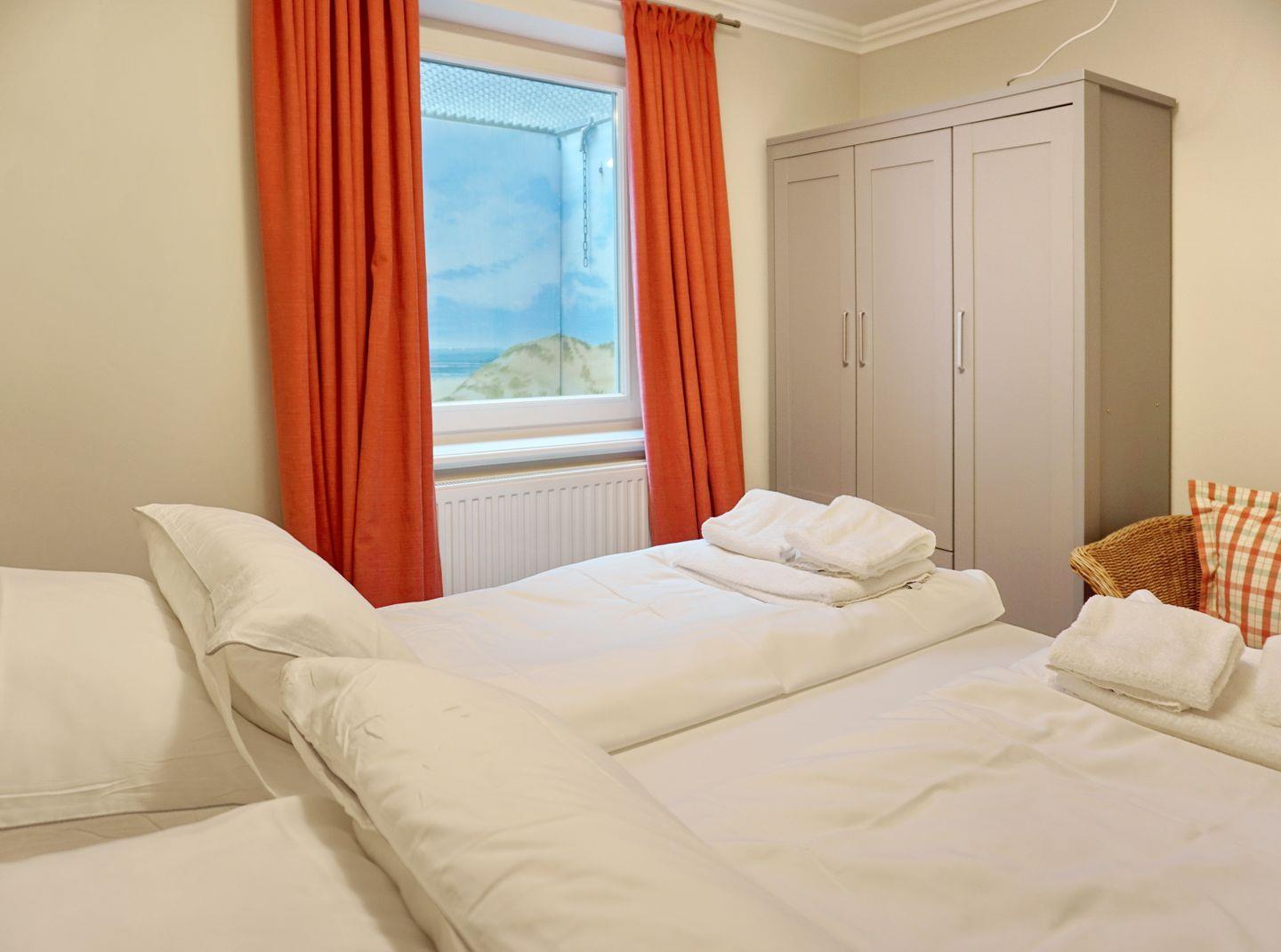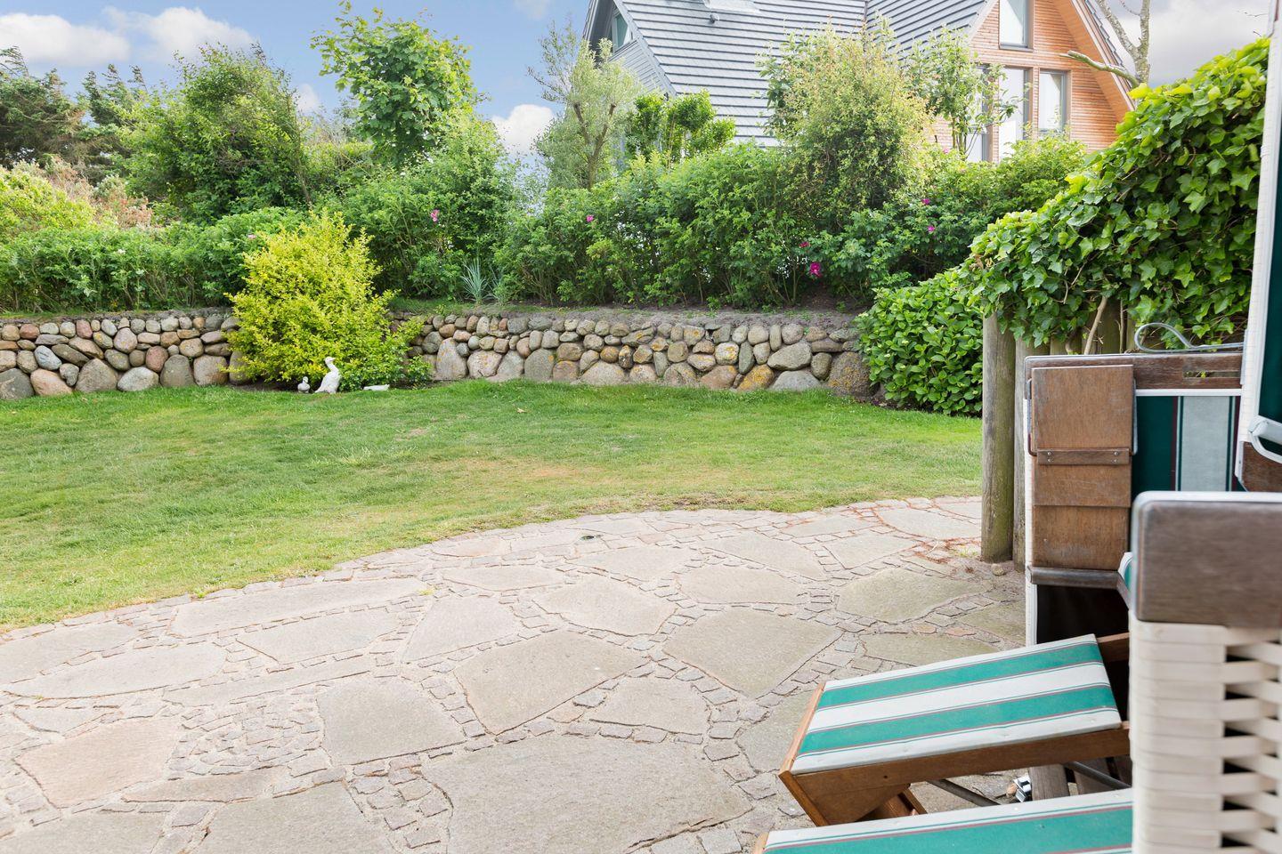 UG: 1 Raum mit Doppelbett (180x200cm) sowie 1 kleiner Schlafraum mit getrennten Betten (90x200cm). Dusche/WC. Sauna mit Dusche/WC. Waschmaschine und Trockner. Sehr attraktive und großzügige Süd-Terrasse mit Strandkorb (ca. von April–Oktober) und Gartenmöbeln. Parkplatz.