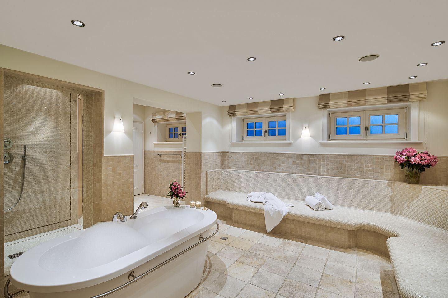 Ein weiteres Highlight des Hauses wartet im Untergeschoss auf Sie: Entspannen Sie in Ihrem privaten Wellnessbereich mit freistehender Badewanne, Sauna, Regendusche, beheizbaren Sitzbänken und WC. Außerdem befinden sich im Untergeschoss ein weiterer Raum mit Doppelbett und angrenzendem Badezimmer und ein Raum mit Einzelbett.