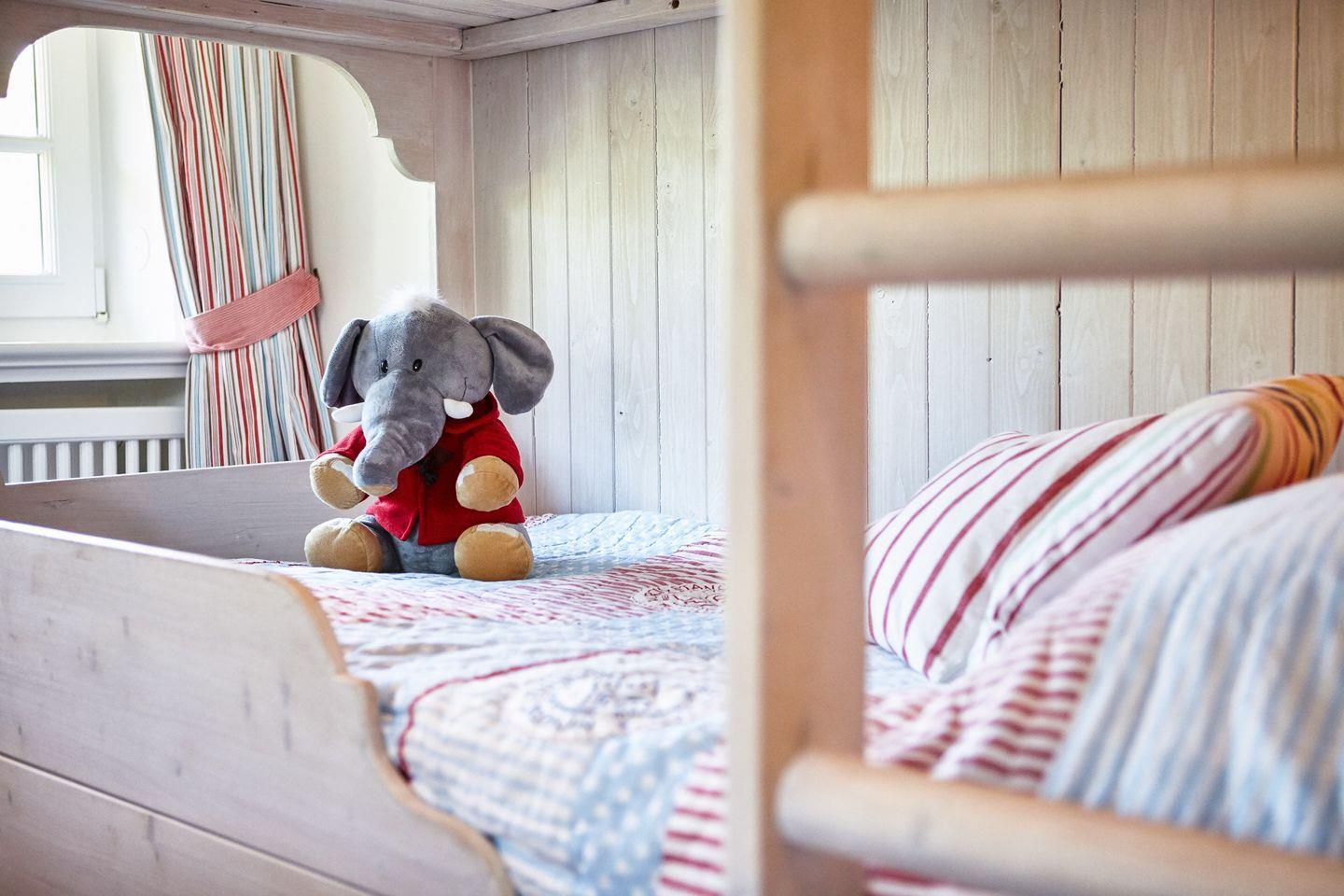 Im Obergeschoss des Hauses finden Sie ein großes, sehr gemütlich eingerichtetes Schlafzimmer mit Doppelbett und großem En Suite Badezimmer mit Dusche, WC und Badewanne, in der es sich wunderbar relaxen lässt. Außerdem befindet sich hier ein weiterer Schlafraum mit zwei Einzelbetten und Duschbad und ein Kinderparadies mit Doppelstockbett zum Träumen.
