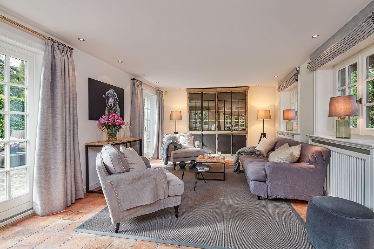 EG: Großer Wohnbereich mit 2 Sofaecken, Flatscreen-TV, offene Küche mit angrenzendem Essbereich, Geschirrspüler, Gasherd. Gäste-WC, Kinderschlafzimmer mit Doppelstockbett und eigenem Badezimmer. Umlaufender Garten mit mehreren möblierten Terrassen.
