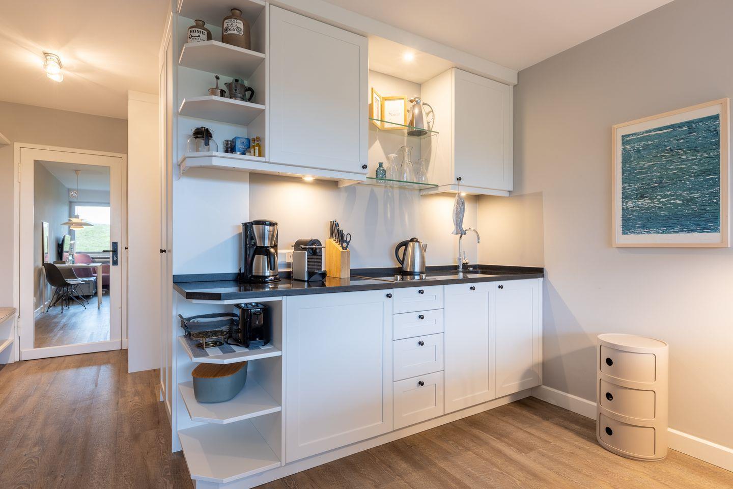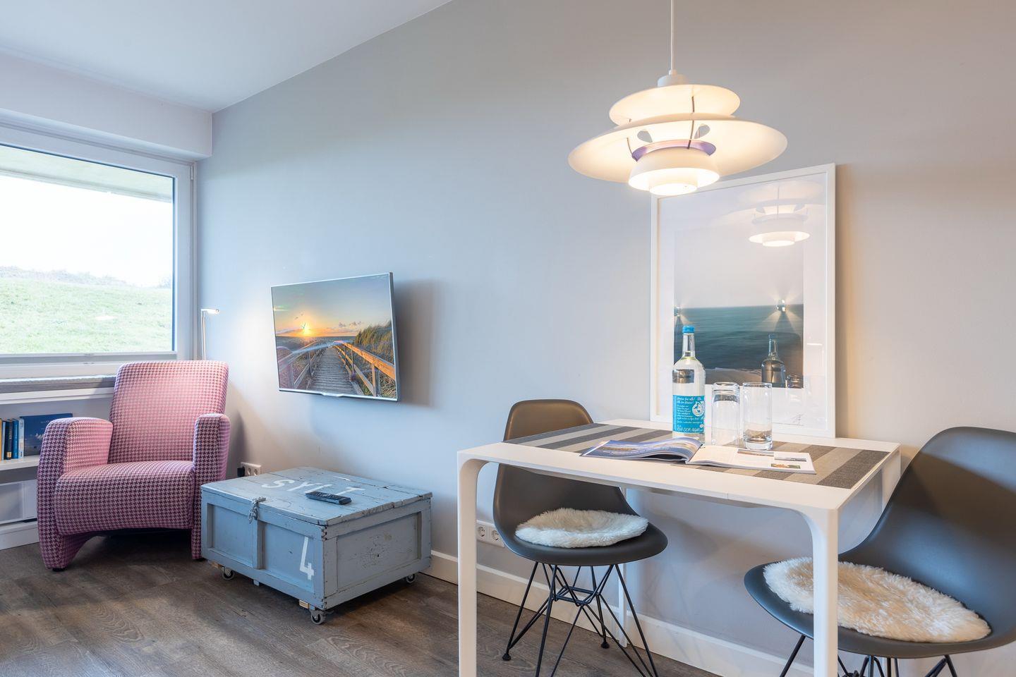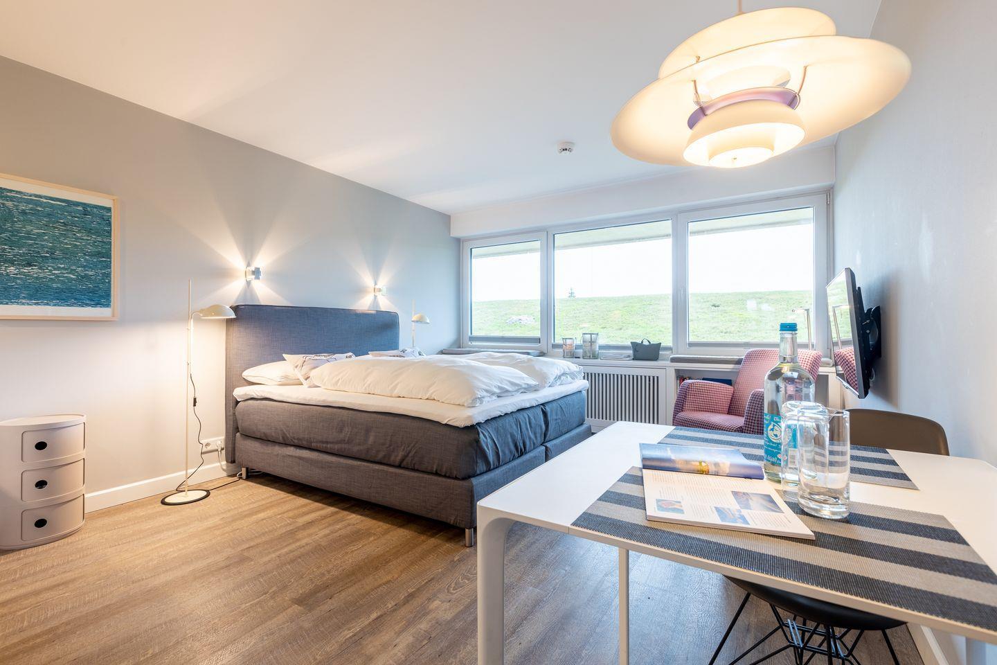 Das lichtdurchflutete 1-Raum-Apartment beeindruckt mit einer durchgehenden Fensterfront, die einen weiten Blick auf die westlich gelegene Düne eröffnet – Sonnenuntergang inklusive. Die Einrichtung in warmen Naturtönen schafft eine behagliche Atmosphäre. Dank seiner geschützten Lage, leicht versetzt im Souterrain und unmittelbar an der Düne, bleibt das Domizil im Sommer angenehm kühl und sorgt im Winter für wohlige Wärme.