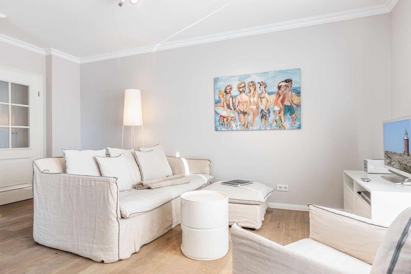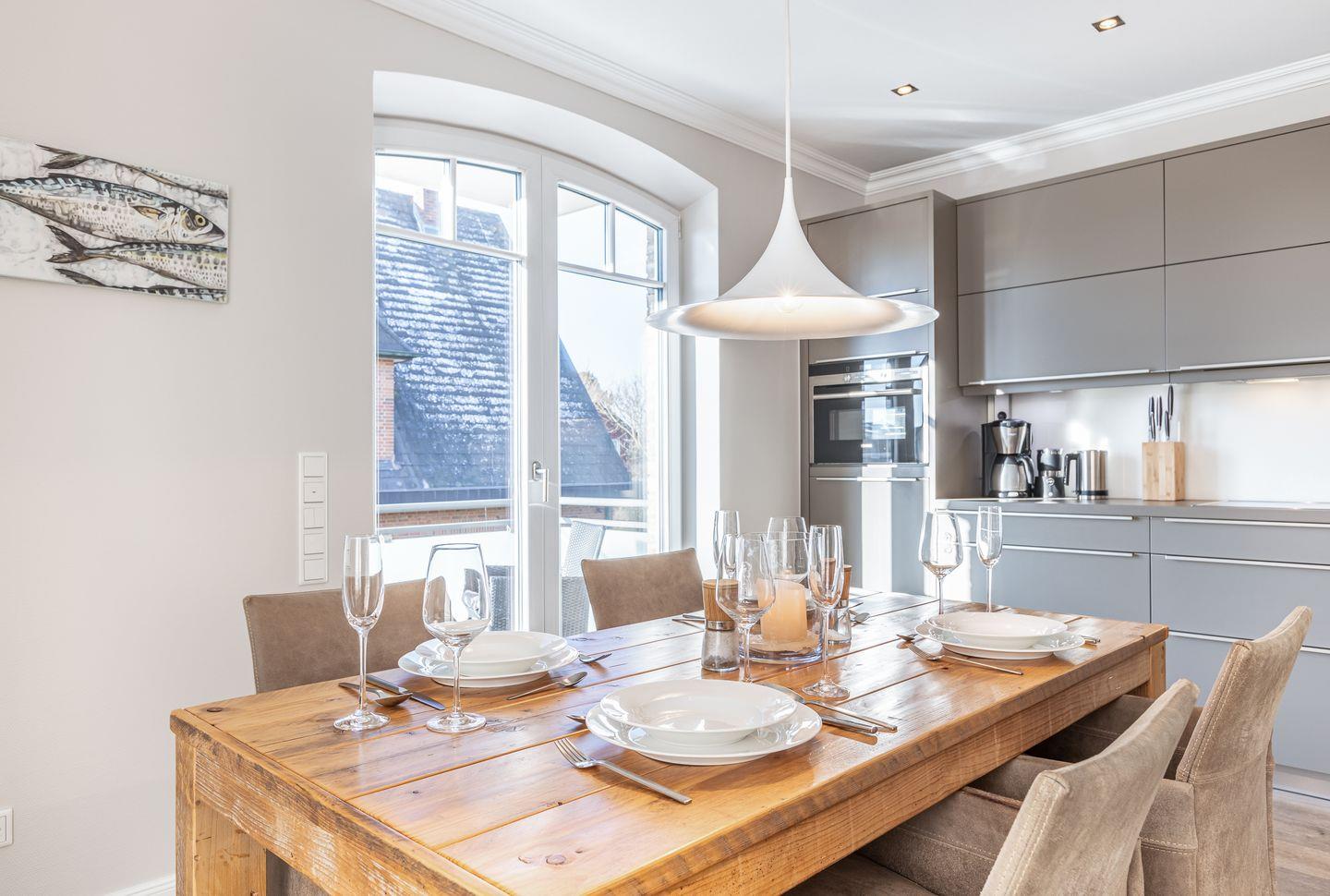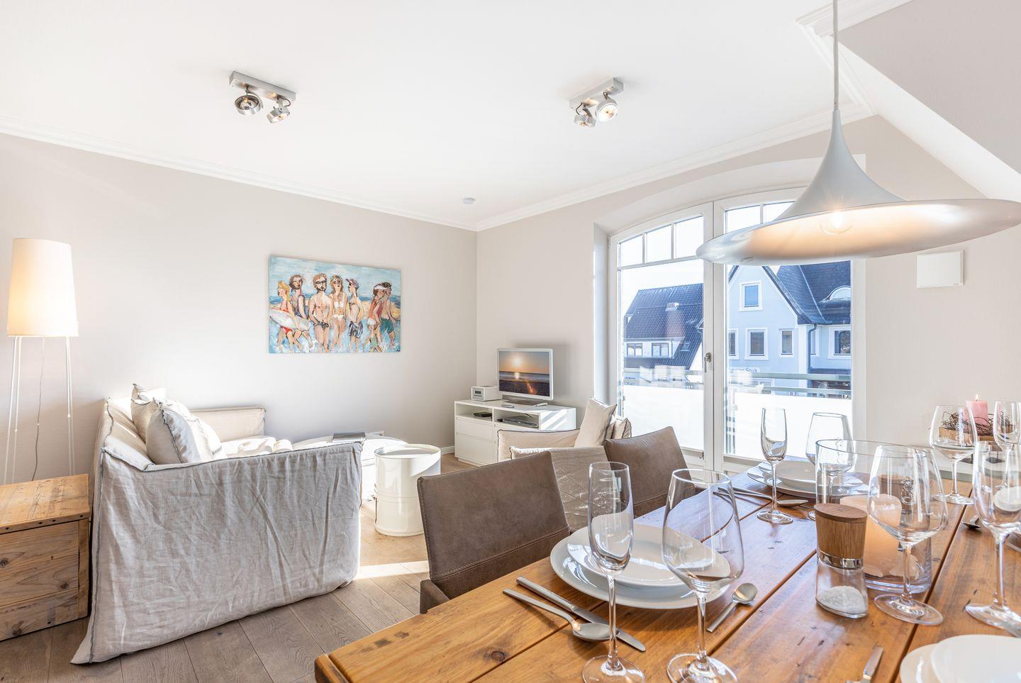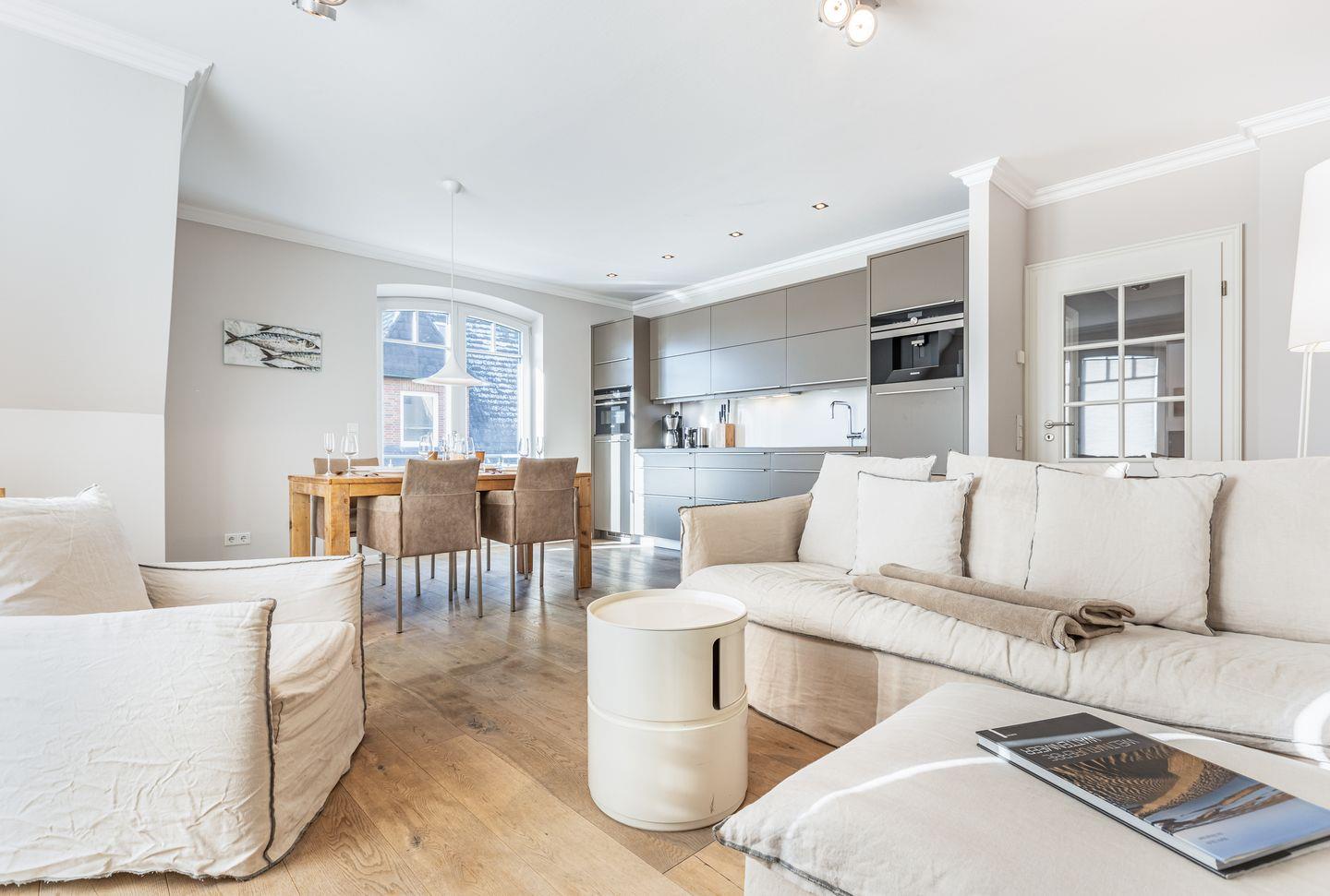 Der offen gestaltete Wohnbereich empfängt Sie mit einem gemütlichen Couchbereich mit Sessel, einem Essbereich für bis zu vier Personen und einer modernen, offenen Küchenzeile, die top-ausgestattet ist. Vom Wohnbereich aus erreichen Sie Ihren möblierten Balkon, auf dem Sie die Sylter Sonnenstunden genießen können.