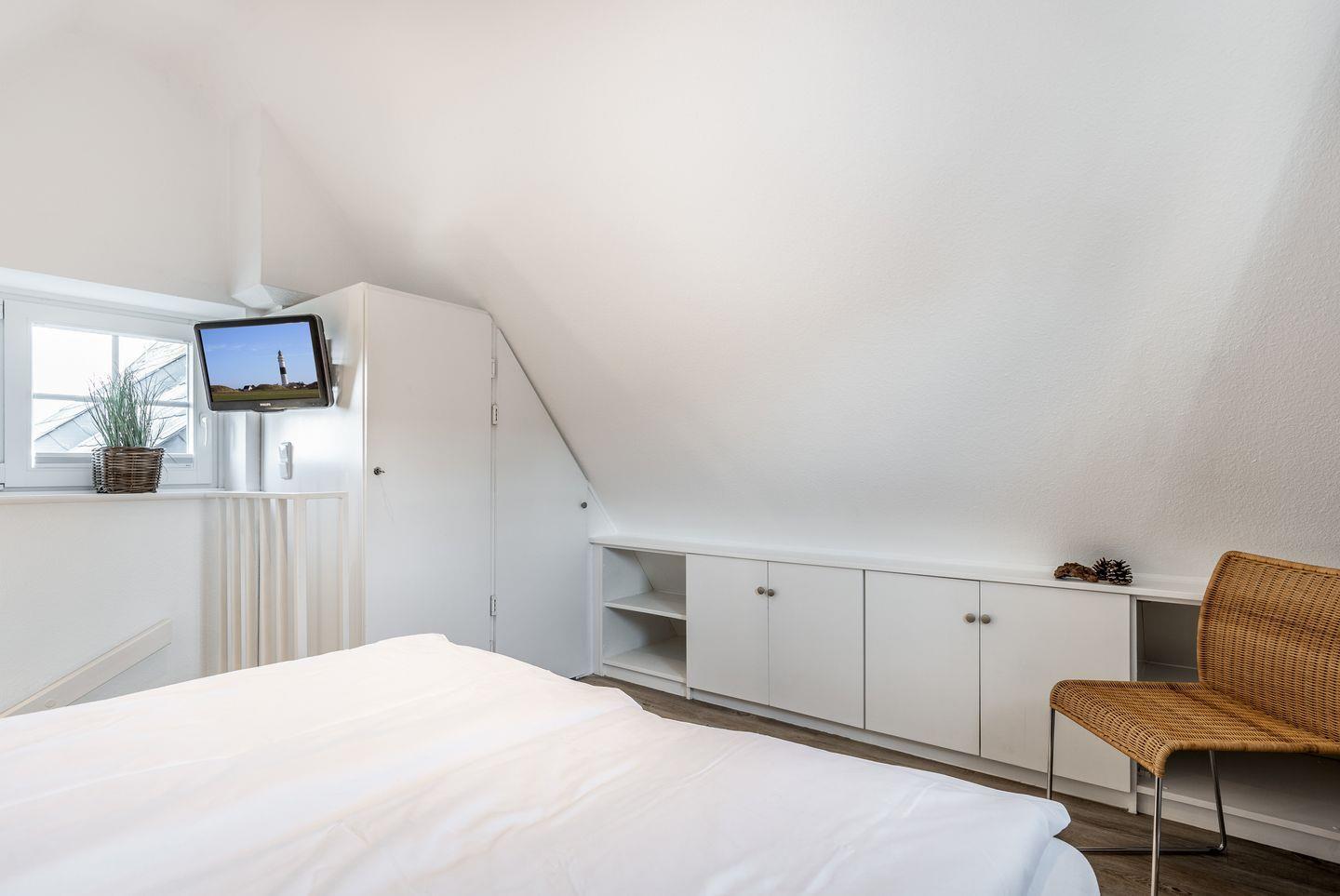 Im Dachgeschoss der Wohnung erwartet Sie ein helles Schlafzimmer mit Doppelbett (160x200cm) und Flatscreen-TV.