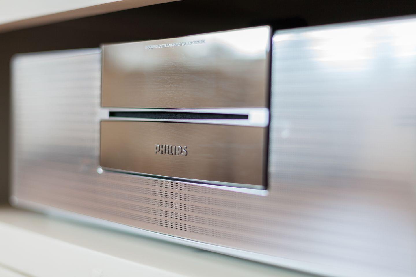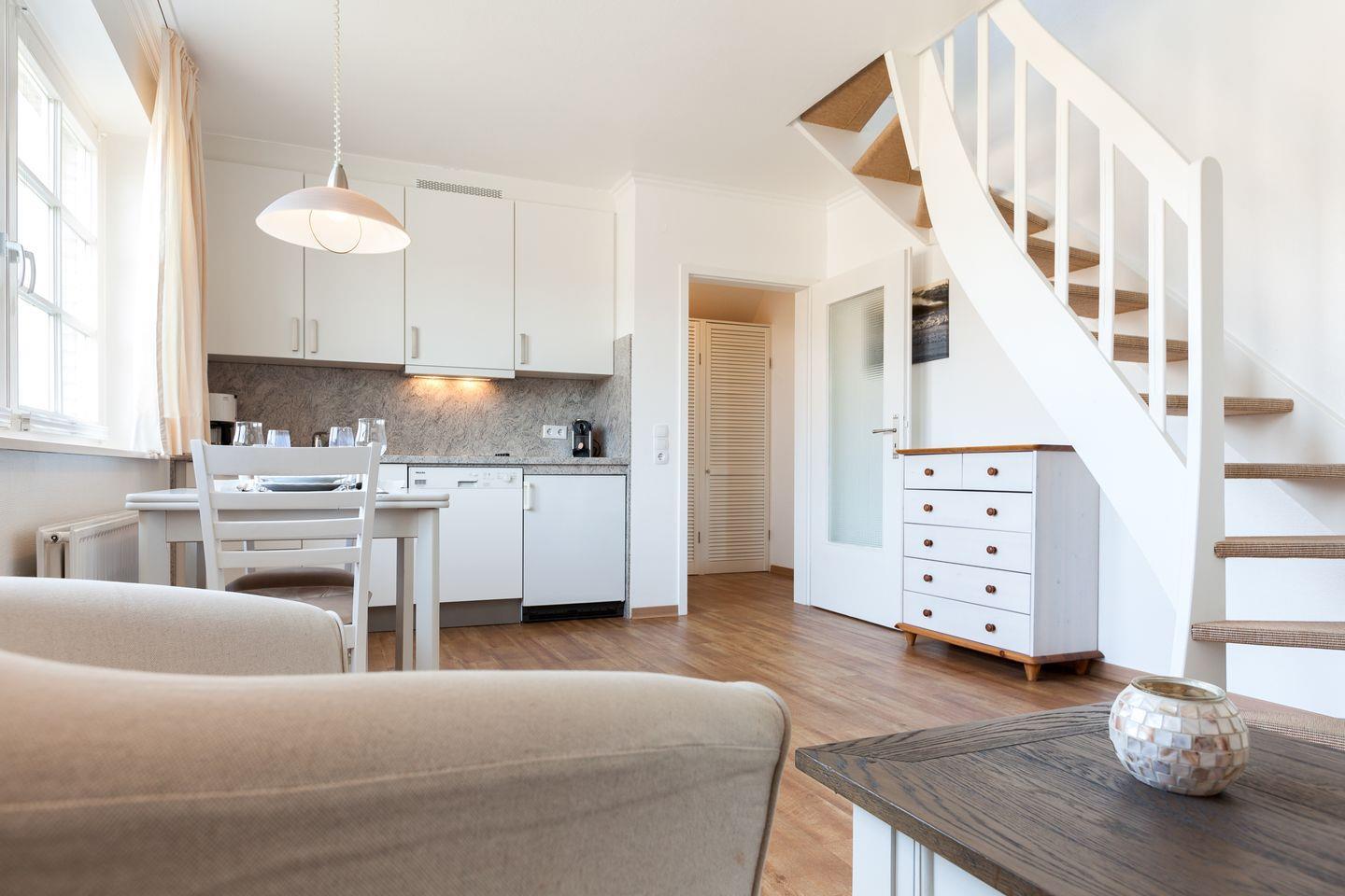OG: Wohnraum mit Flatscreen-TV, iPod-Dockingstation, Radio, DVD-Player, CD-Player, integrierte Küchenzeile mit Geschirrspüler und Espressomaschine, Dusche/WCm, Terrasse mit Gartenmöbeln und Strandkorb (ca. Apr. - Okt.)