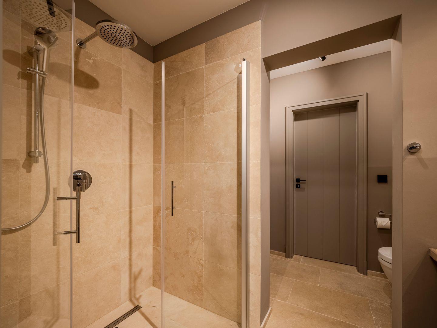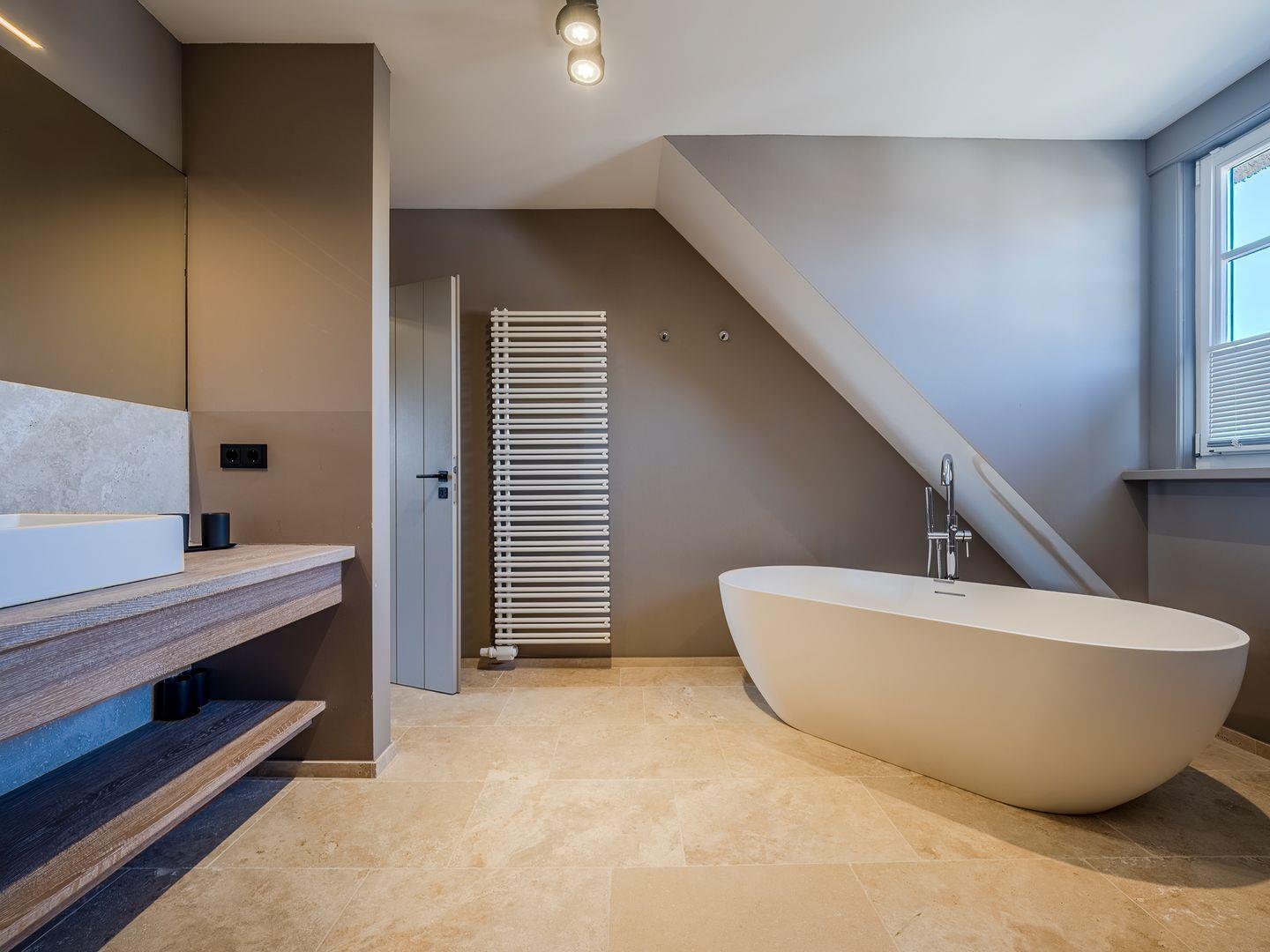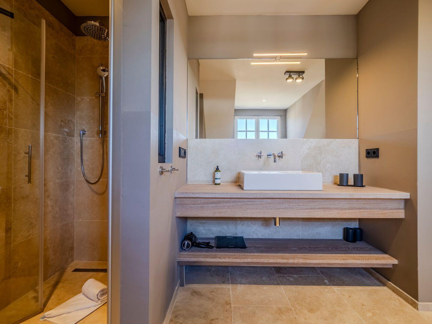 Zwei Badezimmer mit bodengleicher Regendusche, Handtuchtrockner und Fenster. Eines der Badezimmer verfügt zusätzlich über eine freistehende Badewanne, Radio und Meerblick.