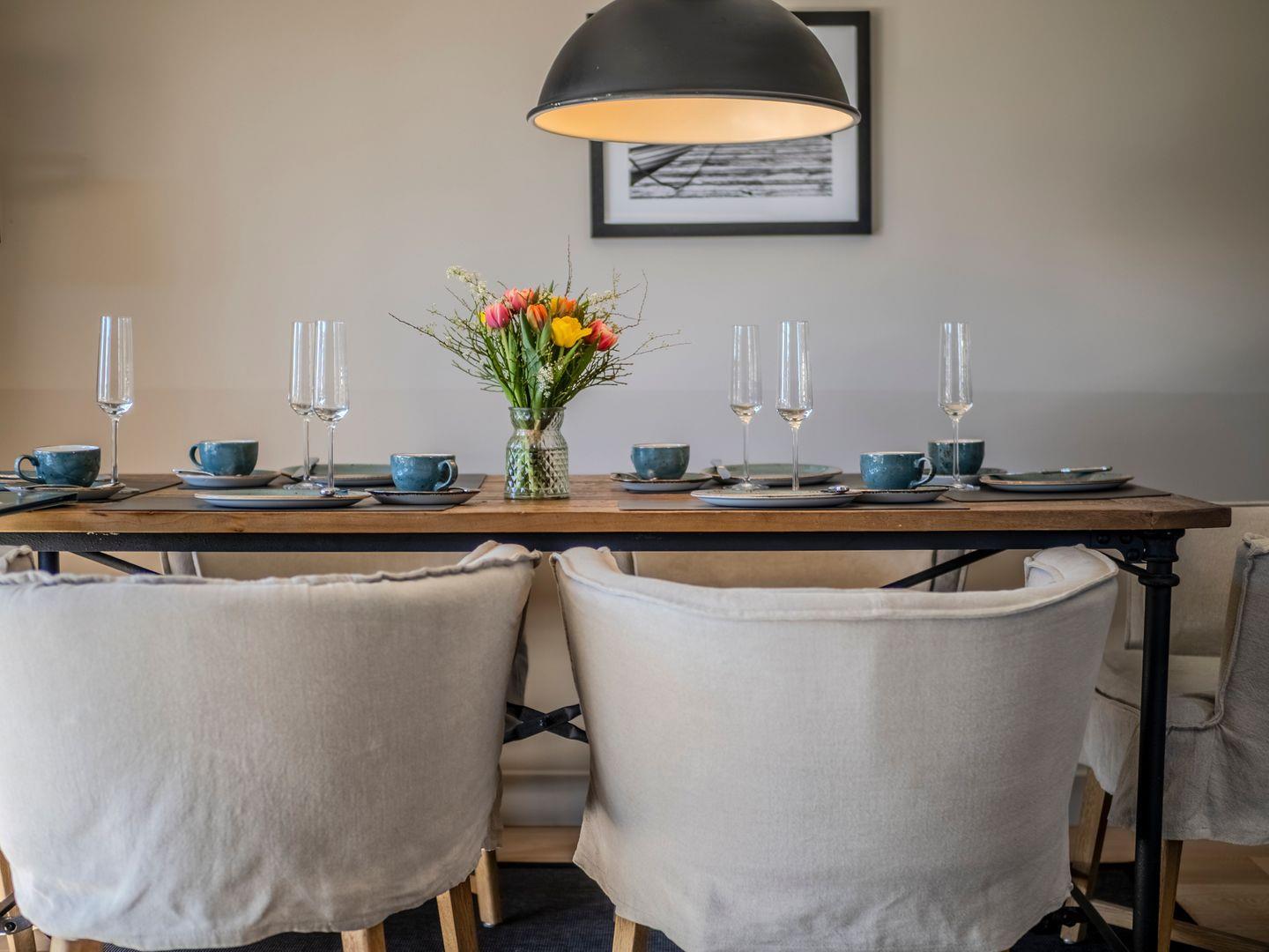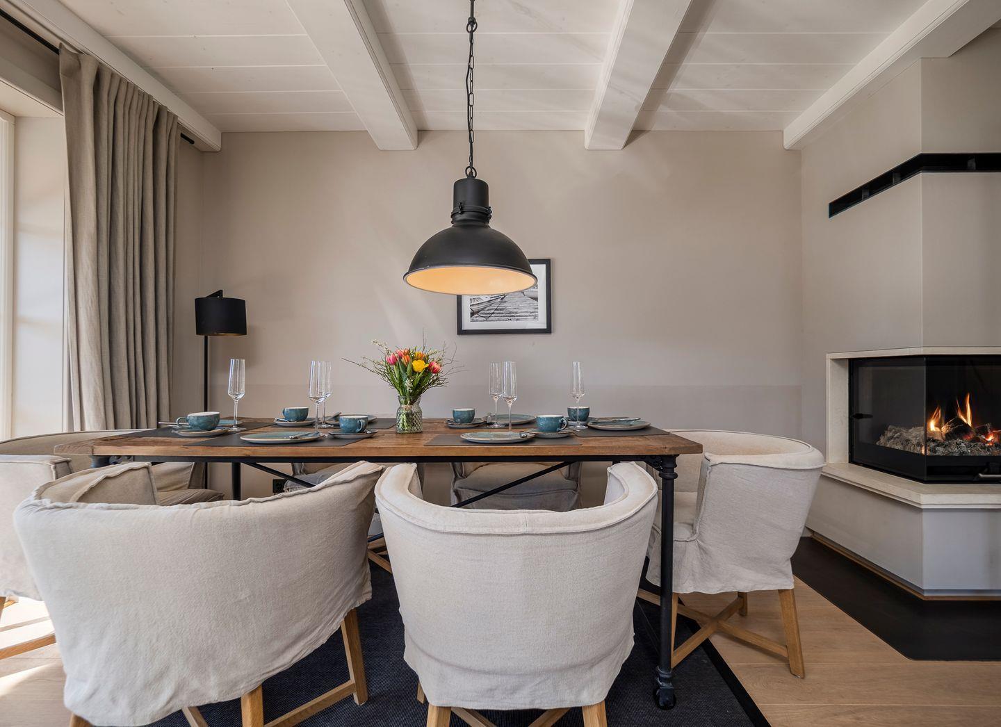 Im Erdgeschoss ist vom Flur aus die geschlossene Küche mit kleinem Essbereich und das separate Wohn- und Esszimmer begehbar. Die moderne und hochwertig ausgestattete Küche lässt mit Induktionsherd und integrierter Dunstabzugshaube, Mikrowelle mit Backofen-Funktion, Weinkühlschrank, Nespresso-Kapselmaschine und SodaStream Wassersprudler keine Wünsche offen. Ein gemütlicher Wohnraum mit freiem Blick in den Garten verfügt über einen Sofa- und Essbereich, die mit Kamin und TV zum Verweilen einladen.
