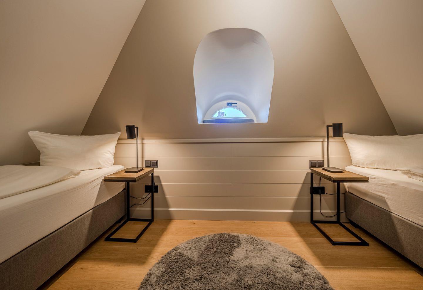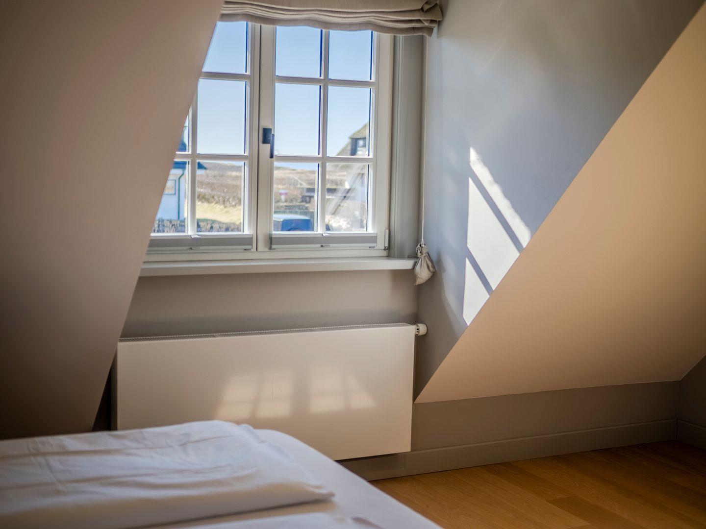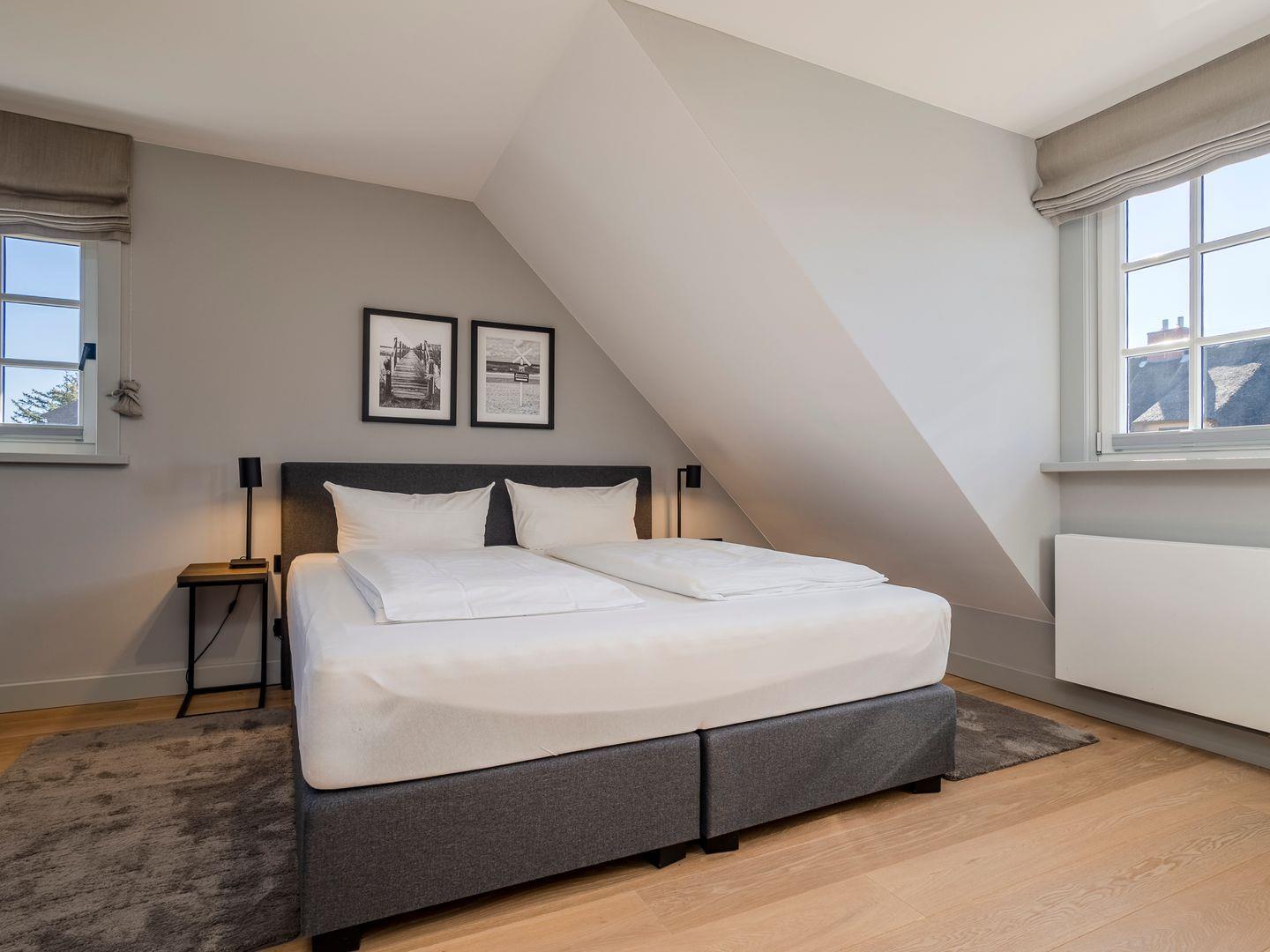 Zwei Doppelschlafzimmer und ein Schlafzimmer mit zwei Einzelbetten (80 cm x 200 cm/unter Dachschrägen - steile Treppe), die sich auch mittig zusammenstellen lassen. Alle Schlafzimmer verfügen über ein TV-Gerät, Hotelsafe, Verdunkelungsmöglichkeiten für die Fenster und Stauraum in Form von Kommoden, Garderoben oder Einbauschränken für Kleidung und persönliche Dinge. Das größte Schlafzimmer bietet einen kleinen Schreibbereich, der auch mobiles Arbeiten im Urlaub ermöglicht, einen begehbaren Kleiderschrank und Meerblick.