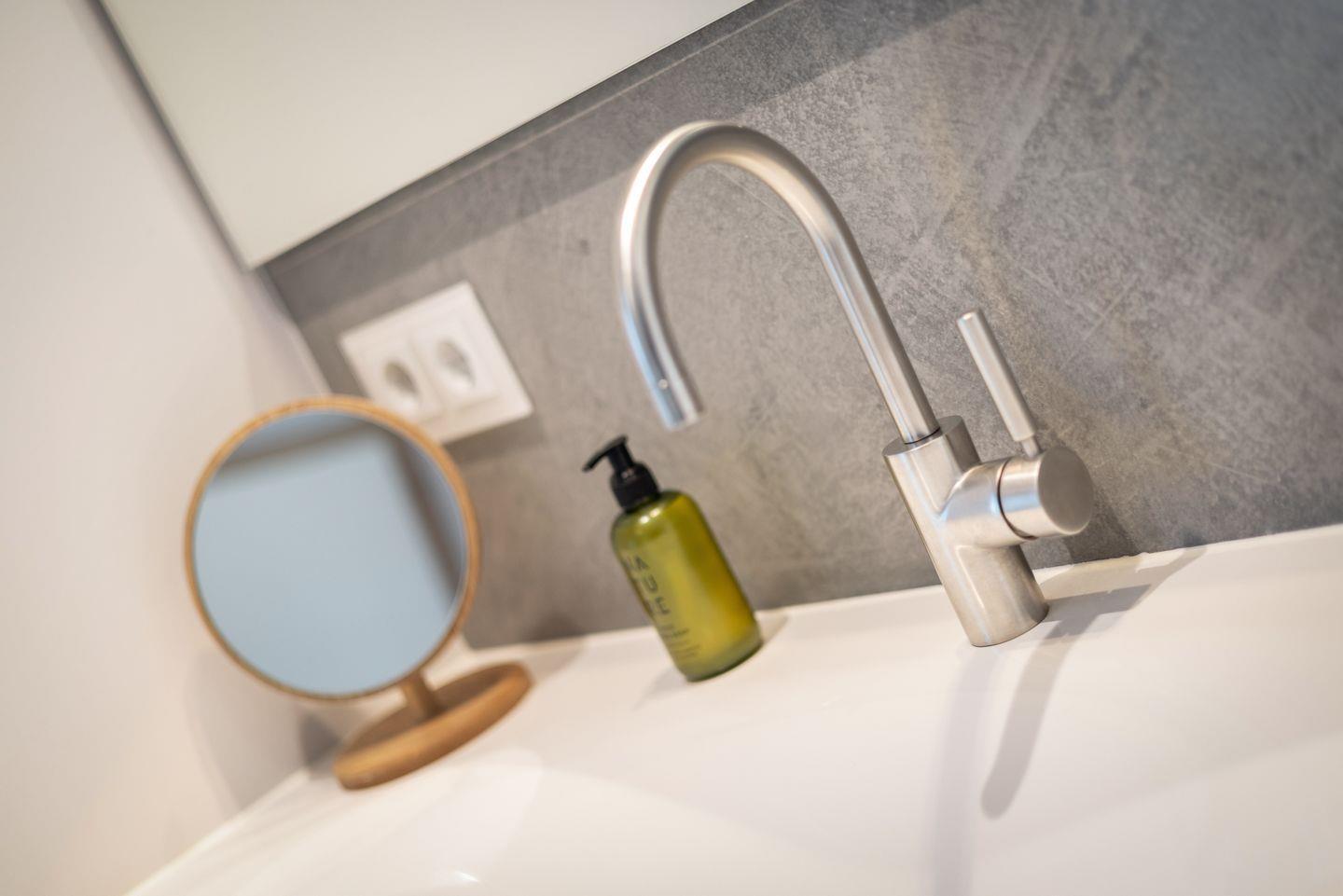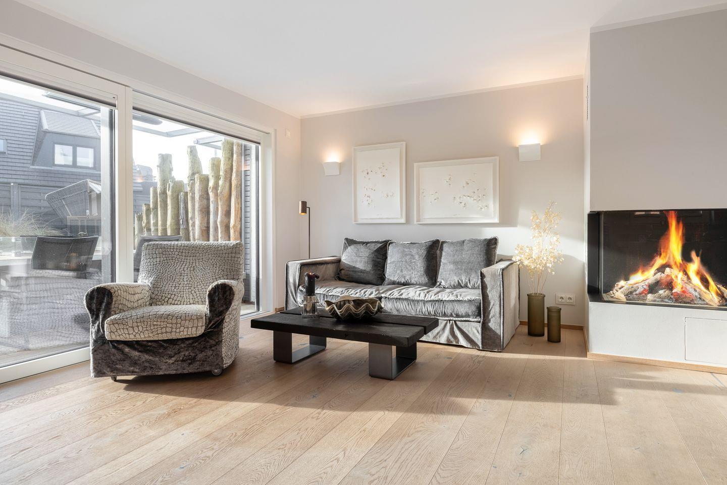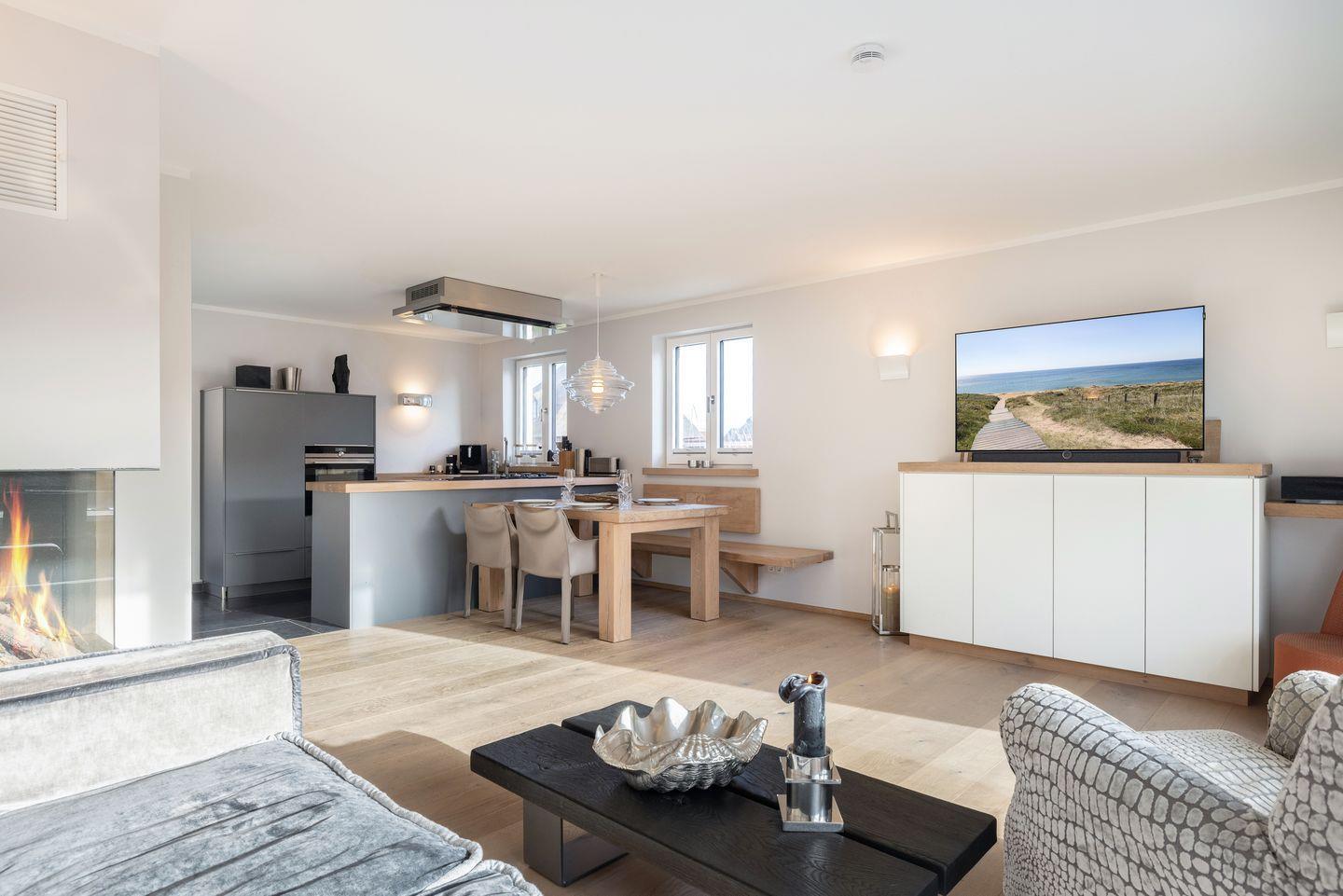 EG: Wohnzimmer mit ausfahrbarem Loewe-TV und Naim Mu-so 2 Anlage, Gaskamin, Esstisch, Küchenzeile mit Induktionskochfeld, Gasherd und Teppanyaki-Platte, Mikrowellen-Backofenkombination, Filterkaffeemaschine, Geschirrspülmaschine, Jura Kaffeevollautomat, Terrasse mit Strandkorb und Gartenmöbeln (April-Oktober), Gäste-WC