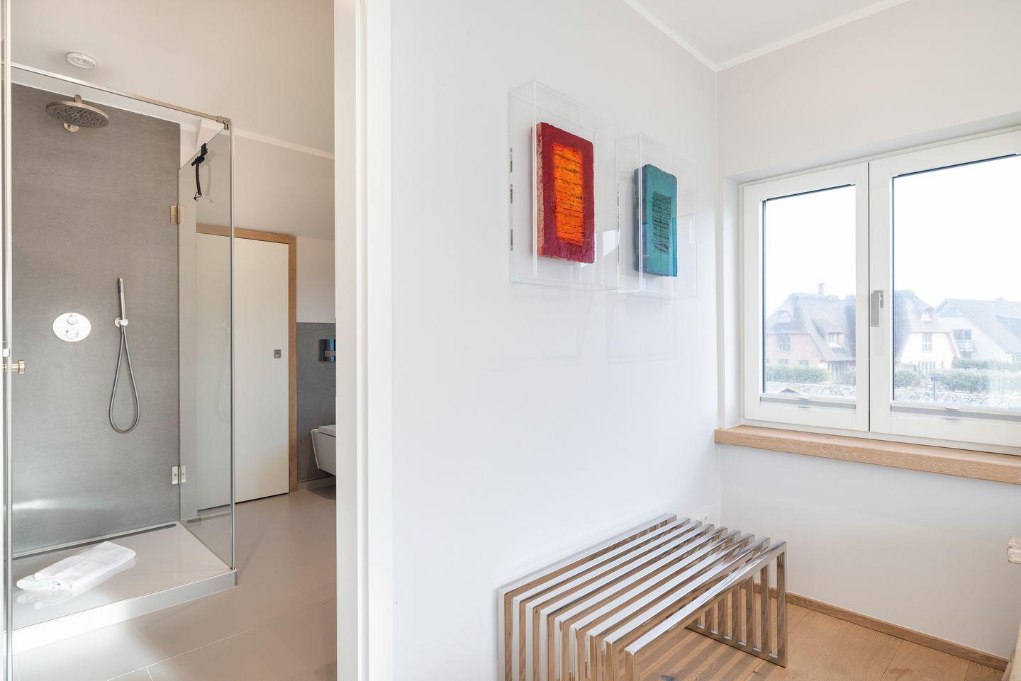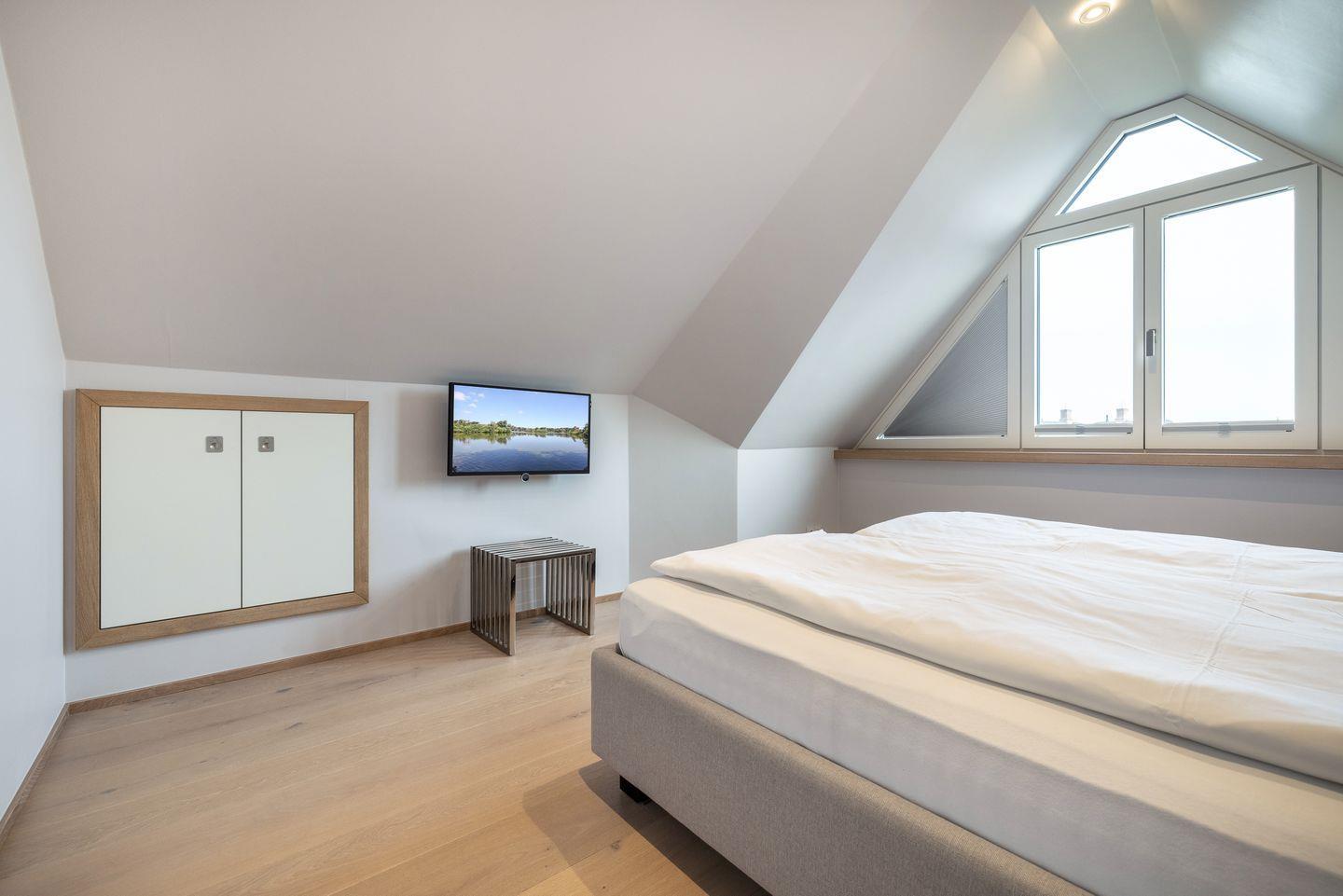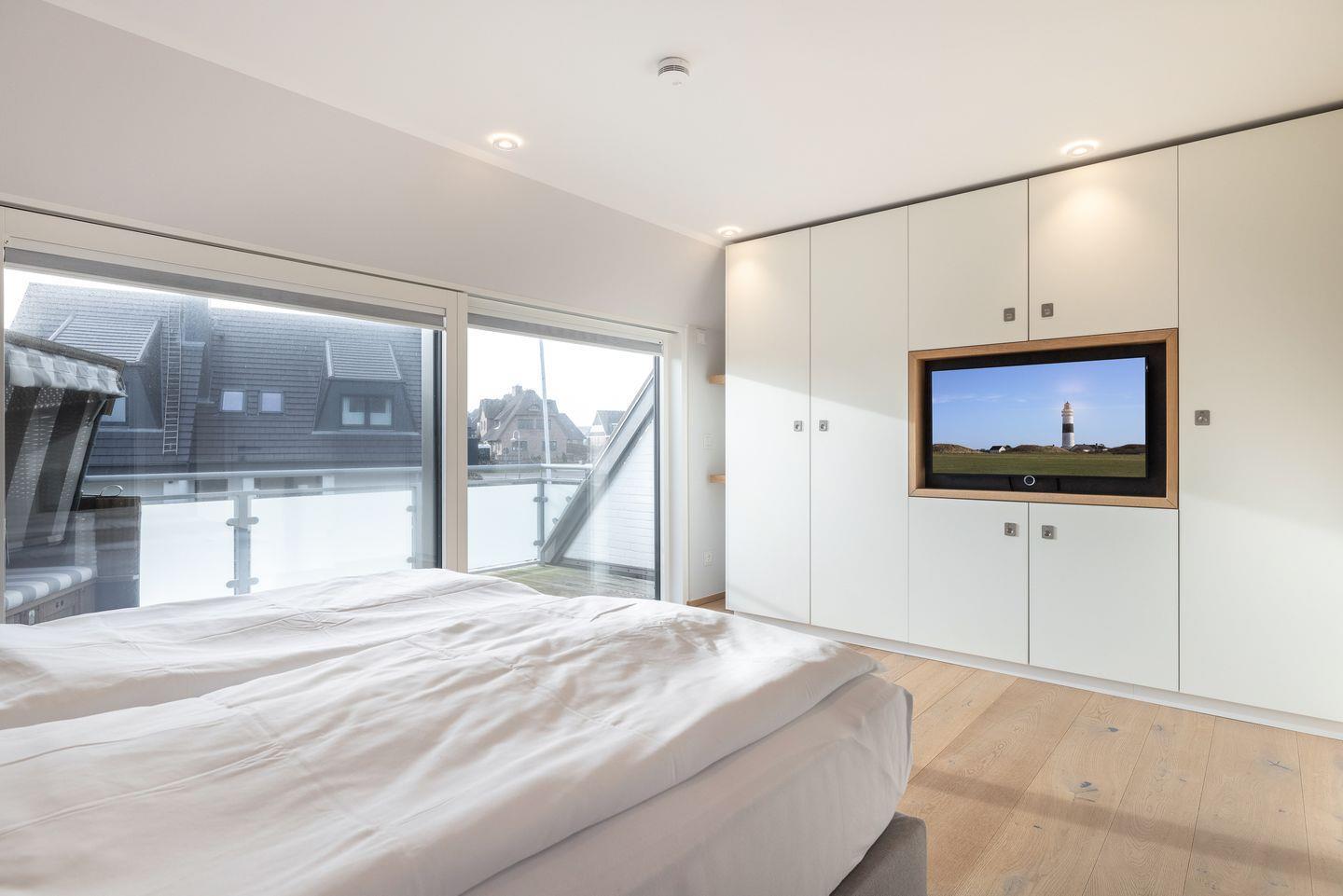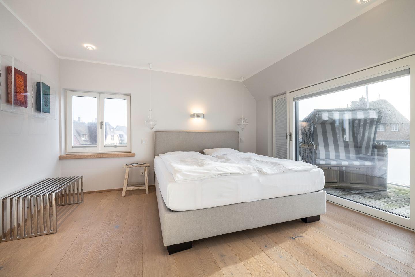 OG: ein Schlafzimmer mit Doppelbett (2x90x200cm) und Loewe-TV, Balkon mit Strandkorb (April-Oktober), 2 Duschbäder